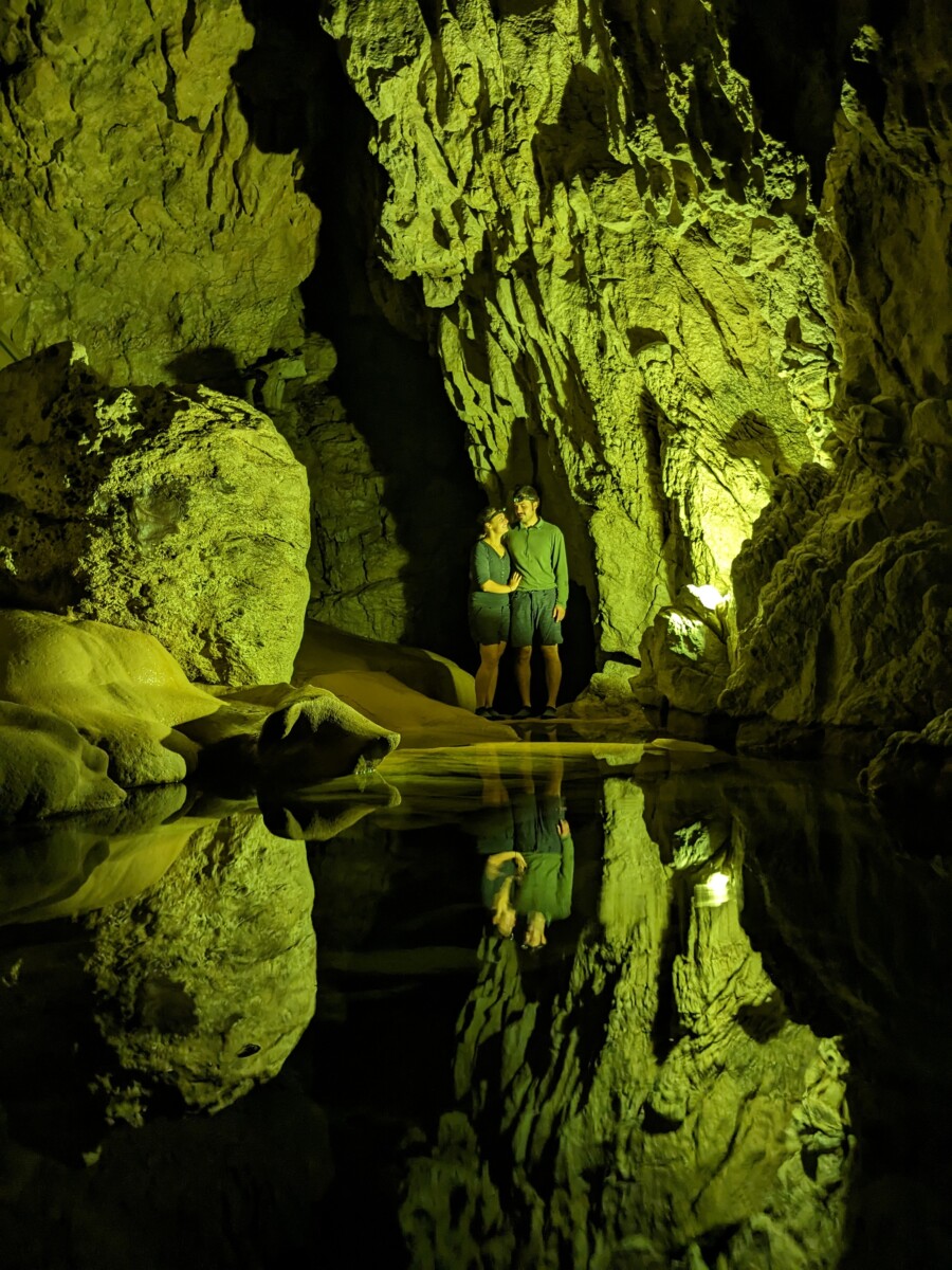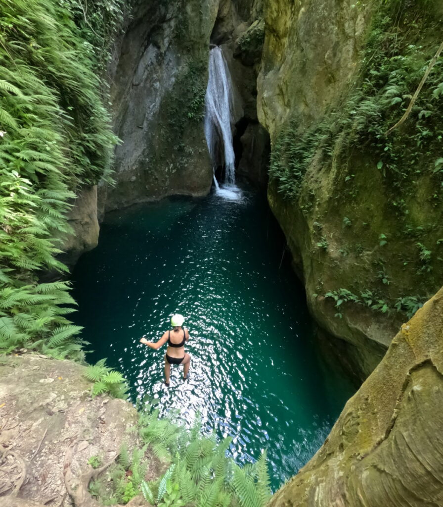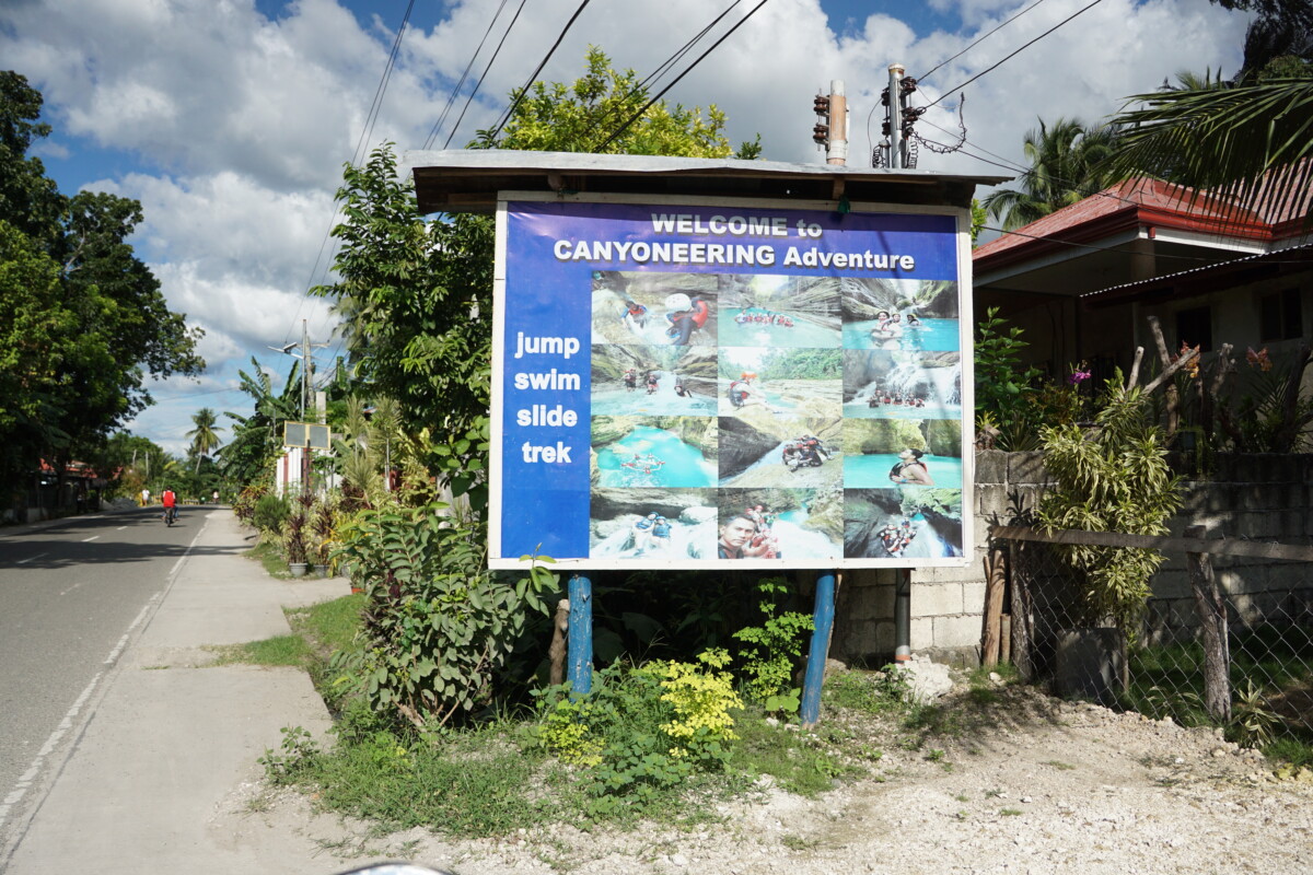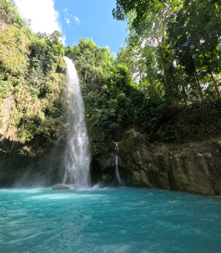 Da wir nur 3 Nächte, also 2 volle Tage in Moalboal haben, ist wieder straffes Programm angesagt: Roller mieten und auf zur nächsten Wasserfalltour, denn der Süden der Insel Cebu ist bekannt für seine schönen Wasserfälle. Bei einigen davon wird sogar Canyoning angeboten, speziell bei den Kawasan-Falls, wir haben uns jedoch dagegen entschieden, da dort massenweise koreanische Touristen durchgeschleust werden. Stattdessen ging es für uns zum Kabutongan Fall. Dort angekommen waren wir ganz alleine, nur eine Frau zum „Eintritt kassieren“, ihre Kinder und ein Guide waren da. Patrick wollte ja den Canyon auf eigene Faust erkunden, sie bestanden aber darauf, dass ein lokaler Guide verpflichtend sei. Wir ließen uns dann doch zu einer „Semi-Canyoneering“ Tour überreden, nachdem wir wieder um den Preis hart verhandelt haben (6,50€ oder 400 Pesos). Irgendwie nervt es, wenn es keine fixen Eintrittskosten gibt, sondern sie irgendeinen beliebig hohen Preis ansagen, man dann aber doch mit fast der Hälfte davon durchkommt. Semi-Canyoneering deshalb, da es bei dieser Schlucht von unten nach oben geht (und wieder zurück), ohne dass man Abseilen muss. Helme und Schwimmwesten gab es zum Ausleihen, wobei die Helme beim ersten Reinspringen schon nicht mehr am Kopf waren, da die Schnalle kaputt war, naja. Unser sicher bestens ausgebildeter Guide führte uns dann durch die wirklich schöne Tropenschlucht zum letzten Wasserfall, wo auch ein Sprung in den wunderbaren Gumpen möglich war.