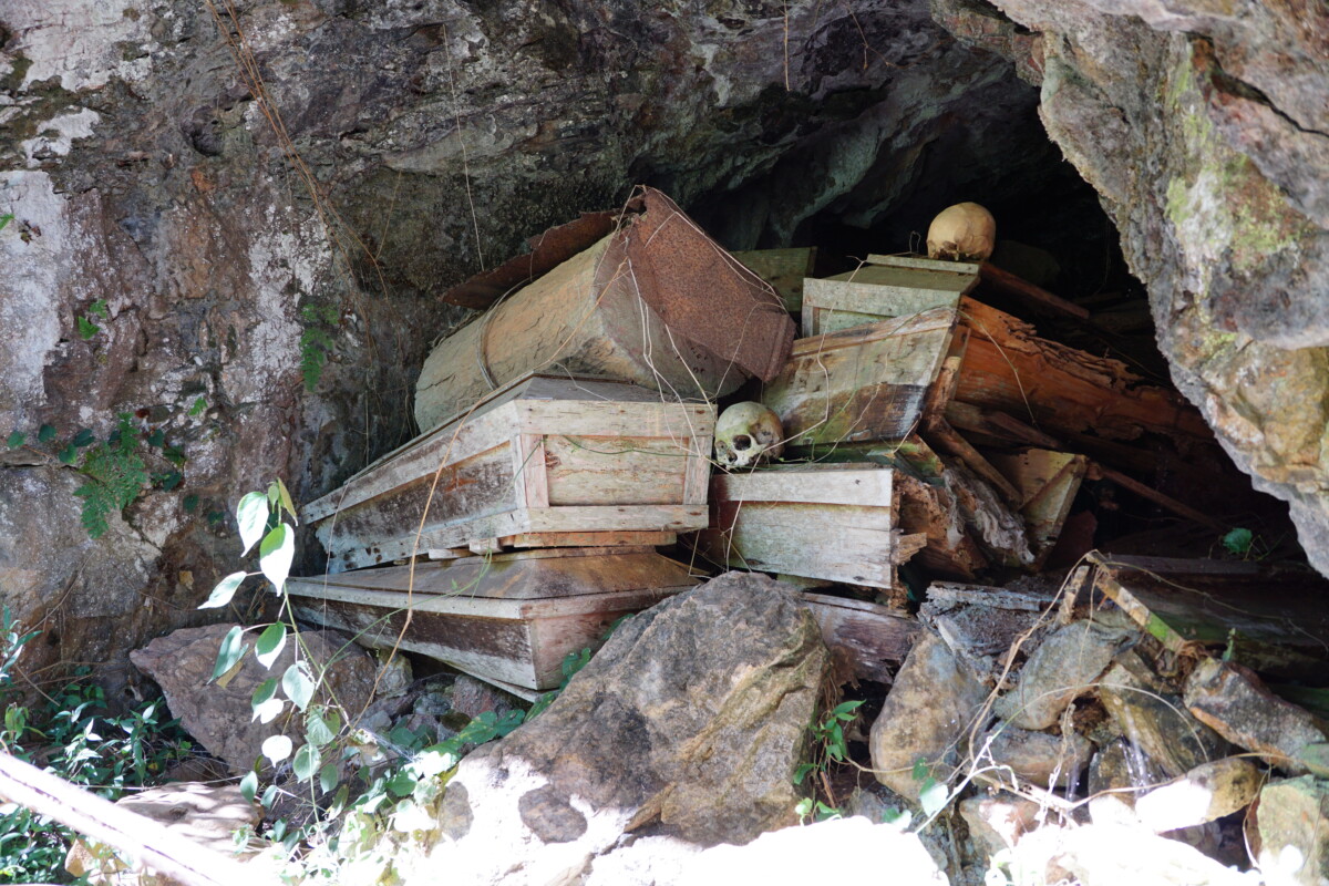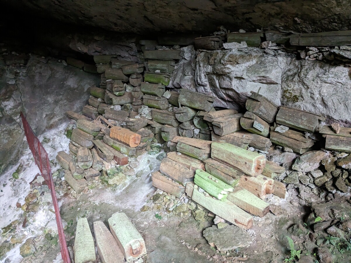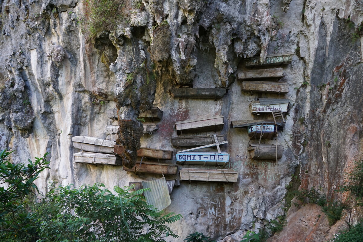 Da Sagada auf 1600m liegt, ist das Klima deutlich angenehmer als in der Küstenregion, ja es kann sogar ziemlich kalt werden in der Nacht. Aber wir genossen die kühle Bergluft, und den ersten Tag erholten wir uns von den Reisestrapazen. Einer der Hauptgründe, warum wir nach Sagada wollten, sind die „Hanging Coffins“, also die hängenden Särge. Bei dieser Bestattungsart wurden die Särge wichtiger Persönlichkeiten vom hiesigen Stamm der Kankanaey in Felswänden aufgehängt, damit deren Geist näher am Himmel ist und über andere wachen kann. Gebräuchlicher allerdings war, dass die Särge in Höhleneingängen gestapelt wurden. Bei einer geführten Tour konnten wir beides bestaunen, und erfuhren auch, dass diese Bestattungsmethoden von der Regierung mittlerweile aus hygienischen Gründen nicht mehr erlaubt sind, der letzte Sarg wurde 2010 aufgehangen.
