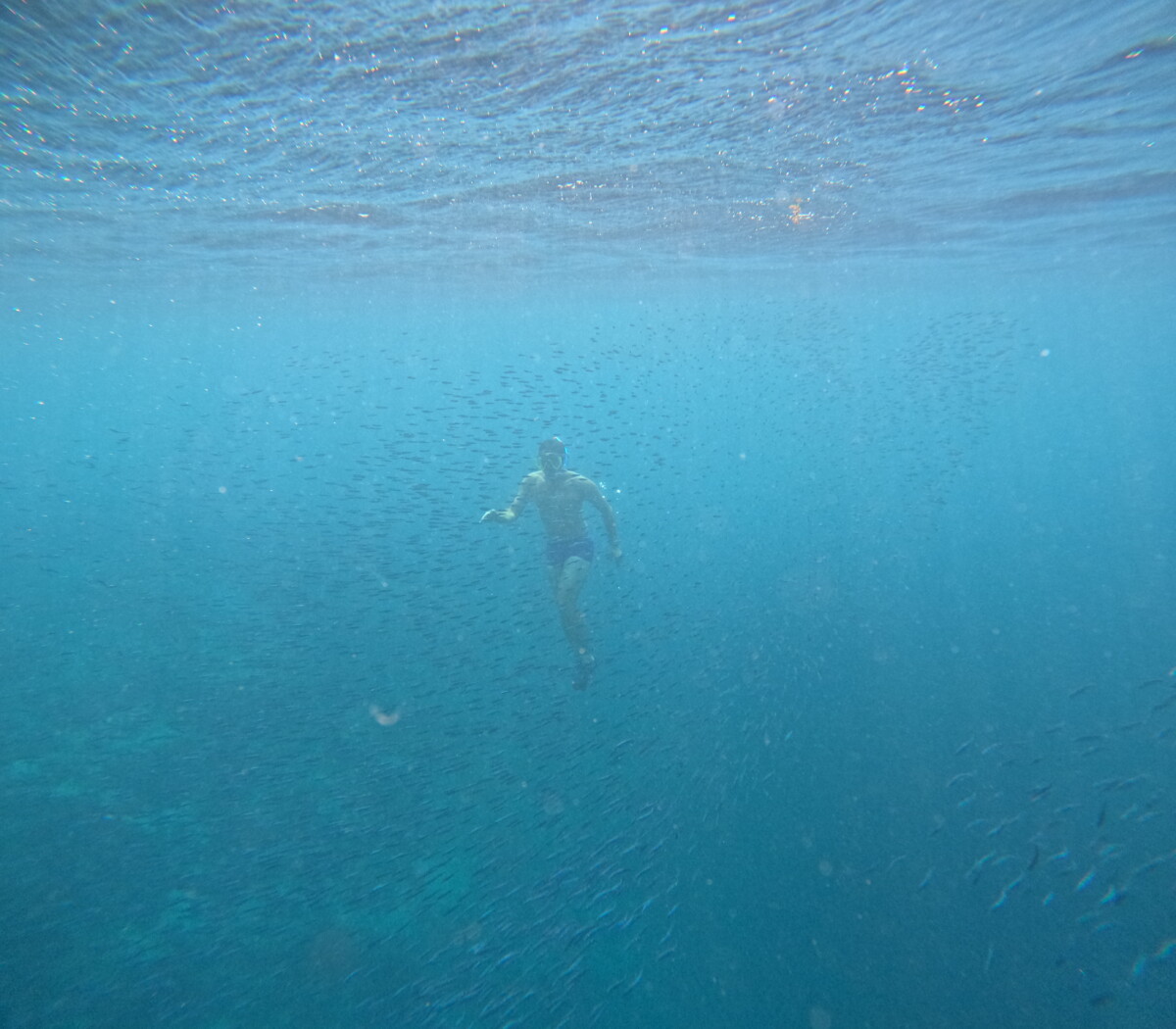 Wie im letzten Beitrag schon angekündigt, schafften wir es nach Moalboal, indem wir von Anda mit sage und schreibe 3 Tricycles, einem Bus, einem Van, einer Fähre und einem Taxi fahren mussten. Gedauert hat der „Spaß“ eh nur fast 12h, da wir alle Anschlüsse super erwischten. Am nächsten Morgen ging es sogleich zum Strand, um mit den Sardinen um die Wette zu schwimmen. Auf dem Hinweg versuchen bereits viele Verkäufer uns eine überteuerte Schnorchelausrüstung zu verleihen, wir haben zum Glück ein Set dabei. Am Strand bietet uns dann ein französisches Pärchen an, dass wir von ihnen ein zweites leihen können, was wir dankend annehmen! Nur etwa 50m vom Ufer fällt das Korallenriff ab, und dort ziehen riesige Sardinenschwärme vorbei. Wenn man sich beim Abtauchen nähert, ändert sich die Schwarm-Formation nach einer ganz eigenen Dynamik. Es ist schon ein einmaliges Erlebnis, mitten durch so einen Schwarm von abertausenden Fischen durchzutauchen! Aber es kommt noch besser: eine Meeresschildkröte schwimmt vorbei, wir kommen ihr fast zum Angreifen nah. Wir „verfolgen“ sie einige Minuten, es scheint sie überhaupt nicht zu stören… Toll!