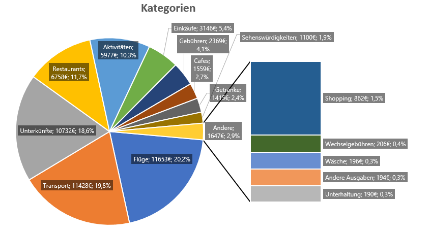 Da wir jede einzelne Ausgabe, egal ob bar oder per Kartenzahlung, in der App „TravelSpend“ eingegeben und kategorisiert haben, konnten wir die laufenden Kosten im Überblick behalten und jetzt rückwirkend auch detaillierte Auswertungen machen. Dazu habe ich alle 1925 eingespeicherten Datensätze in Excel importiert, Datenfehler bereinigt (z.B. noch falsches Land zugeordnet) und mit Pivot-Tabellen ausgewertet.