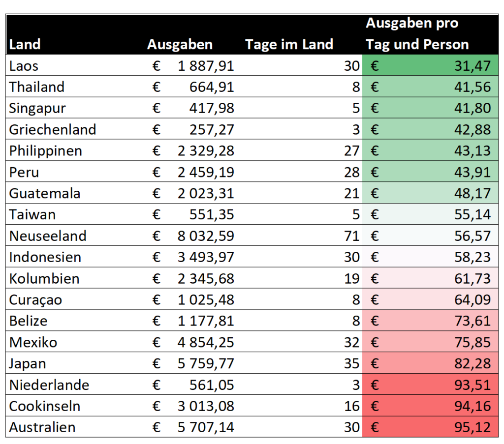 Die obenstehende Tabelle zeigt, wieviel wir pro Land ausgegeben haben. Um mehrere Länder vergleichen zu können, muss man natürlich die Ausgaben in Relation zur Aufenthaltsdauer setzen. Die letzte Spalte zeigt die durchschnittlichen Kosten pro Tag und Person. Internationale Flüge (also zwischen zwei unterschiedlichen Ländern) wurden in diesen Zahlen ausgenommen, um die Statistik nicht zu verfälschen. Kurze Aufenthalte (nur wenige Tage) wie in Athen, Amsterdam oder Taiwan sind natürlich weniger aussagekräftig als Langzeitaufenthalte (z.B. 2 Monate in Neuseeland).