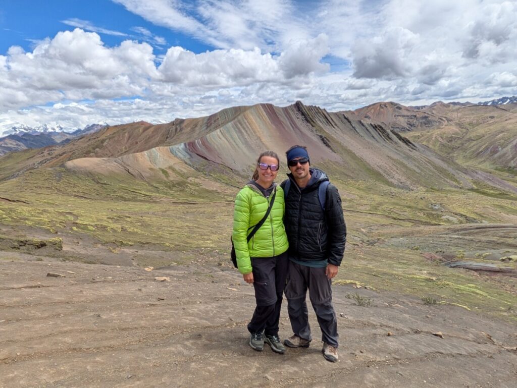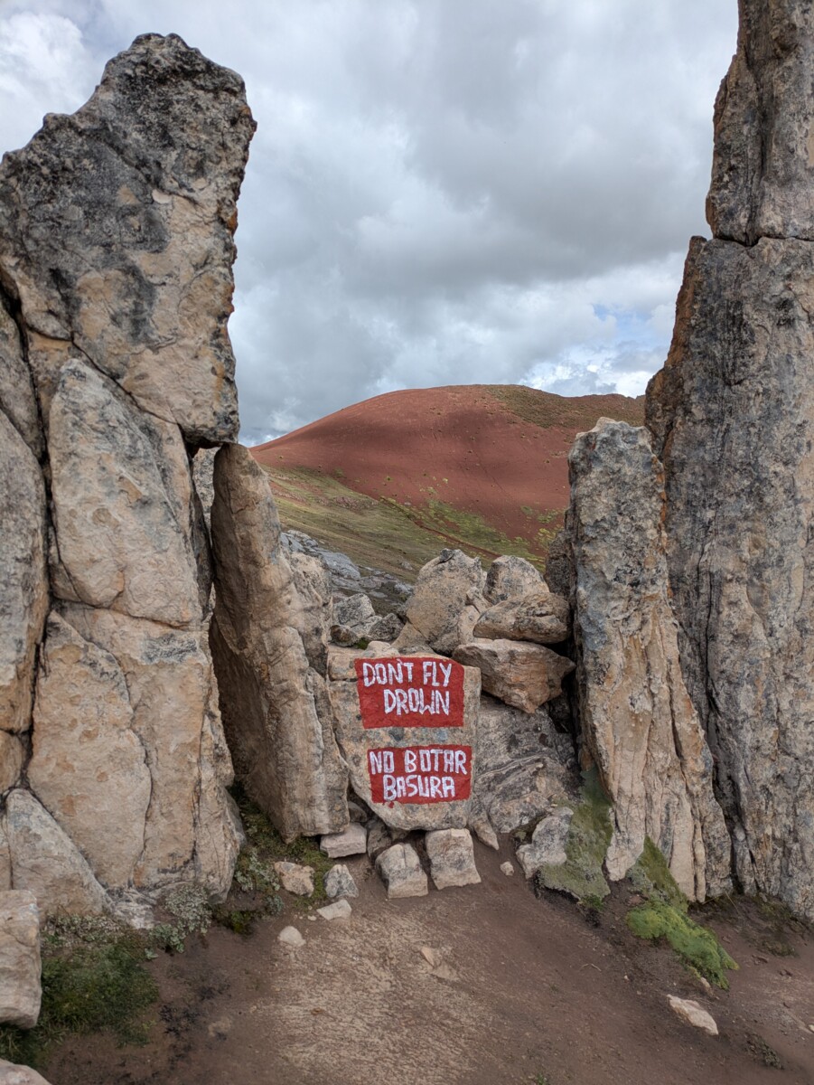 Schon die lange Anfahrt durch die spektakuläre Landschaft, vorbei an winzigen Andendörfern mit einfachen Lehmhütten zahlte sich aus. Der Bach, der durch das Tal fließt, weist eine rote Farbe auf, wahrscheinlich wegen dem rötlichen Gestein der Berge. Nach kurzer Wanderung standen wir dann inmitten mehrerer Rainbow Mountains, die ihren Namen den bunten Streifen verdanken, die von diversen mineralischen Ablagerungen herrühren. Ich spürte wieder einmal extrem die Höhe und war ziemlich matt, wir waren nämlich schon wieder auf knapp unter 5000 Metern unterwegs. Jetzt sind wir schon fast 14 Monate unterwegs und haben bereits extrem Vieles sehen und erleben dürfen, aber anscheinend gibt es immer wieder etwas Neues zu entdecken. Diese merkwürdige Berglandschaft versetzte uns nur noch ins Staunen! Mit dem Wetter hatten wir Glück, es war nur leicht bewölkt und teilweise kam sogar die Sonne durch!