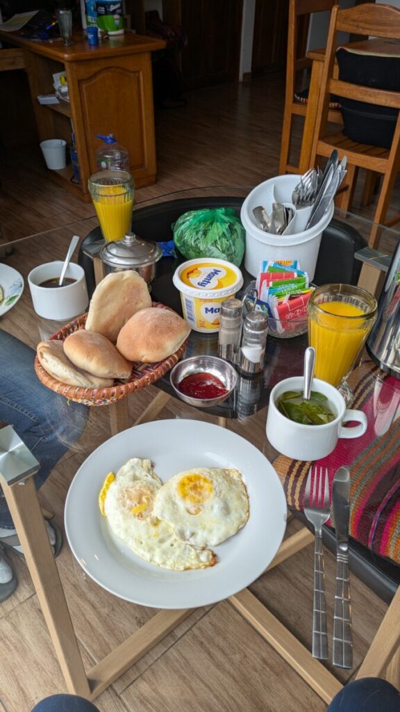 - Überall gab es das gleiche Frühstück: 4 Brote, 1 Spiegel- oder Rührei, Butter, Erdbeermarmelade, Fruchtsaft und Tee/Kaffee