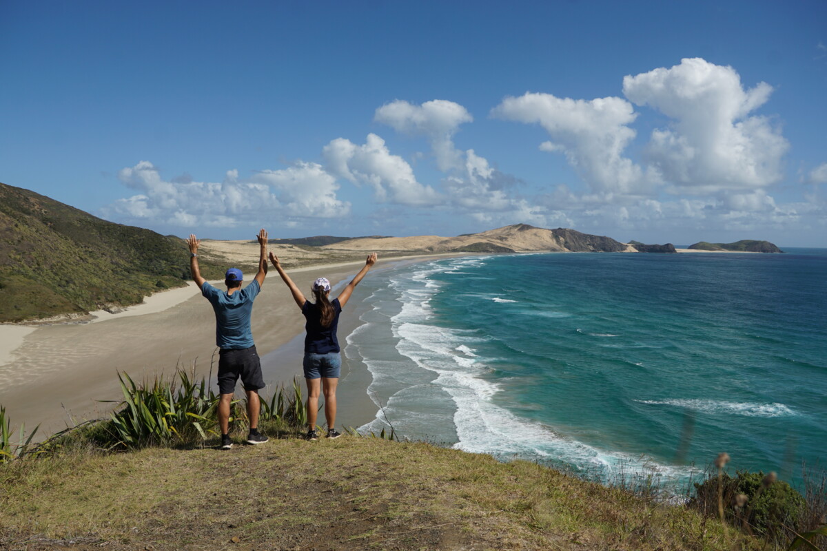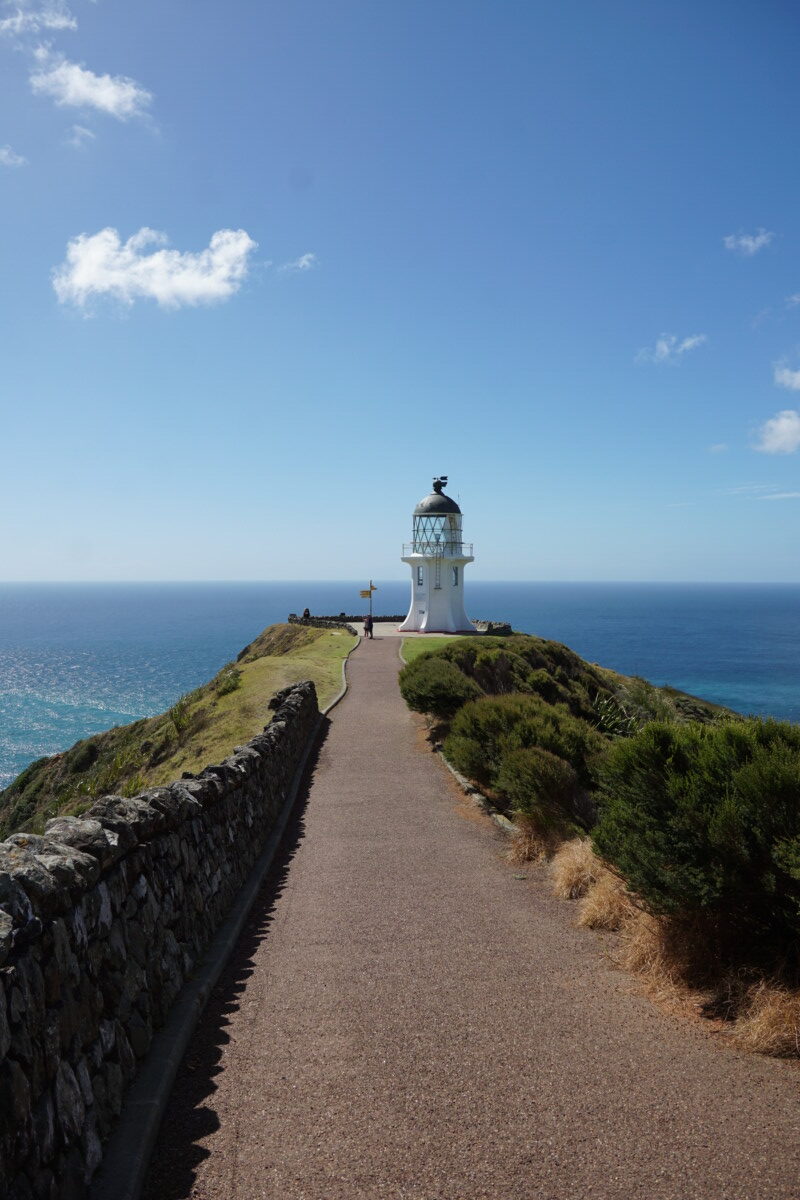 Die weiteren Tage waren wir dann vorsichtiger mit dem nächtlichen Aufladen der Handys und der Kühlbox und wir nahmen uns vor, uns bei nächster Gelegenheit ein Starterkabel zuzulegen. Die Reise ging dann an den nord-westlichsten Punkt Neuseelands, zum Cape Reinga. Dort gibt es einen Leuchtturm mit unglaublicher Aussicht auf die sich mit dem Pazifischen Ozean vereinigende Tasmansee. Wir sind dann in einer halbstündigen Wanderung über einen Klippenpfad bis zu einem wunderbaren Strand hinunter gewandert, wo wir komplett alleine waren.