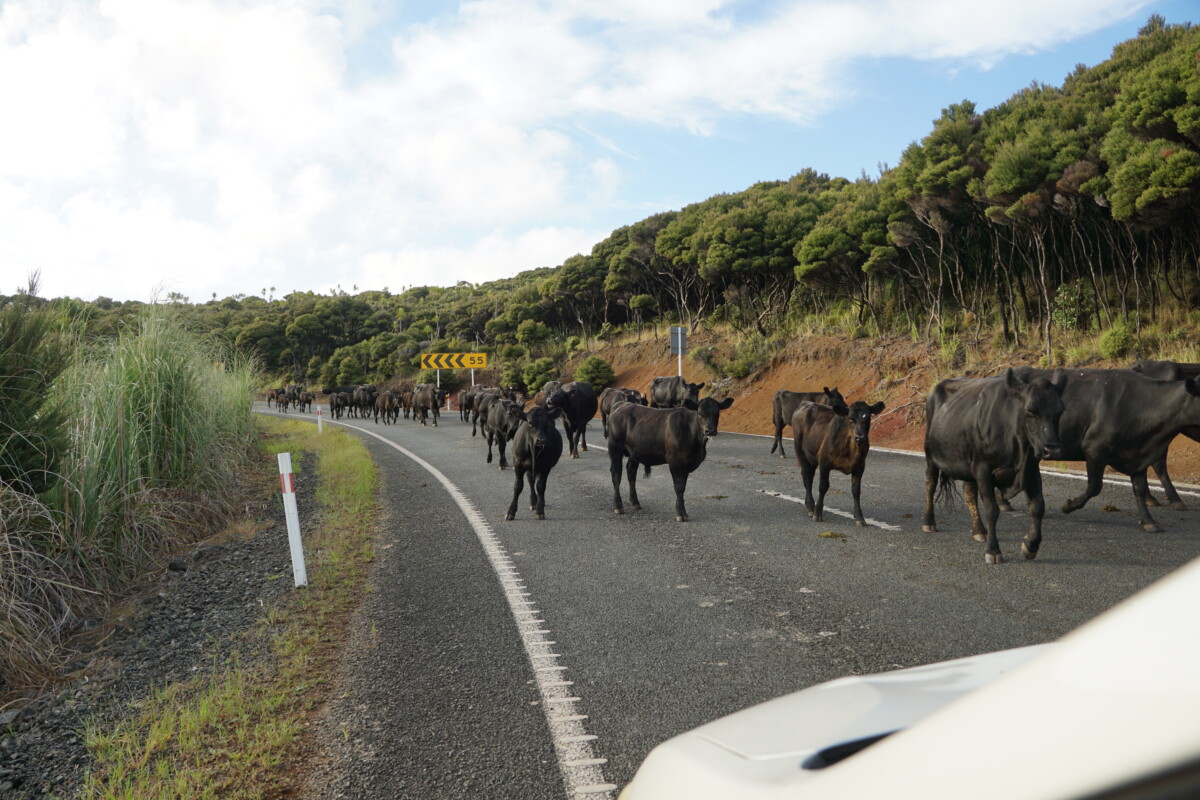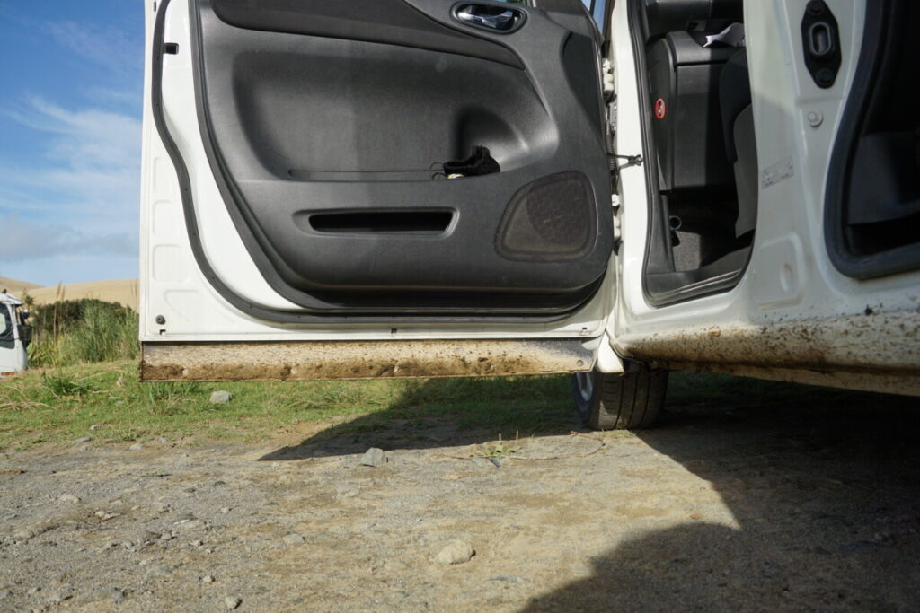 Am nächsten Tag nahmen wir uns die Besichtigung der „Te Paki Giant Sand Dune“, also einer riesigen Sanddüne, vor. Auf dem Weg dorthin kamen wir in eine Kuhherde mit geschätzt mehreren hundert Kühen und genau einem (!) Schaf 😂, die auf der Straße von Fahrzeugen und Hunden getrieben wurde. Als wir am Parkplatz ankamen und ausstiegen, stank es fürchterlich und wir sahen, dass das Auto auf der Seite, in den Kotflügeln und der komplette Unterboden mit frischem Kuhmist bedeckt war…