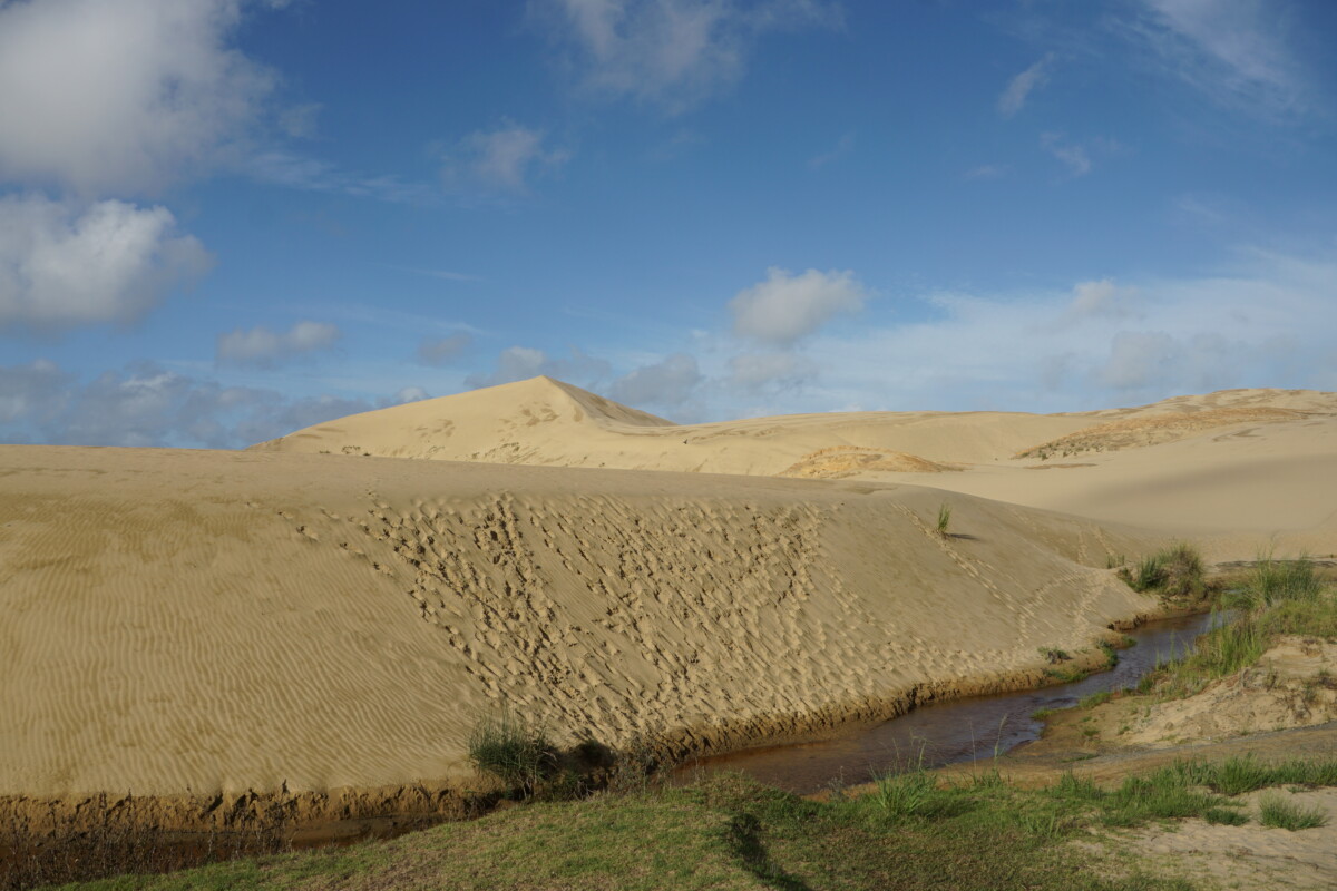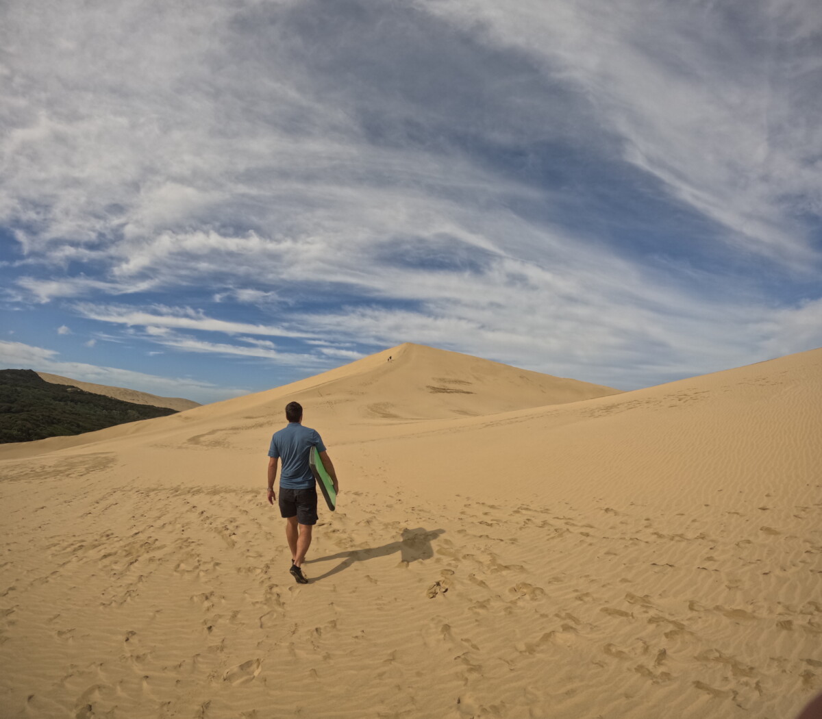 Wir haben ja schon im Vorfeld gelesen, dass man von diesen bis zu 150m hohen Dünen mit einem Brett herunter surfen kann, aber uns keine weiteren Gedanken dazu gemacht. Dort angekommen stand bereits ein Wagen da, an dem man sich Boards zum Hinunterrutschen ausleihen kann (15 NZ$). Das machten wir sogleich und machten uns auf den Weg zum Gipfel der größten Düne, den wir in ca. 15 Minuten erreichten. Eine unglaubliche Landschaft, wie mitten in der Sahara kommt es einem vor. Wir legten uns laut Anleitung auf die Bretter und düsten den Sandhang mehrmals hinunter. Es war wirklich eine sehr spaßige Aktion, aber da man beim Hochstapfen durch den Sand immer einen halben Schritt zurückrutscht, ist es auch ziemlich anstrengend. Außerdem ist man nach kurzer Zeit komplett sandig, und komplett heißt: Sand in den Augen, Sand in den Haaren, Sand in der Ritze, … Dusche gab es danach leider keine, nur einen winzigen Bach mit wenig Wasser.