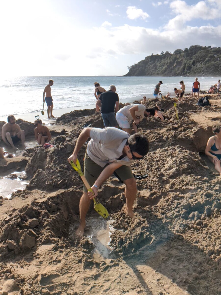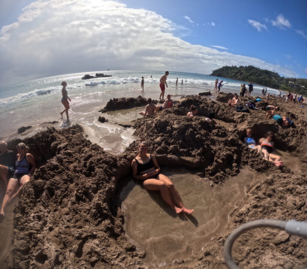 Das Wetter war die letzten Tage ziemlich wechselhaft und regnerisch, deshalb blieben wir gestern einfach in Coromandel Town und gingen gut essen. Da gibt es nämlich eine riesige Miesmuschelart, die Grünlippmuschel, die es nur in Neuseeland gibt. Wir bestellten einen 1 kg Topf für uns beide, und es war wirklich eine Delikatesse! Heute fuhren wir direkt zum Hot Water Beach, der seinem Namen wirklich alle Ehre macht. Hier kann man etwa 2 Stunden vor- und nach der Ebbe Löcher graben am Sandstrand, welche sich mit bis zu 65°C heißen Thermalwasser füllen. Bis dann die Flut kommt und alle Löcher wieder auffüllt. Die Schaufeln oder Spaten kann man sich im Ort ausleihen oder man fragt einfach Leute die schon fertig mit dem Buddeln sind. Unser gegrabenes Loch war fast zu heiß – wir mussten immer kaltes Meerwasser holen, damit wir uns nicht unsere Allerwertesten verbrannten!