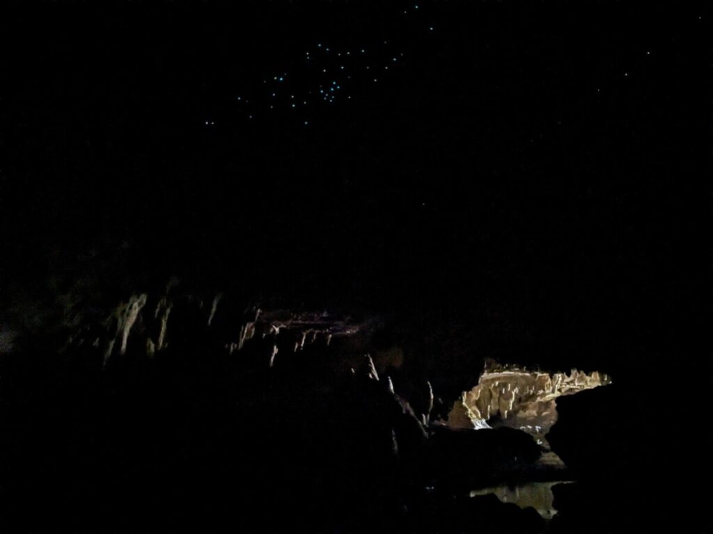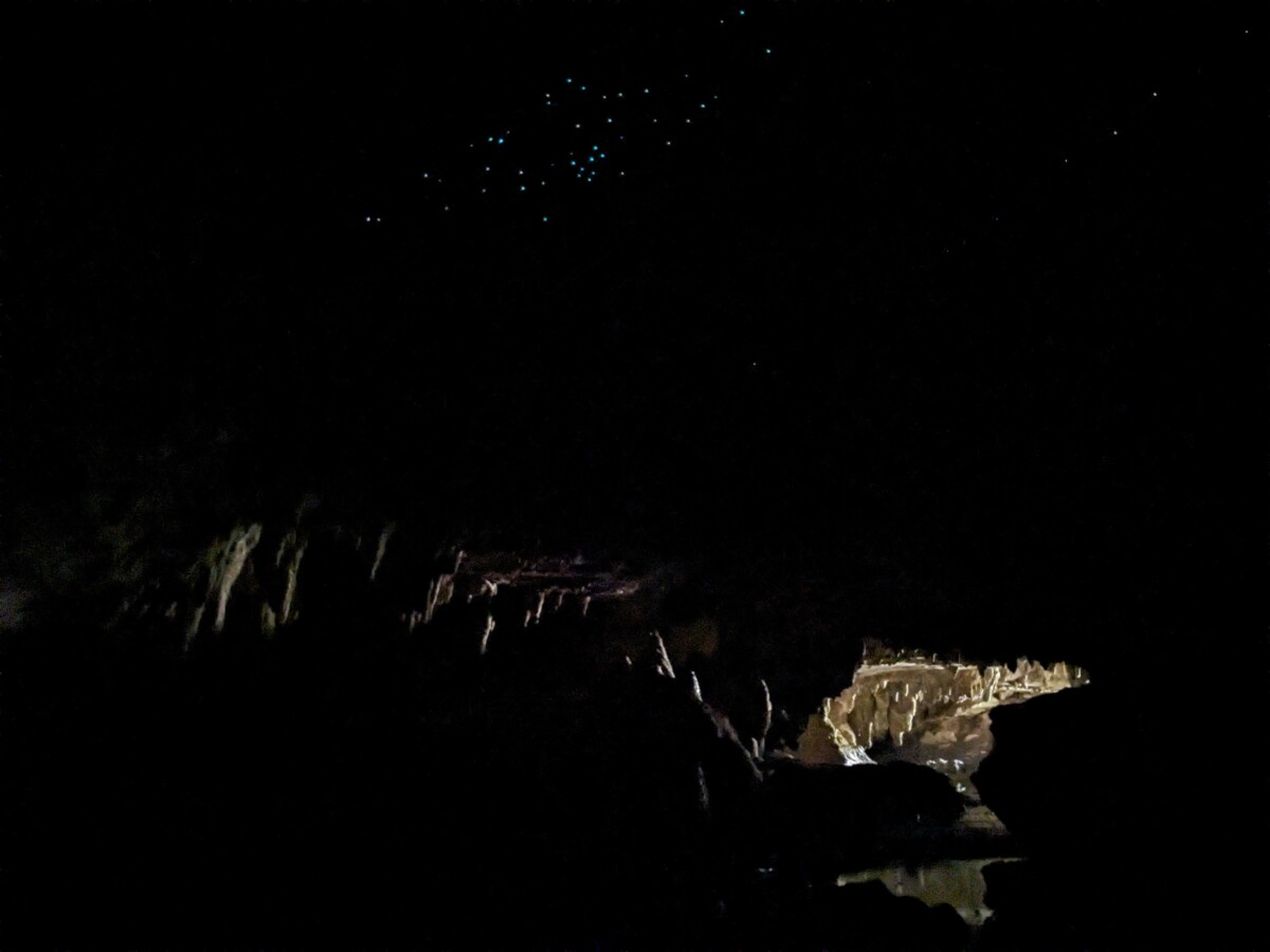 Ebenfalls sehr bekannt für Neuseeland sind die Glühwürmchen-Höhlen. Es sind zwar eigentlich die ekligen Larven, die biolumineszierend sind und so toll leuchten, aber da wollen wir nicht kleinlich sein. Natürlich wollten auch wir dieses Phänomen live zu sehen bekommen, aber die bekannten Waitomo Caves kosten unglaubliche 42€ Eintritt pro Person. Das ist dann doch etwas viel für eine 45-minütige Tour! Nach kurzer Internet-Recherche fand Patrick heraus, dass es ganz in der Nähe die Waipu Caves gibt, die ebenfalls bekannt für die Glühwürmchen sind. Und ratet mal, wie viel der Eintritt kostet? Richtig: Gar nichts. Einfach Stirnlampe aufsetzen, 50m in die Höhle rein gehen und einen wunderbaren „Sternenhimmel“ erleben mitten am Tag. Zuerst waren doch einige Leute gleichzeitig mit uns in der Höhle, aber wir kletterten tiefer hinein und waren dann sogleich alleine. Als wir nach mehreren gescheiterten Fotografier-Versuchen wieder weiter raus gingen, waren wir ganz alleine. Eine echt interessante und schöne Erfahrung! Eine ebenfalls interessante, aber unschöne Erfahrung machten wir kurze Zeit später, als wir von einer Polizeistreife mit Blaulicht verfolgt wurden. Patrick fuhr links ran und wir erfuhren von dem freundlichen Polizisten, dass wir 14 km/h zu schnell bei einer 50er Zone gefahren sind. Nach Aufnahme der Personalien und Adresse sagte der Polizist, dass die Rechnung von 80$ (45€) per Post nach Österreich geht und Patrick 20 Strafpunkte in Neuseeland hat. Bei 100 Punkten ist der Führerschein weg. Ok, na dann… Weiter geht’s!