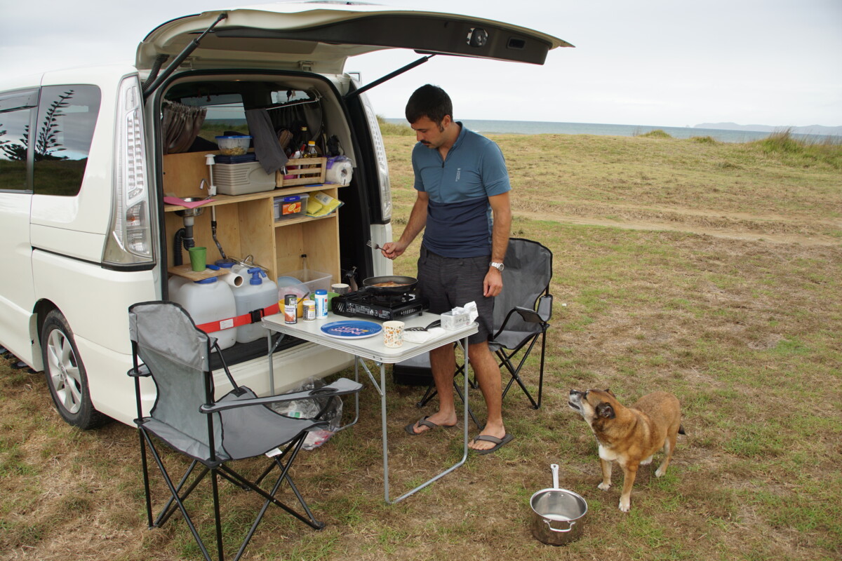 Das Wetter wurde leider immer wechselhafter nach den sehr sonnigen Tagen in Auckland. Wir hatten noch einige Besorgungen zu machen, wie Lebensmittel einzukaufen oder das Geschirr zu waschen, bevor wir abends (wieder Parkplatz am Strand) das erste Mal kochten. 5-Gänge Menü wird es wohl keines geben in Zukunft, da wir nur einen Gas-Griller mit Topf und Pfanne haben, aber für Curry, Nudeln und Steak mit Bratkartoffeln hat es schon gereicht. Weiters statteten wir unser neues Gefährt mit einer Kühlbox, einem Handyhalter und einem Campingtisch aus. Wir bekamen den Tipp, für eine heiße Dusche in die öffentlichen Schwimmbäder zu gehen, da diese günstig sind und oft auch Whirlpools und Sauna haben. Das machten wir vorgestern und für 7,50$ (4,30€) p.P. bekamen wir das alles geboten! Warum gibt es das in Tirol nicht mehr?