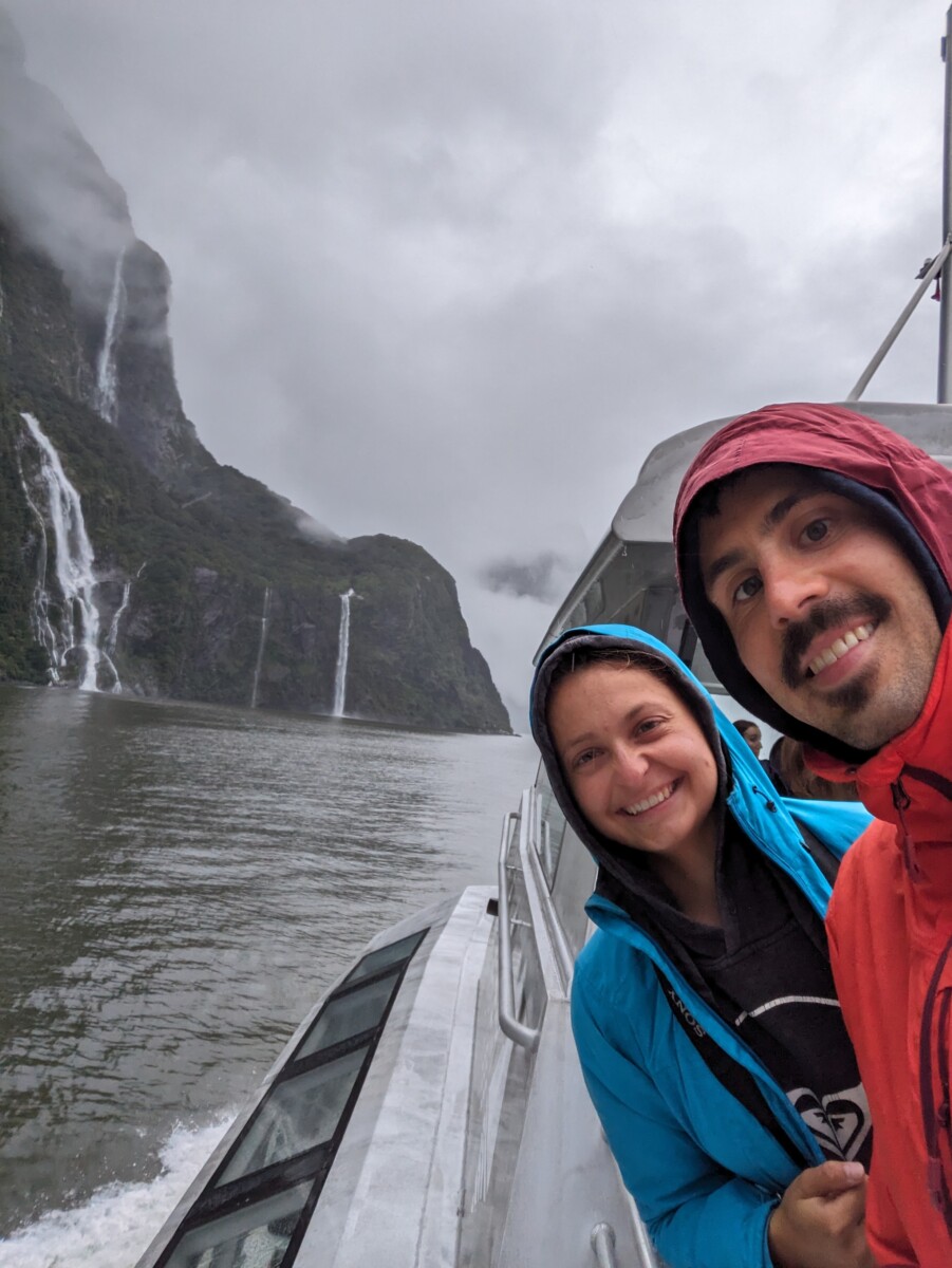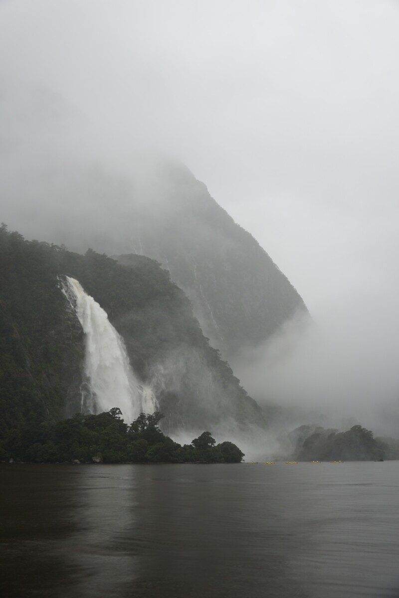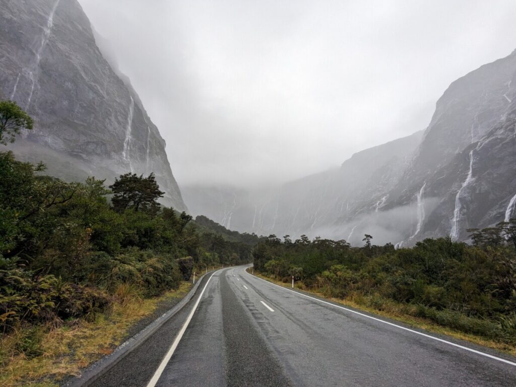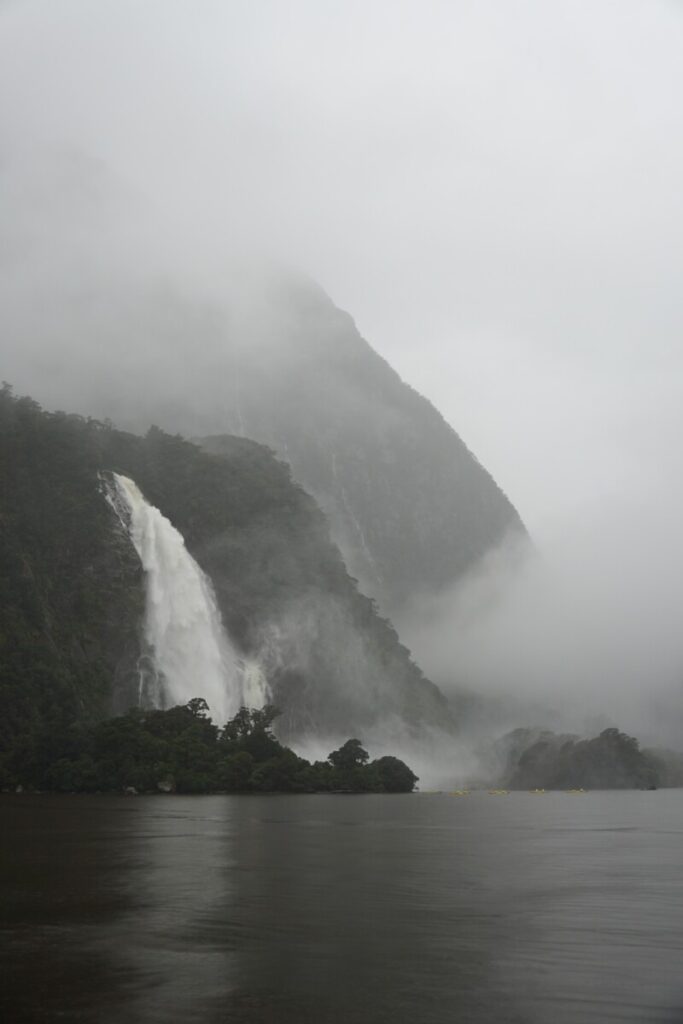 Tags darauf nahmen wir uns vor, endlich das Auto online zu inserieren, das wir ja Ende April wieder loswerden wollen. Wir verbrachten den Tag in Lumsden, wo ein sehr netter Stellplatz ist, der wie ein alter Bahnhof angelegt ist, es stehen sogar zwei alte Züge da. Der Wecker ging dann um schon um 5 Uhr, weil wir die ganze Strecke von fast 200 km bis zum Milford Sound zurücklegen mussten. Dort machten wir das, weswegen jeder den weiten Weg hierher auf sich nimmt: eine Schiffsfahrt durch den Milford Sound, der eigentlich kein Sound, sondern ein Fjord ist. Die Wettervorhersage stimmte, es schüttete wie aus Kübeln. Aber wir hatten gelesen, dass das Erlebnis bei Regen nur umso eindrucksvoller sei, denn unzählige kleine Wasserfälle gesellen sich zu den Großen. Und es stimmte, die mystische Atmosphäre machte die zweistündige Bootstour wirklich kurzweilig. Der Milford Sound ist eine der regenreichsten Gebiete der Erde, im Schnitt 7 m pro Jahr! Im Amazonas-Regenwald dagegen regnet es nur bis zu 3 m pro Jahr, wow! Die Rückfahrt durch das Tal ist wieder atemberaubend, an den fast senkrechten, an den in Regenwolken verschwindenden Wänden stürzten sich hunderte Wasserfälle herunter.