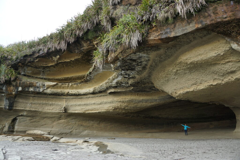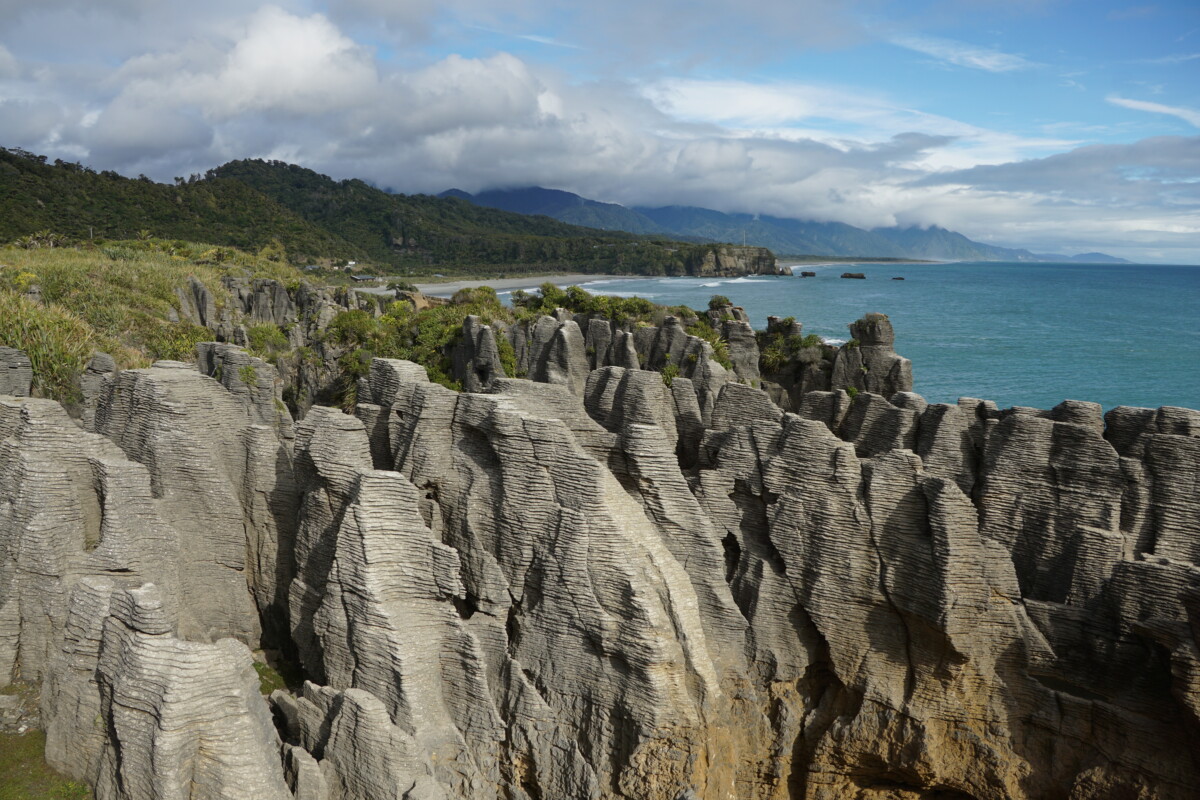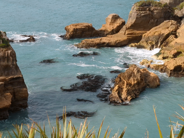 Die Wettervorhersage für die berühmten Pancake Rocks („Pfannkuchen-Felsen“) war für den nächsten Tag so schlecht, dass wir uns beeilten, noch am gleichen Abend dort vorbeizufahren. Die Entfernung dorthin von der Stadt Greymouth sind eh nur knapp 50 Kilometer durch Niemandsland an der Küste, also quasi ein Katzensprung in Neuseeland. Die Fahrt lohnte sich – die geschichteten Gesteins-Türme, deren Entstehung wissenschaftlich noch nicht geklärt ist, erinnern wirklich an gestapelte Palatschinken. Das Geräusch, wenn die Wellen in die unterhölten Felsformationen donnern, klingt wie eine gedämpfte Explosion oder eine Lawinensprengung. Eine weitere Sehenswürdigkeit auf dem kurzen Rundweg waren die „Haare der Riesenmeerjungfrauen“: Sogenanntes Bull Kelp (eine bis zu 40m lange Algenart) schwimmt auf der Wasseroberfläche, und die Wellenbewegungen lassen die Seetang-Bündel wirklich wie schwimmendes Kopfhaar aussehen.