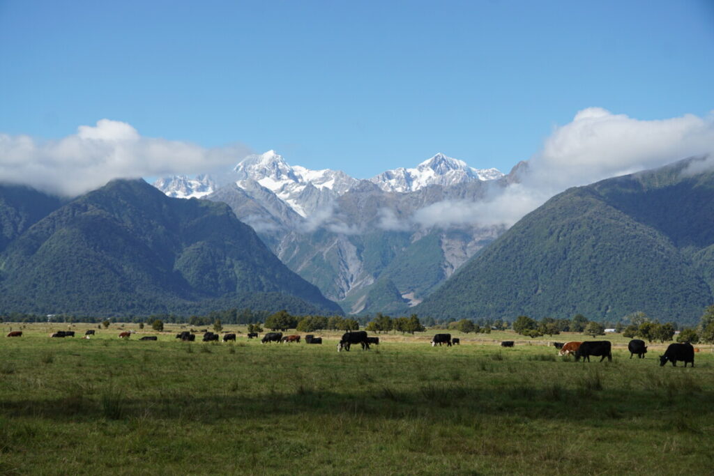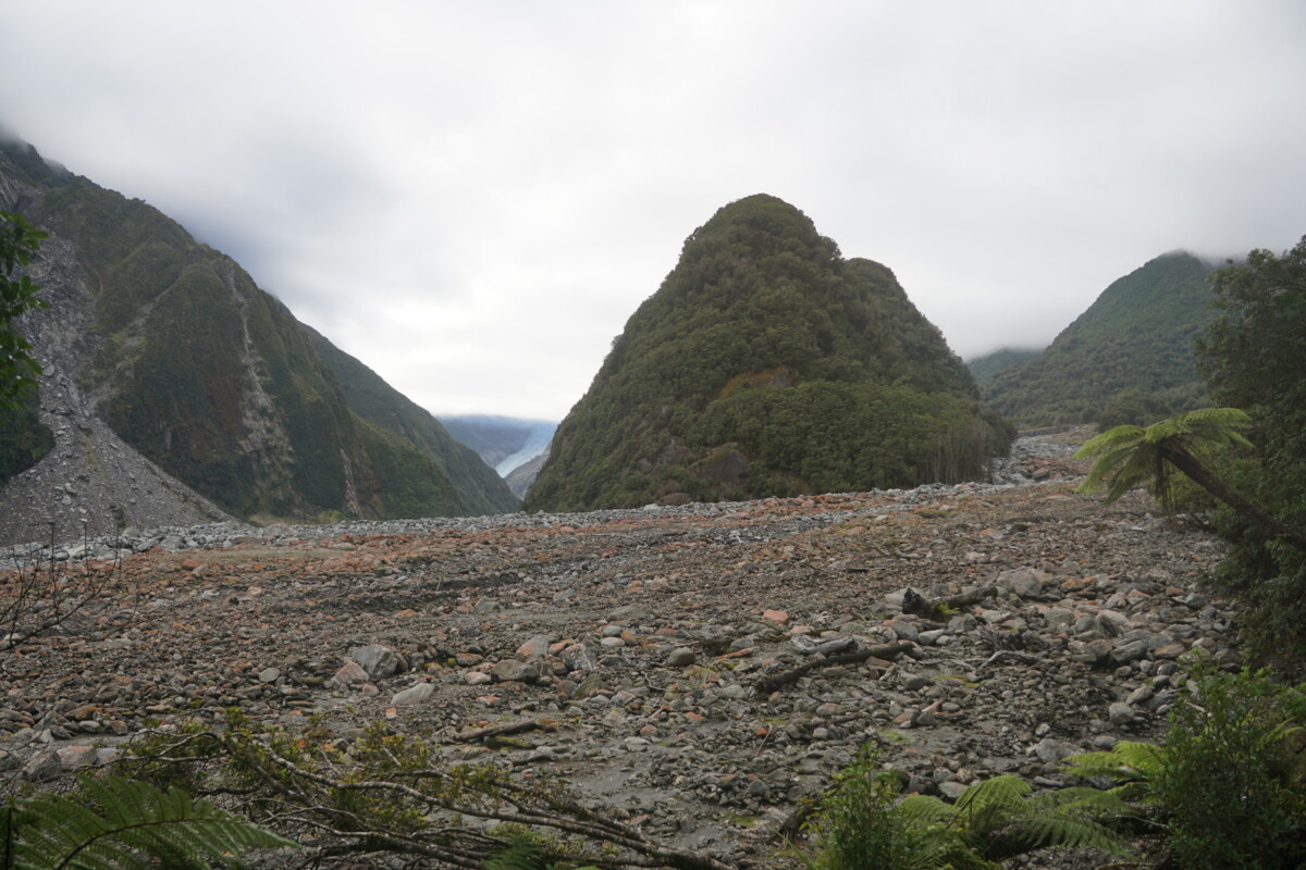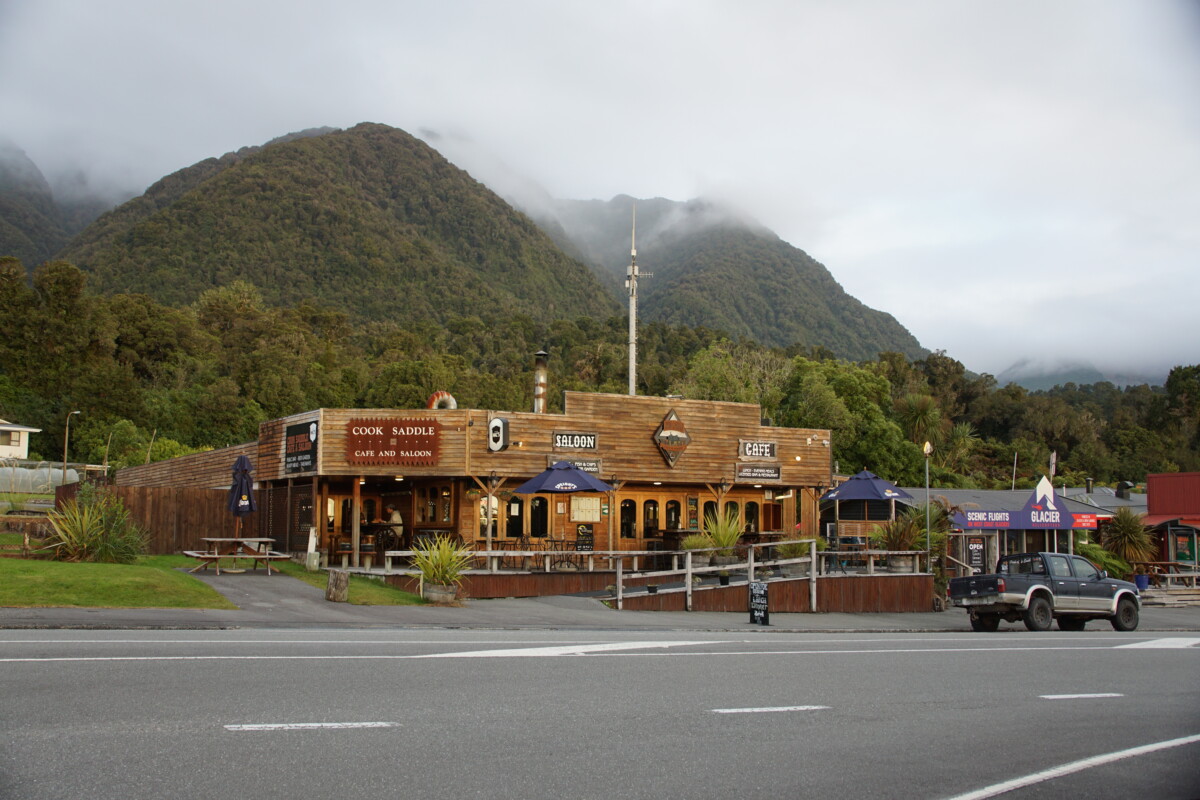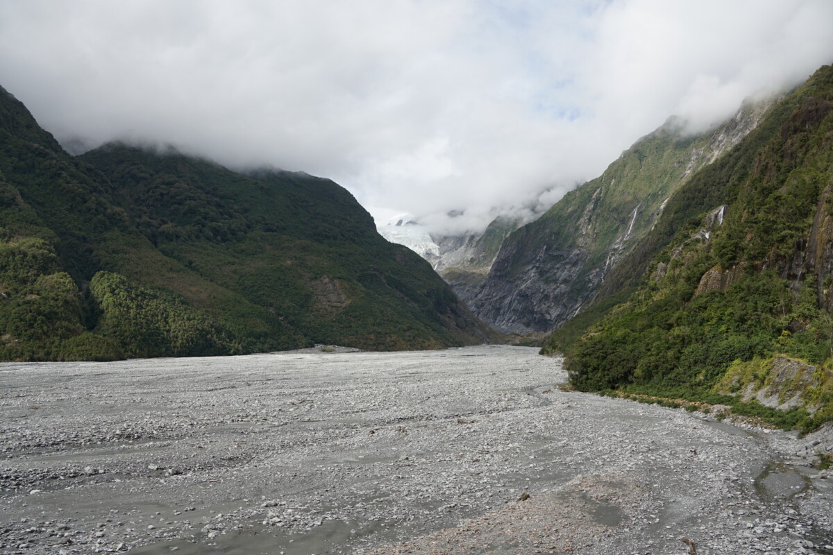 Es ging weiter die Westküste hinunter in das Gletschergebiet. Laut unserem Reiseführer-Buch gibt es weltweit nur drei Gletscher, die bis in den Regenwald hinunterreichen, und zwei davon sind in Neuseeland (der Dritte in Argentinien). Der kurze Spaziergang zum offiziellen Aussichtspunkt auf den Franz-Josef-Gletscher war dann irgendwie etwas enttäuschend, da man nicht annähernd zur Gletscherzunge hinkommt, sondern diese aus mehreren Kilometern Entfernung bewundern muss. Als Alternativen gibt es nur eine längere Wanderung zum sogenannten Roberts Point oder einen teuren Helikopter-Rundflug. Erstere Option machten wir nicht, weil es leider sehr wolkig war und Zweitere aus budgetären Gründen nicht 😉