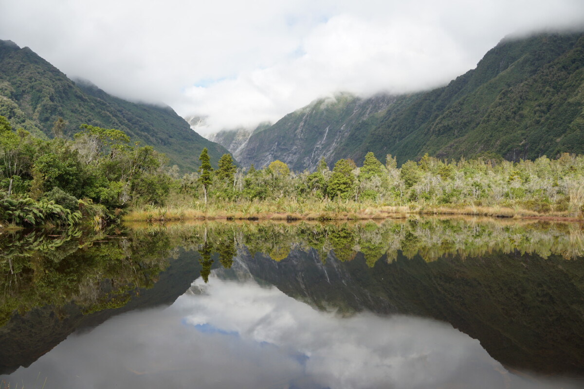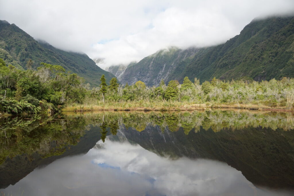 Das Wetter wurde im Laufe des Vomittags immer besser und schon bald konnte man die Gipfel komplett sehen. Wir umrundeten noch den Lake Matheson, der bekannt für die tollen Spiegelungen der Gletscherwelt auf der Wasseroberfläche ist.