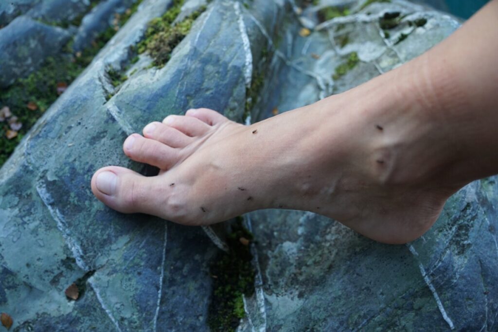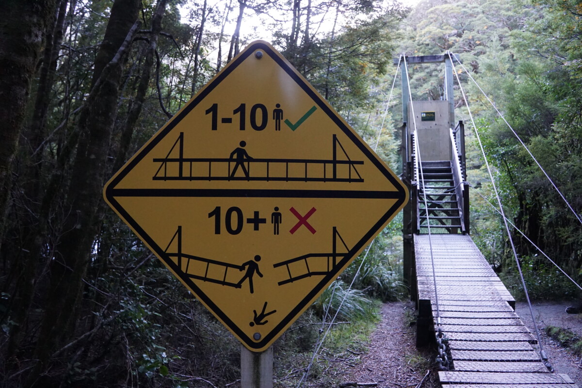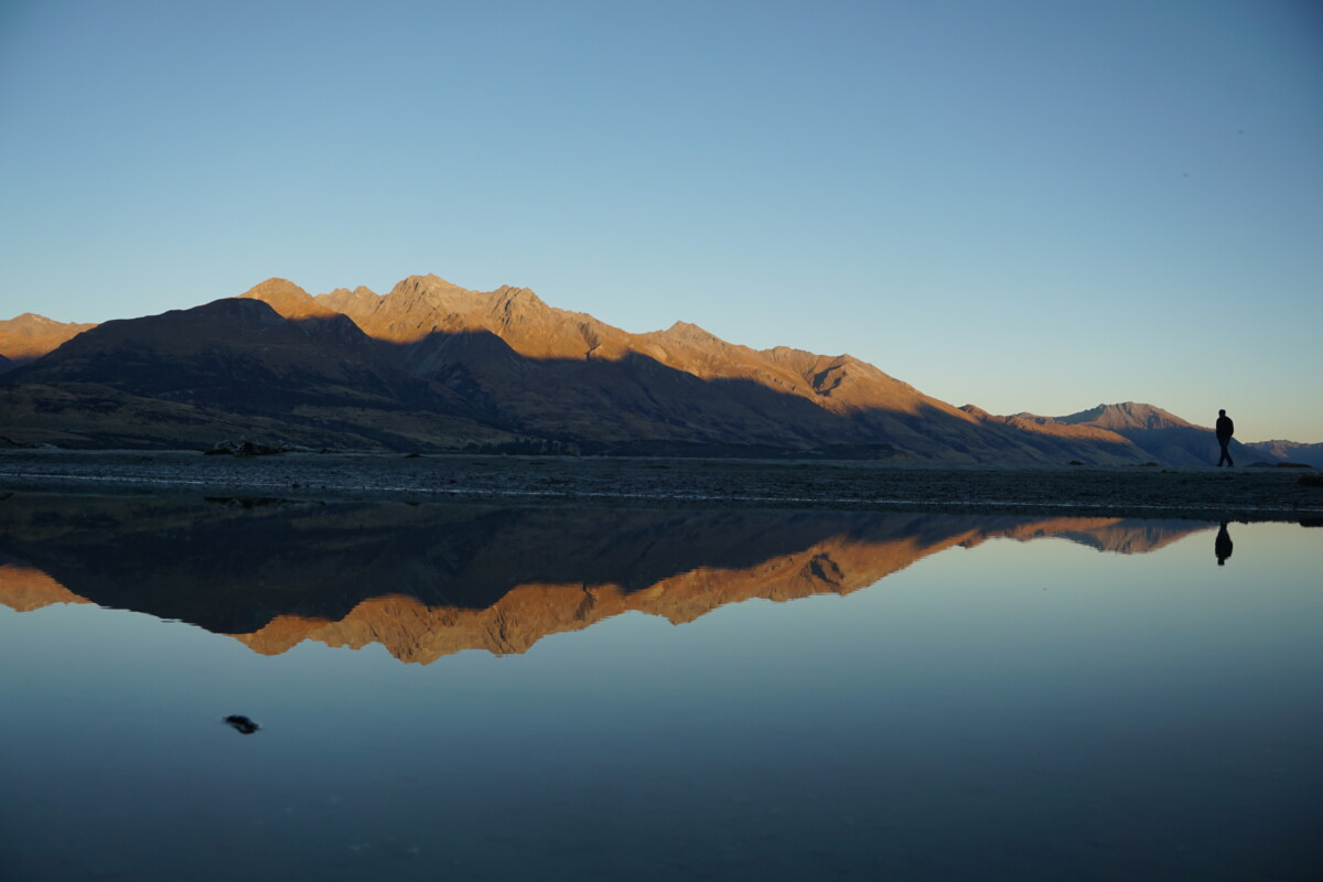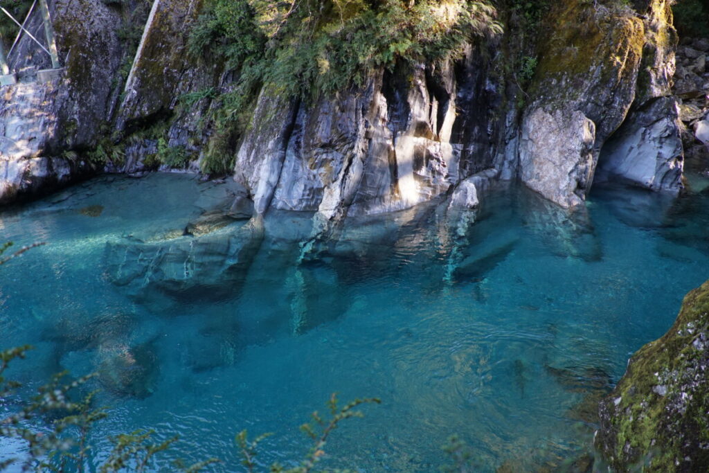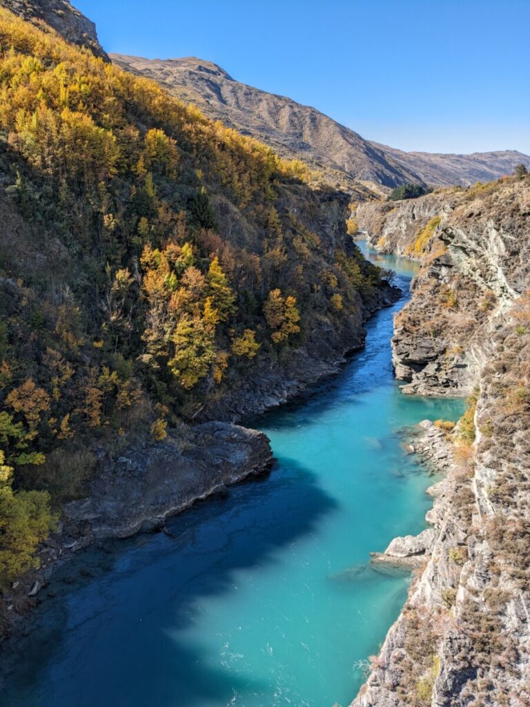 Weiter ging’s durch atemberaubende Landschaft Richtung Queenstown, fast wie in Alaska oder Kanada schaut es hier aus. Außer schneebedeckte Berge, Seen und glasklare Flüsse in breiten Flussbetten gibt es hier nichts – mal schnell Tanken gehen oder so ist hier nicht, da muss man schon etwas vorplanen! Wir bleiben mehrmals stehen um Fotos zu machen, zu schön um vorbeizufahren! Unser letztes Ziel am Tag waren die Blue Pools, aber wir mussten uns dann noch beeilen bei Sonneneinstrahlung hinzukommen, da wir zu viel getrödelt hatten. Ein weiteres Hindernis war die gesperrte Fußgänger-Hängebrücke dorthin, die wir kurzerhand einfach umgingen, indem wir durch den oberschenkeltiefen Bach wateten. Der Blick auf die türkisblauen Gumpen war wirklich etwas Besonderes, so eine Wasserfarbe hatten wir beide noch nicht gesehen. Es war so einladend, dass wir beschlossen, einmal schnell reinzuhüpfen. Sobald wir etwas nackte Haut zeigten, attackierten uns Horden von bissigen Sandfliegen, diese verdammten Viecher! Das Wasser war eisig, mehr als ein paar Sekunden und ein paar Brustzüge waren dann doch nicht drin 😉