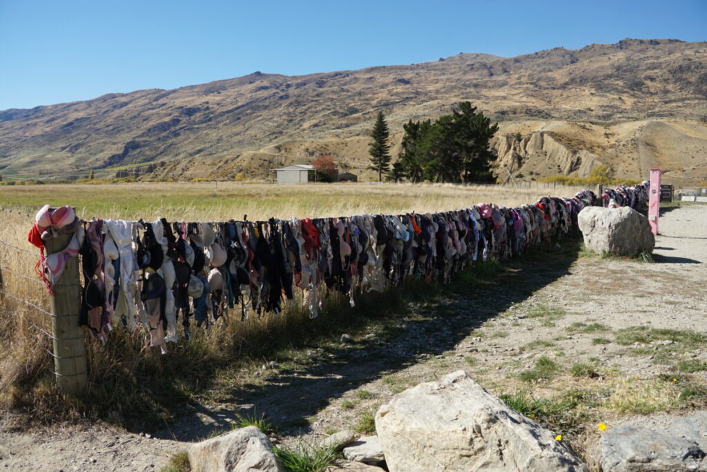 Den Tag darauf fuhren wir zuerst nach Wanaka, nicht ohne beim BH-Zaun anzuhalten. Am Cardrona Bra Fence hängen Unmengen „gespendeter“ BHs und es kommen stetig soviele hinzu, dass immer wieder welche abgenommen werden müssen. Eine ziemlich interessante Hintergrund-Geschichte, welche man hier nachlesen kann.