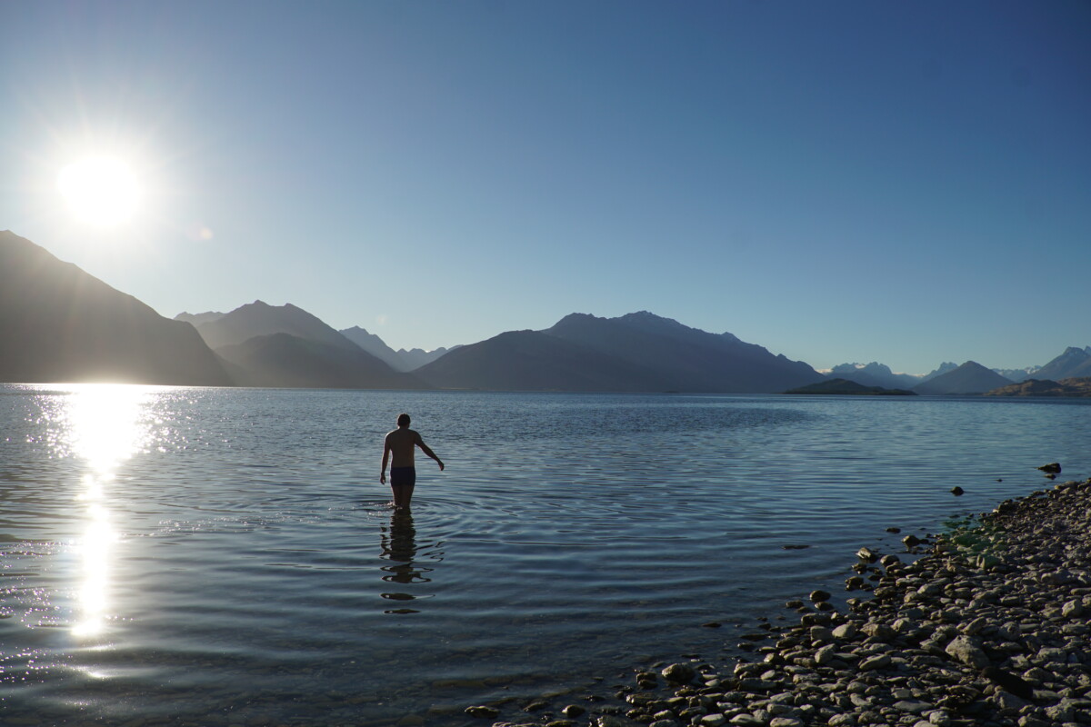Weg vom Trubel fuhren wir ganz ans andere Ende des längsten Sees (80 km) von Neuseelands. Dort mussten wir am nächsten Tag zuerst 3 Bäche mit unserem Nicht-Allrader überqueren, was zum Glück aber bei dem aktuellen Wasserstand kein Problem war. Dann unternahmen wir eine wunderbare 4.5 Stunden Rundwanderung, den Lake Rere Track. Romana schaffte es dann gleich am Beginn bei der Überquerung eines Bächleins auszurutschen und ihre Schuhe zu fluten 🙈