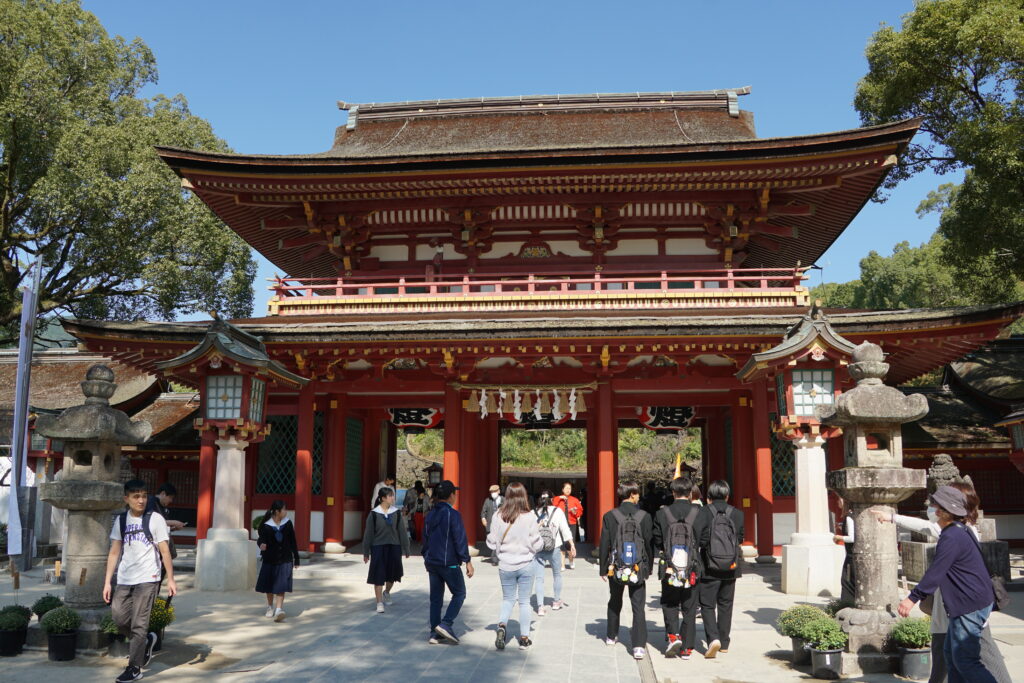 Am Mittwoch fuhren wir mit dem Zug raus aus der Großstadt nach Dazaifu. Die Lokalbahnen sind ziemlich günstig, für gute 20min Fahrzeit nur 370¥, also ca. 2,30€. Das bezahlt man in Japan am besten mit einer sogenannten IC-Karte, die man sich um ein paar Euro besorgen sollte, und dann regelmäßig wieder aufladen kann. Die IC-Karte wird beim Einsteigen in einen Bus oder am Bahnhof gescannt, und beim Aussteigen wird der Betrag abgebucht. Man kann damit aber auch z.B. bei Getränkeautomaten oder in Geschäften bezahlen. Aber zurück nach Dazaifu, wo wir uns einen bekannten Shintō-Schrein angeschaut haben. Shintō ist die in Japan vorherrschende Religion, und mit dem Buddhismus vergleichbar. Zurück in Fukuoka besuchten wir noch einen eindrucksvollen Riesenbuddha, die Japaner nehmen es nicht so ernst beim Beten, ob zu Buddha oder einem der vielen Shintō-Götter…