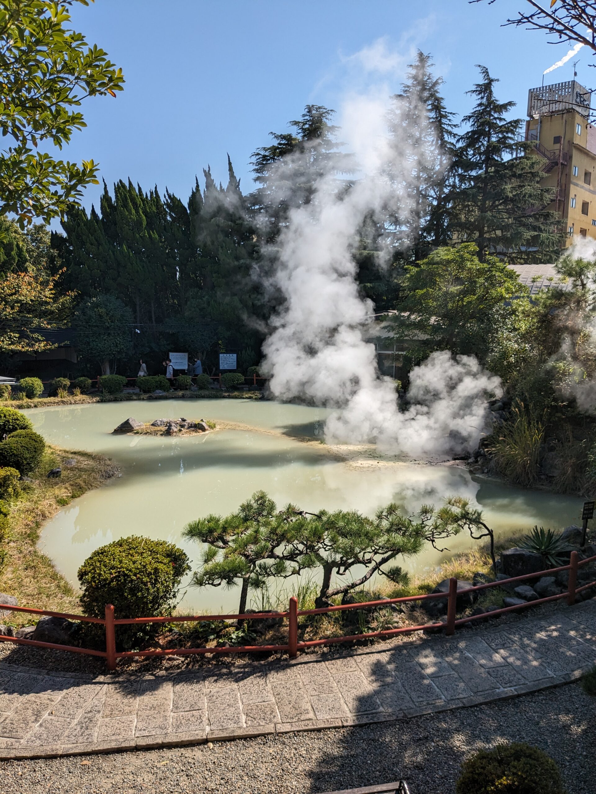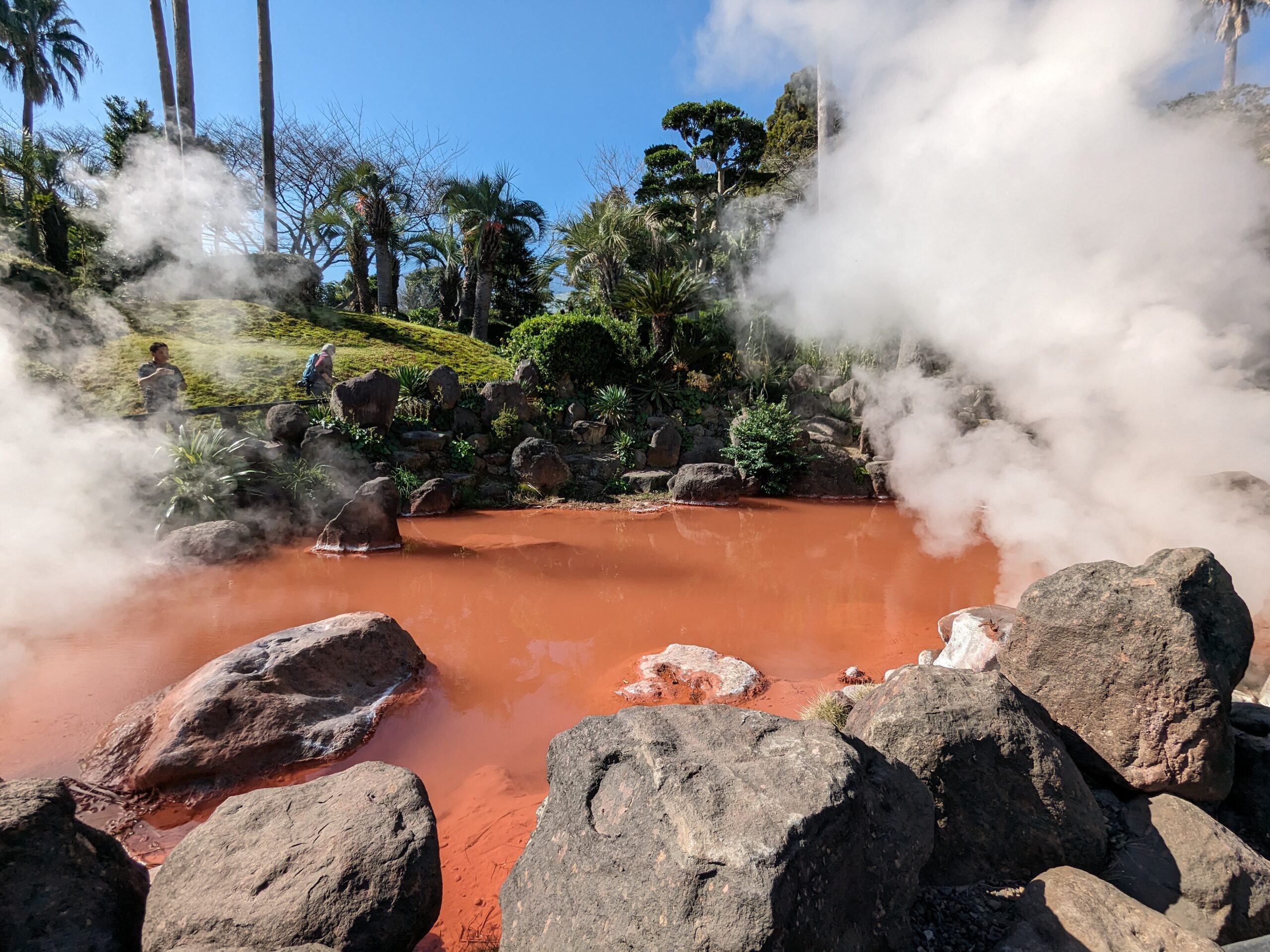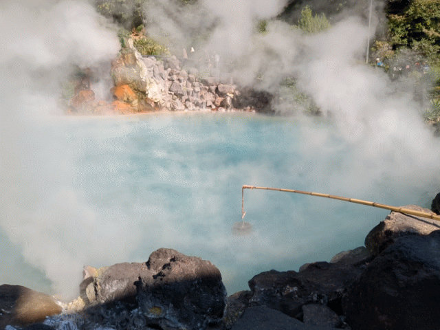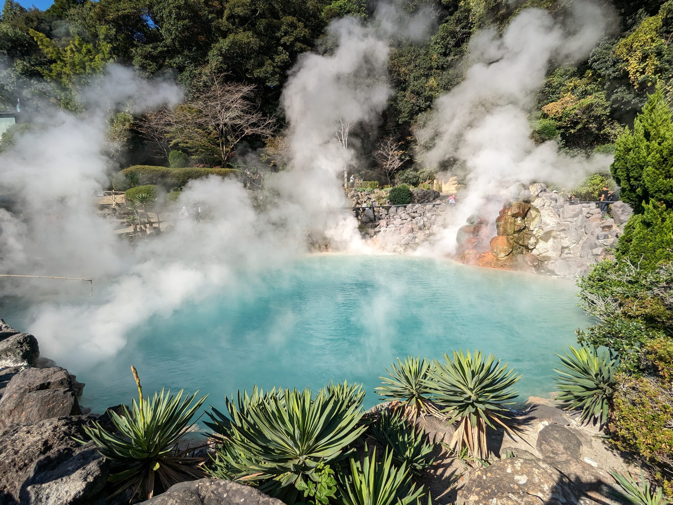 Ursprünglich war Kyushu ja gar nicht im Fokus unseres Japan-Trips, aber irgendwie sind wir dann auf Fotos von heißen Quellen in Beppu und dem Mount Aso, dem größten aktiven Vulkan Japans gestoßen… und wir waren fasziniert. Also versuchten wir erfolglos einen Expressbus nach Beppu zu buchen, aber gottseidank sind die Japaner ja extrem hilfsbereit und unser Hostel-Rezeptionist besorgte uns ein Ticket online, welches man über irgendein interessantes Bezahlsystem beim nächsten Convenience Store (kl. Geschäft für ALLES) bezahlen kann. Nach etwa dreistündiger angenehmer Busfahrt sind wir in Beppu angekommen. Wir gingen zum ersten Mal in einen öffentlichen Onsen, welche es in Beppu unzählige, aufgrund der vulkanischen Aktivität, gibt. Onsen sind Badehäuser mit heißen Quellen, die in Becken geleitet werden. Vor dem Baden wird allerdings der Körper mit Waschschüsseln gewaschen und geschrubbt was das Zeug hält, die Japaner nutzen die Onsen eher als tägliche Waschroutine. Das Schamgefühl sollte man gleich ablegen, man wäscht sich natürlich nackig neben allen anderen, was uns als Saunageher zum Glück weniger ausmacht. Dann kann man sich für eines von zwei Becken entscheiden, sehr heiß oder kurz vor dem Siedepunkt (gefühlt ;-)) Die Hotpots in Island waren mit bis 43°C schon nicht kalt, aber hier sind es sicher 45°C oder mehr!