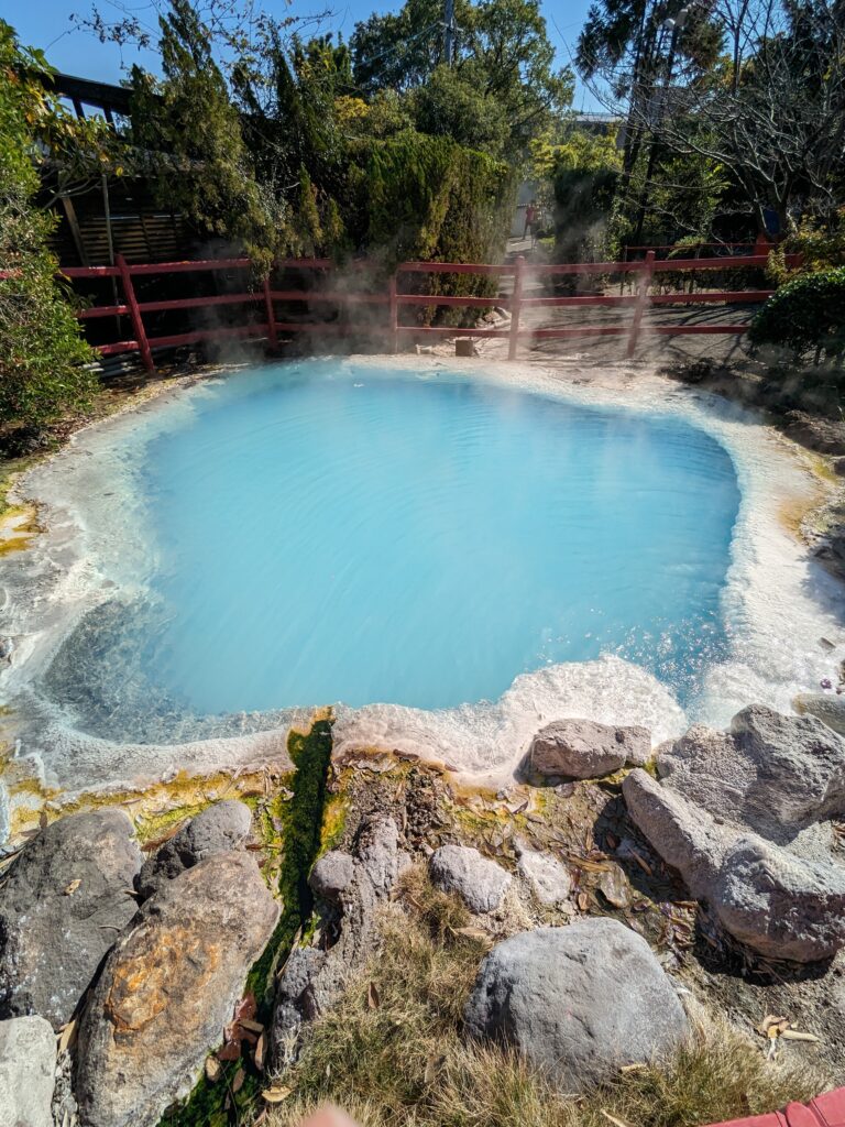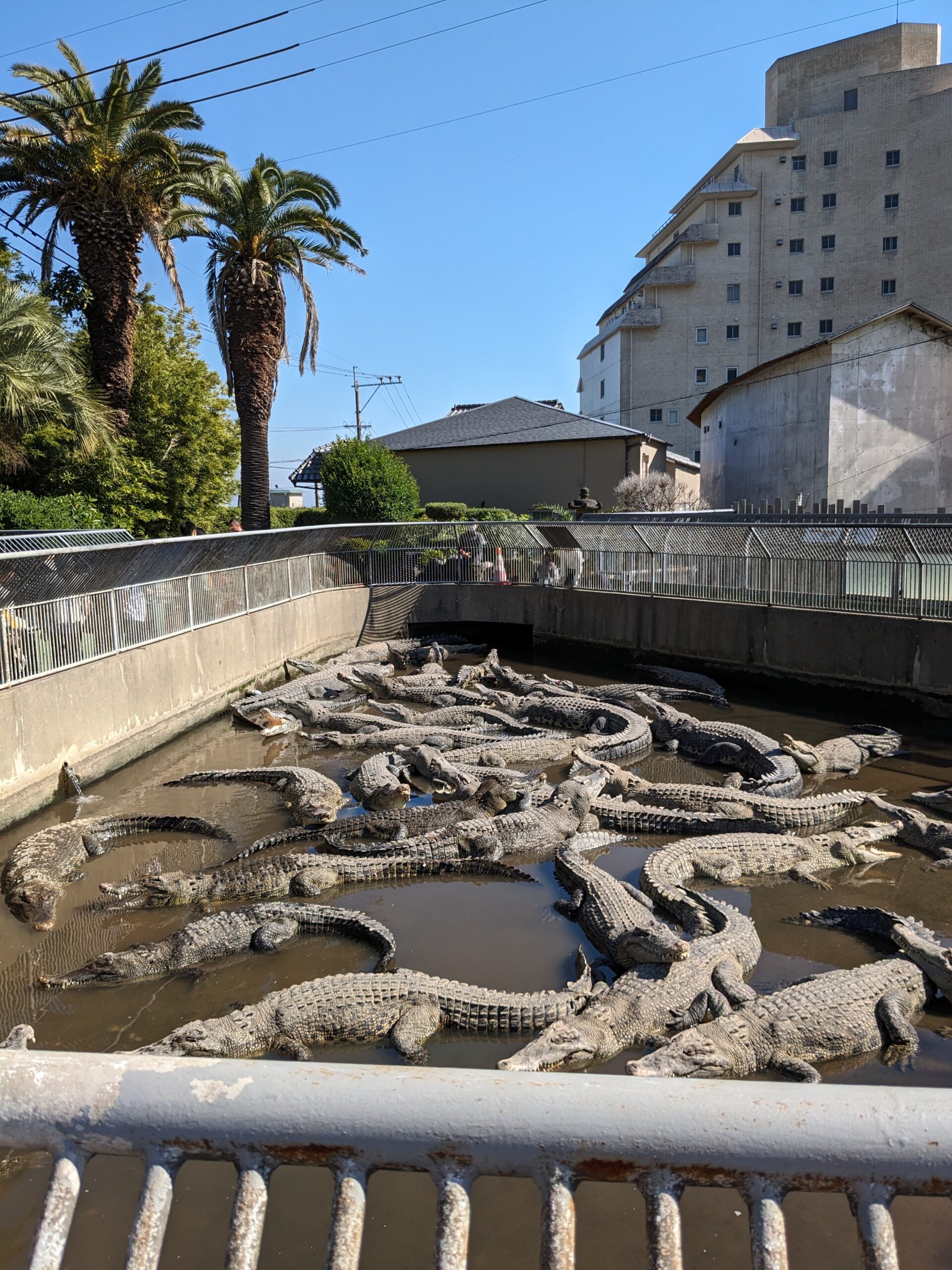 Am nächsten Tag schauten wir uns die „7 Höllen“ von Beppu an (Beppu Hells oder auf japanisch „Jigoku“). Das sind geothermale Becken mit unterschiedlichsten Farben und Formen, die meisten über 90°C heiß, sehr beeindruckend! Leider waren im Gelände zweier Hells auch Tiere anzuschauen, aber die Tierhaltung ist wirklich unwürdig! Bei einem wurden massenweise Krokodile gehalten, beim anderen riesige Fische in dreckigen, tristen und kleinen Aquarien… traurig! Der nächste Tag war eher unspektakulär, ein Marktbesuch (bei dem wir vom Lokal-TV interviewed wurden, wie es uns gefällt) und ein kleiner Radtrip zu einem Wasserfall.