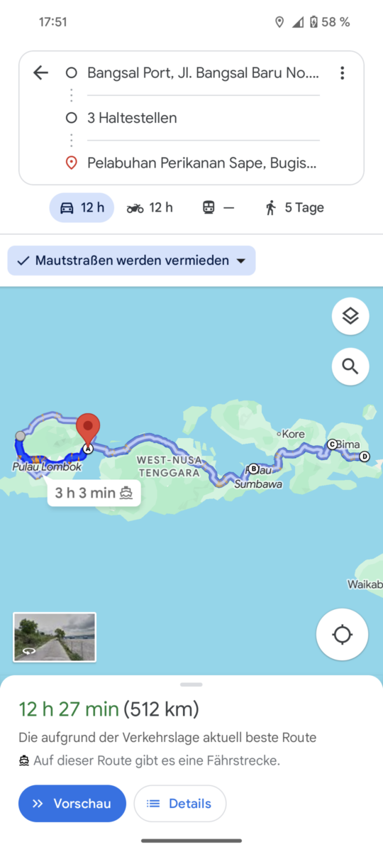 Jetzt nichts wie weg von hier, auf der Straße fuhren sogar schon einige Fahrzeuge vorbei. Zu siebt stellten wir uns an den Straßenrand und nach kurzer Zeit hielt auf unser Winken sogar ein luxuriöser Schlafbus, der uns in drei Stunden bis nach Bima mitnahm. Wir alle waren natürlich komplett erschöpft von dieser katastrophalen Erfahrung, aber auch sehr froh, endlich weg von diesen Halsabschneidern zu sein und den finanziellen Schaden begrenzt zu haben.