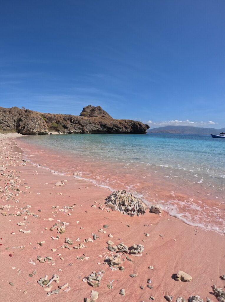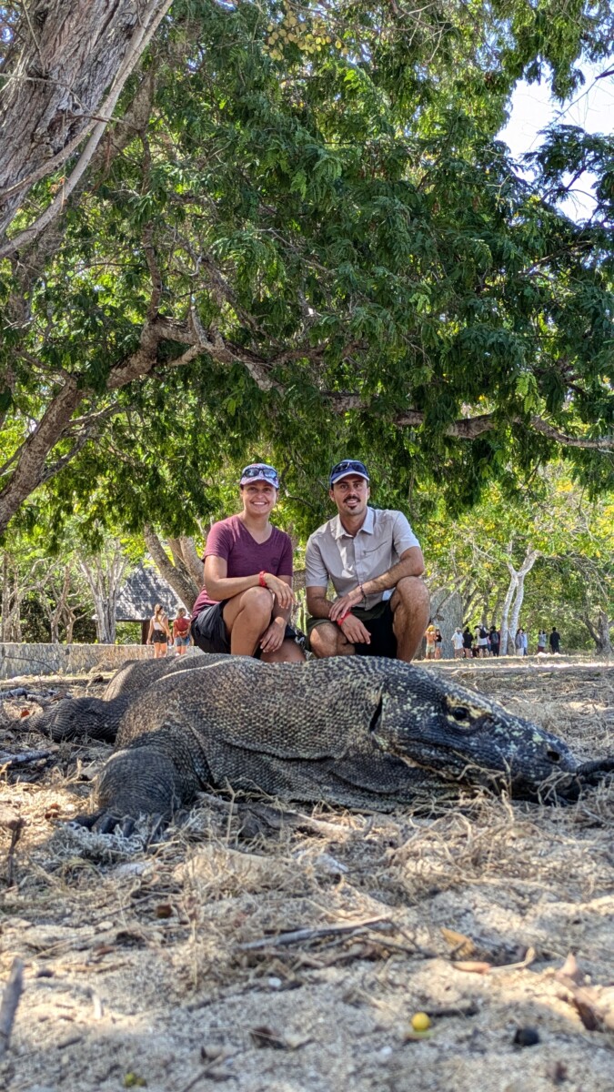 Am 25. Juni machten wir dann endlich unseren Komodo-Ausflug, diesmal halt als Tagestour von Labuan Bajo mit einem Speedboat, wie es die meisten machen. Das Unternehmen war super organisiert und das Schiff echter Luxus. Erster Programmpunkt war eine überlaufene 20min-Wanderung, aber der Blick auf die Buchten und Inseln vom Komodo-Nationalpark war es dann doch wert. Danach ging es zum Pink Beach, der aufgrund von roter Korallen, die Sand wurden, eine rötlich-pinke Farbe hat. Die Hauptattraktion waren dann natürlich die Komodowarane, oder Komodo Dragons, von denen ca. 1600 auf dieser Insel leben. Diese Reptilien werden bis zu 3 Meter groß und sondern bei einem Biss Gift ab, das die Blutgerinnung hemmt. Zum Glück sind sie nicht aggressiv, außer man bedroht sie. Wir (und hunderte andere Touristen!) kamen mehreren riesigen Drachen dann auf wenige Meter nahe, ich hatte aber schon gehörigen Respekt, dass einer dann plötzlich zu uns losstartet. Einer spazierte aber dann plötzlich mit ziemlich langsamen Bewegungen weiter, nachdem es ihm wohl zu nerven begann, mit unzähligen Touris auf den Fotos zu sein, die die Guides schossen.