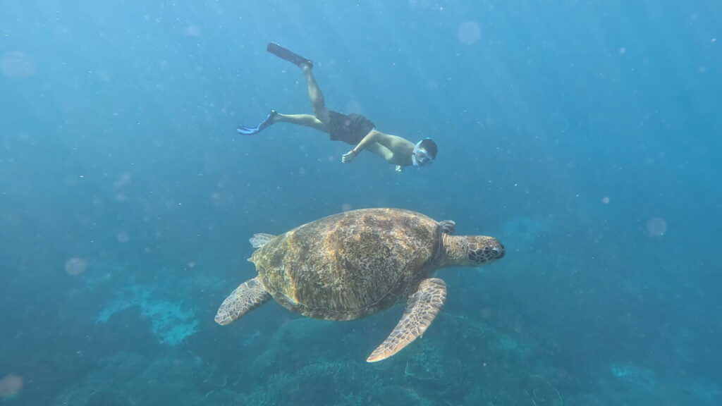 Nachmittags fuhren wir noch mehrere Schnorchelspots an, und sogar die Crew war dann sehr aufgeregt, als sie zwei Mantarochen entdeckten, da an diesen Spots seit zwei Monaten keine mehr gesehen wurden! Echt cool, diese riesigen Teile nochmal von der Wasseroberfläche beim Schnorcheln beobachten zu können! Weiters sahen wir auch einige Schildkröten, aber so einem riesigen Exemplar, schätzungsweise 1,5 Meter Länge, waren wir noch nie so nahe gekommen. Es war ein gelungener Tag!