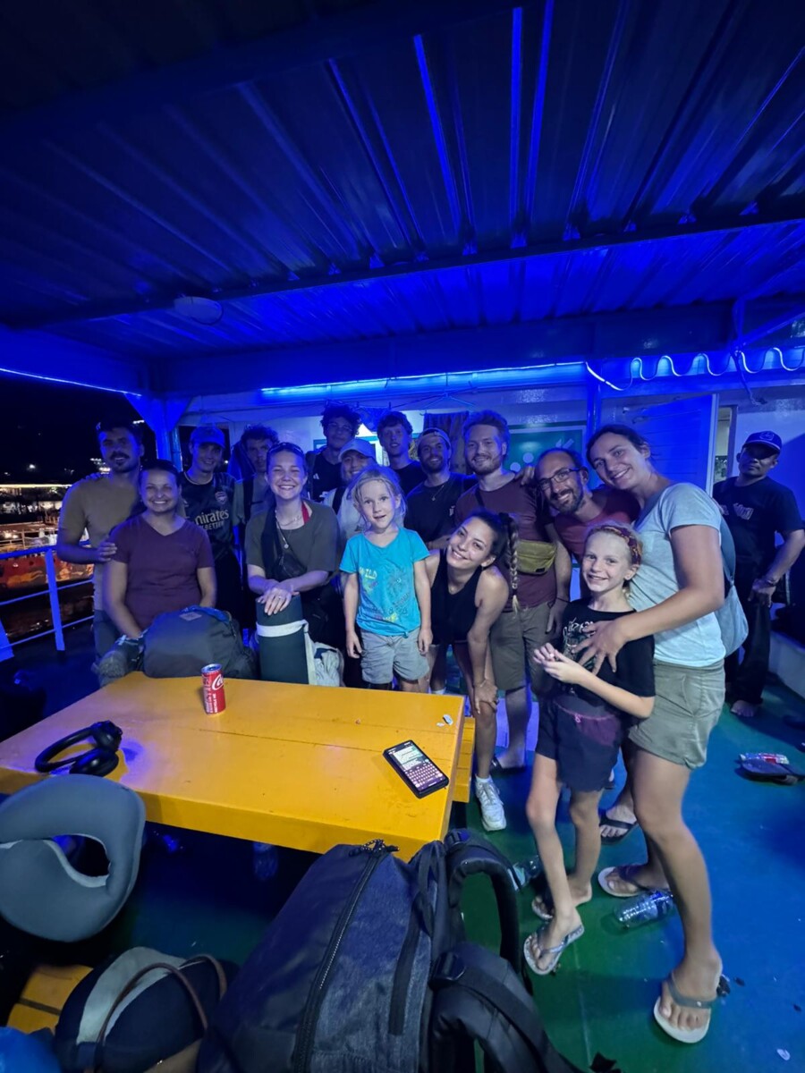 Irgendwann dann sah man Lichter auf dem Meer, und es kam ein kleines Beiboot, mit dem dann die ersten Willigen rausgebracht wurden. Sie übertrugen dann mit WhatsApp ein Live-Video vom Schiff, das sich als ziemlich klein für so viele Leute herausstellte. Die meisten hatten einen Schlafplatz an Deck gebucht, da es das billigste war. Das stellte sich als beengtes Matratzenlager heraus, aber für drei Nächte halbwegs aushaltbar. Richtig mies waren die “Privatzimmer”, welches auch wir gebucht hatten. Winzig klein, stickig und sehr laut, da direkt neben dem Maschinenraum.