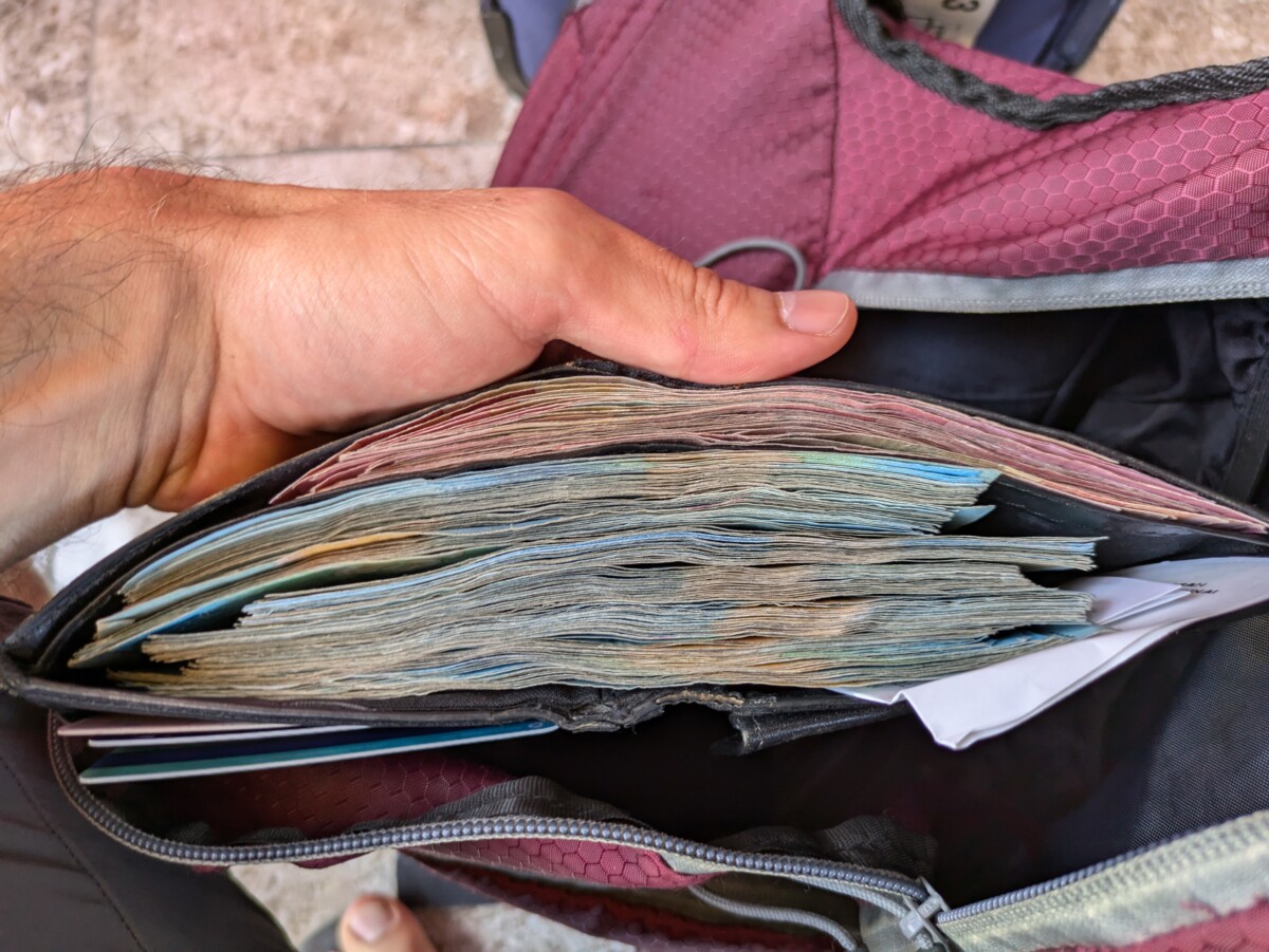 Am nächsten Tag sollten wir um 09:30 beim “Büro” in Bangsal sein, wo wir die 4 Tage/3 Nächte Bootstour nach Flores über Komodo gebucht hatten. Eigentlich wollten wir die 7,6 Millionen Rupien (432€) mit Karte bezahlen, ein anderer Gast sagte uns dann aber, dass sie für Kartenzahlung 5% Gebühr verlangen, was für ein Witz! Da geh ich lieber zum nächsten Bankomaten und zahle in bar. Der war zum Glück gleich um die Ecke, aber spuckte nur 50.000-Scheine aus und maximal 1.25 Millionen! Sieben Transaktionen und zehn Minuten später hatte ich dann solch einen Stapel an Geldscheinen, dass die Geldtasche sich nicht mehr zuklappen ließ 😂 Ebenfalls etwas schräg war, dass wir alle Getränke für die nächsten Tage vorbestellen mussten. Woher soll ich denn wissen, wieviel Bier ich übermorgen trinken will? Wir orderten einfach 8 Bier und 4 Cola…