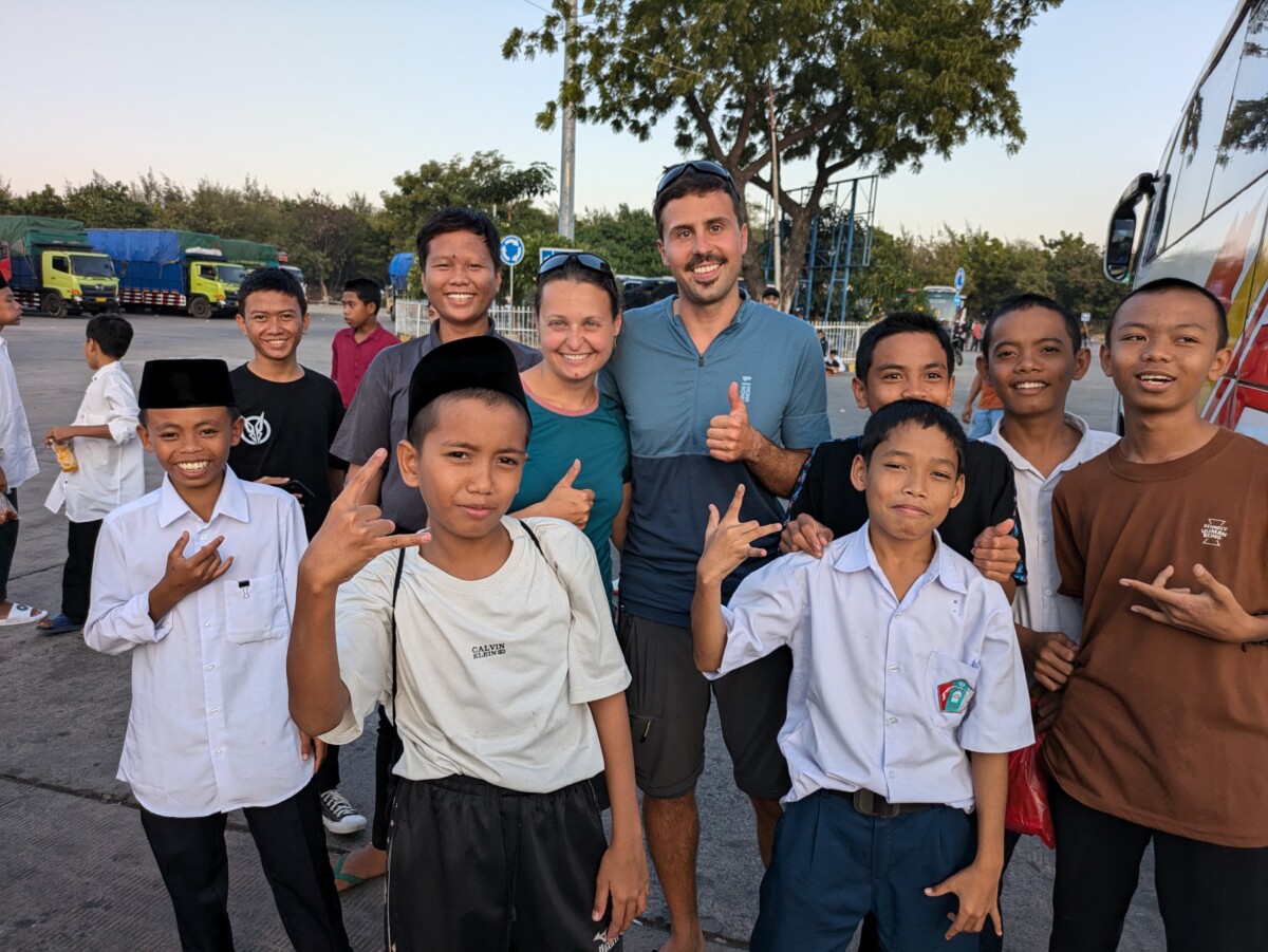 Es war dann schon später Nachmittag, als wir den Hafen erreichten. Dort regte sich erster Widerstand und 6 Leute wollten die Tour abbrechen. Sie schienen mit den drei inkompetenten Tourguides um ihr Geld zu streiten. Wir anderen dachten uns noch OK, wir sind in Indonesien, da kann das schon mal passieren und machten noch Witze über die überempfindlichen Aussteiger. Beim Warten auf die Fähre waren wir gestrandeten Touristen dann das Highlight bei den ebenfalls wartenden Einheimischen und alle Kinder und Jugendlichen wollten dann Fotos mit uns allen machen. Viele Witze über den misslungenen Tag wurden gerissen und wir lernten uns alle etwas besser kennen, solch merkwürdige Situationen schweißen eine Gruppe halt gleich zusammen.