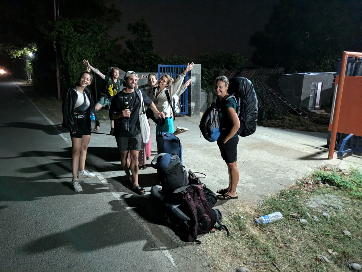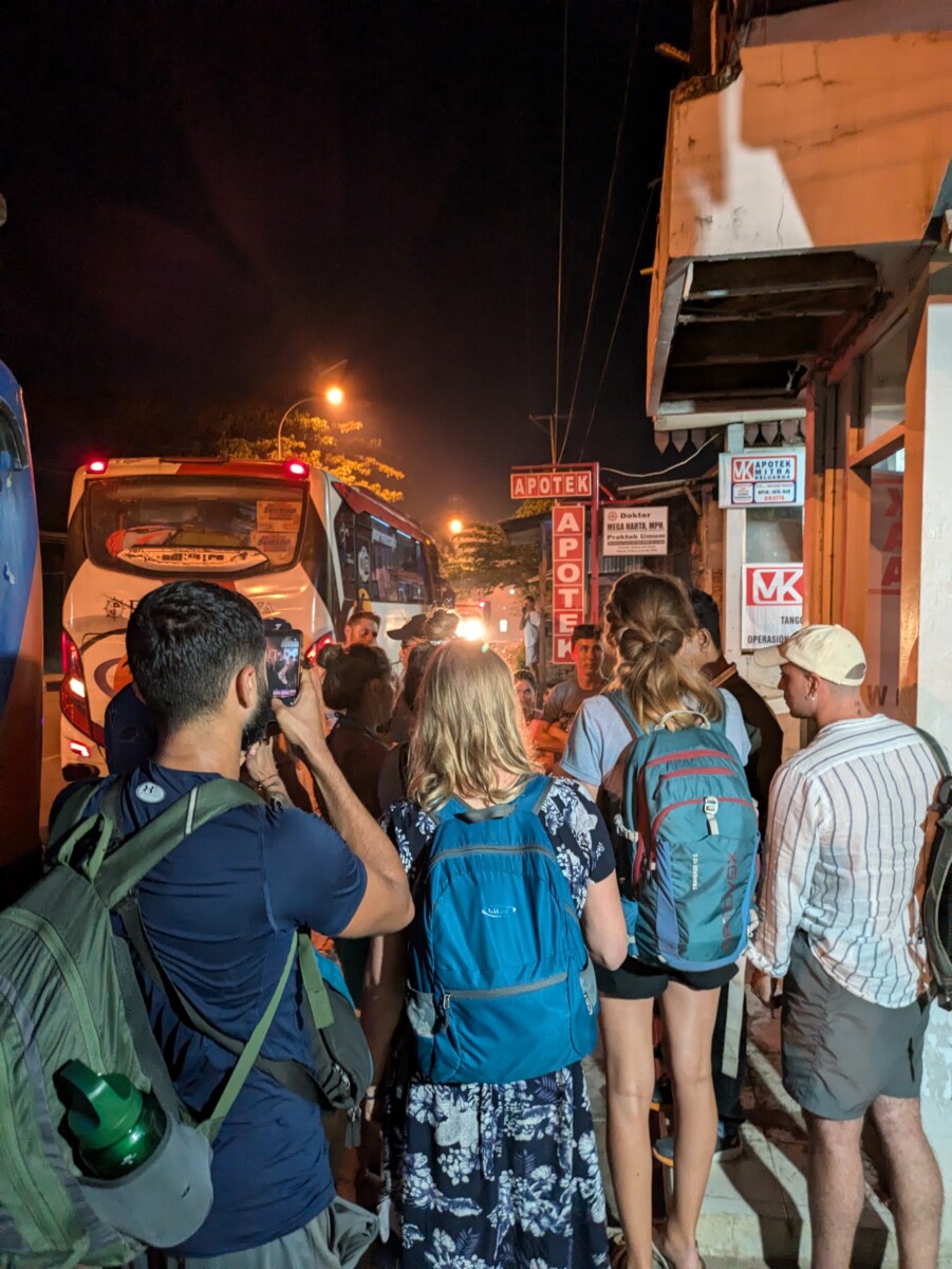 Die Überfahrt nach Sumbawa mit der überfüllten Fähre dauerte gute zwei Stunden, den ganzen (bezahlten) Tag waren wir jetzt schon unterwegs, ohne irgendetwas Interessantes gesehen oder erlebt zu haben. Romana sagte dann irgendwann, hoffentlich ist das nicht alles Betrug… Ich war bis jetzt ja optimistisch gewesen und die Erklärungen der Guides halbwegs glaubwürdig. Als wir dann aber nach weiteren zwei Stunden Busfahrt von der Küstenstraße ins Landesinnere von Sumbawa einbogen, waren wir uns sicher, dass wir so schnell heute kein Schiff mehr sehen werden und das alles sehr nach einer Betrugsmasche und Hinhaltetaktik roch. Wir sprachen die Verantwortlichen darauf an, wurden aber wieder vertröstet, dass sie jetzt für uns ein Abendessen organisieren würden und wir in 30 Minuten da seien und das Boot schon warte, was eigentlich immer schon die Standart-Antwort war. Es war dann Mitternacht, als wir vor einer kleinen Kantine hielten, in der nette Indonesierinnen auf uns gewartet zu haben scheinen und für den Schlamassel sicher nichts dafür können. Hunger hatten die wenigsten, den meisten war der Appetit vergangen und es wurde “Krisensitzung” gehalten, wie wir als Gruppe weiter vorgehen. Einige fanden dann auf Google katastrophale Rezensionen für diese Betrüger-Firma von Reisenden, denen so ziemlich das Gleiche passiert war. Die Zustände auf dem Schiff seien ebenso schlimm. Die Entscheidung unserer Reisegruppe fiel dann so aus, dass wir uns das Boot zumindest anschauen wollen, bevor wir hier mitten in der Nacht und im Nirgendwo auf eigene Faust weiterziehen.