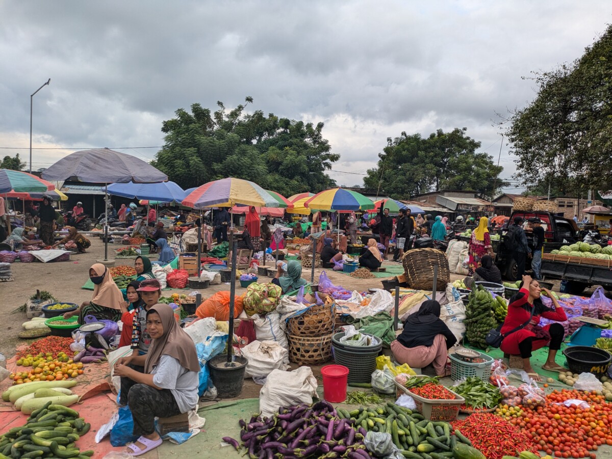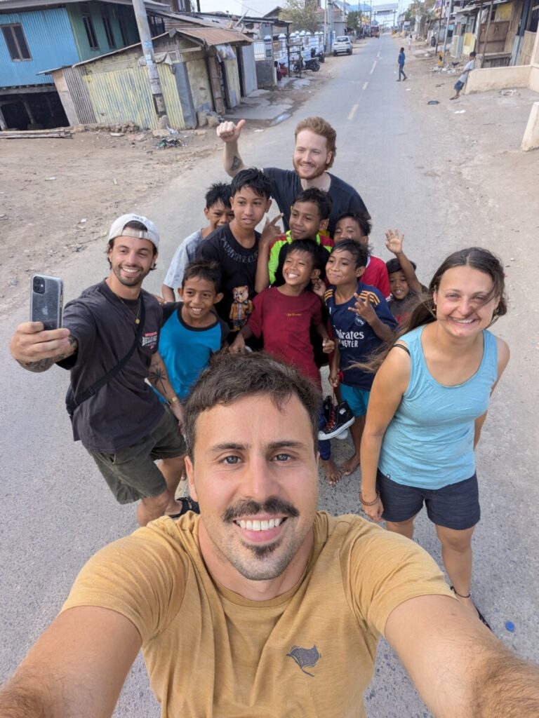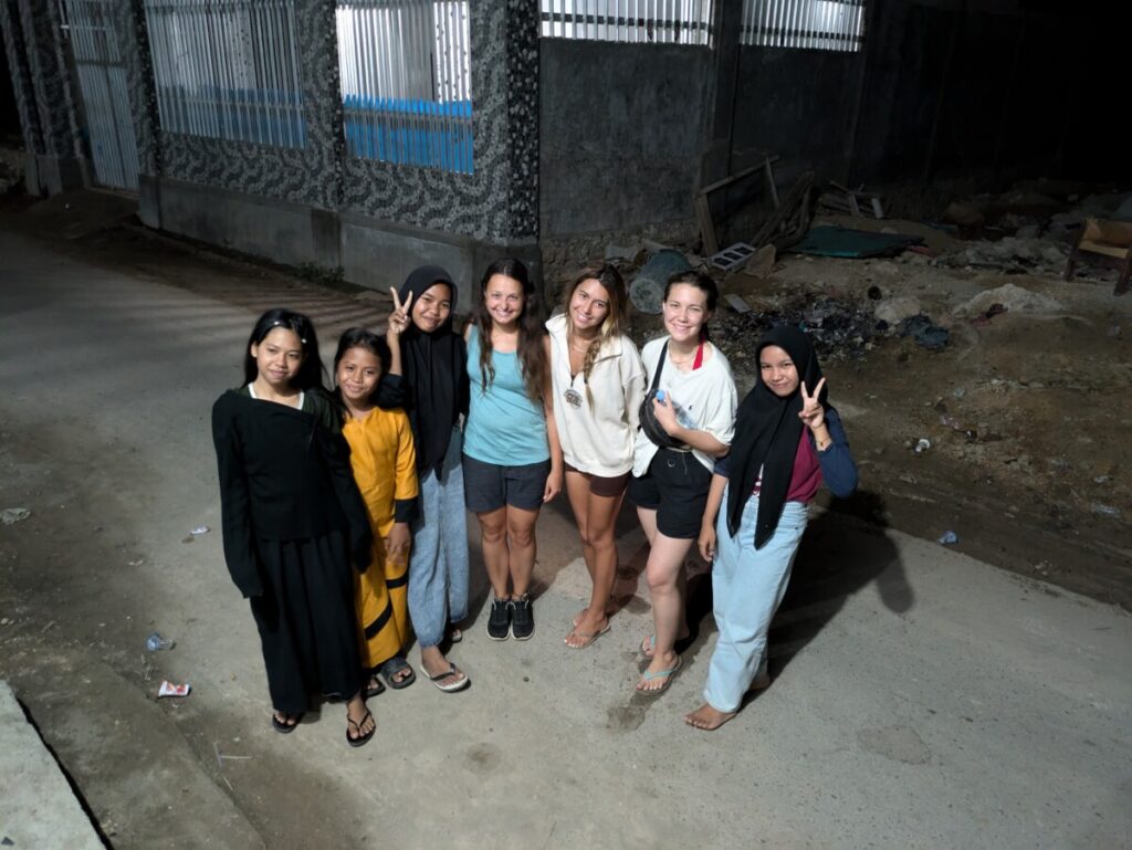 Eineinhalb Stunden später waren wir dann endlich am Hafen in Sape, nur um gesagt zu bekommen, dass die nächste Fähre dann erst am Montag geht. Es war Samstag Mittag 🙈 Zum Glück gab es eine Unterkunft namens Hotel Mantika mit freien Zimmern gleich neben dem Hafen, der Standard war halt für indonesische Gäste ausgerichtet… Geraucht wird in Indonesien überall und ständig und das roch man halt auch im etwas schäbigen Zimmer. Nun gut, wir alle waren sowieso übermüdet von den Reisestrapazen, zwei Nächte werden wir schon überleben hier. Zuerst brauchten wir dringend eine Dusche, bevor wir uns dann auf die Suche nach einem Restaurant machten. Wir beschlossen in der Gruppe, dass wir ab jetzt wieder all unser Misstrauen gegenüber den Leuten aufgrund der letzten Stunden ablegen sollten, denn mit einer schlechten Einstellung zieht man schlechte Leute an. Und hier in Sape war es dann total gegensätzlich zu Bima, alle Einheimischen winkten und lächelten uns zu. Es scheint, als ob hier so gut wie nie weiße Touristen durchkommen. Auf dem Weg zu einem der wenigen Lokale hatten wir gleich eine Schar Kinder hinter uns, die uns verfolgte und uns ihre paar Brocken Englisch zuriefen, die sie wohl in der Schule gelernt haben. “Miss, Miss” schrien sie schon von weitem, als sie unsere europäische Zweckgemeinschaft entdeckten, viele wollten auch ein Foto machen. Speziell die jungen Mädchen und Frauen waren ganz verrückt danach, mit unseren weißen Frauen einen Selfie zu ergattern.