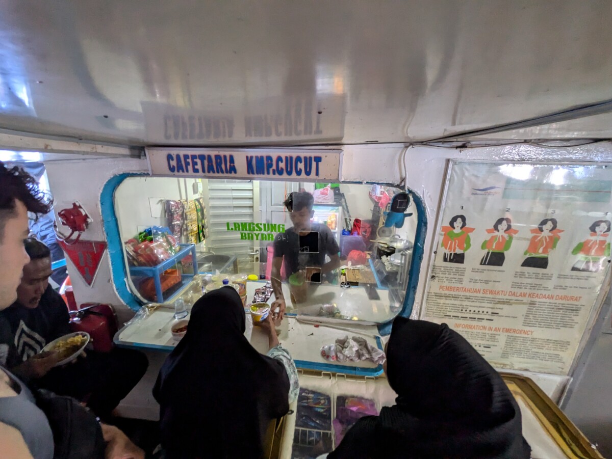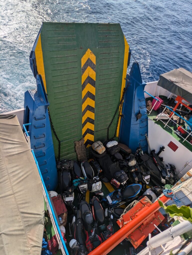 Am Montag herrschte dann das absolute Chaos am Fährterminal, denn die Fähre vom Samstag war ausgefallen und somit war der Andrang an Leuten und Fahrzeugen riesig. Ohne die Hilfe unserer netten Hotelrezeptionistin und anderen hätten wir es wohl nicht geschafft, ein Ticket zu ergattern. Als wir dann etwa gegen 09:00 dann tatsächlich auf der zum bersten gefüllten Fähre waren, war die Erleichterung dann schon groß, endlich von dieser Insel loszukommen. Während der achtstündigen Überfahrt brachten uns die Franzosen kurzweilige Kartenspiele bei. Zu Mittag holte ich für Romana und mich Mie Goreng (gebratene Nudeln) von der “Kantine”, und ich staunte nicht schlecht, wieviel der Typ in der winzigen Küche gleichzeitig machen musste: Nudeln anbraten, Wasser im Kocher nachfüllen, Abspülen, Kassieren, Eier schälen, Packungen aufreißen, Essen ausgeben und das wichtigste: eine Zigarette rauchen. Es muss 60°C in diesem Kämmerchen gehabt haben und der Strom an Menschen, die heißes Wasser für ihre Instant-Nudeln von ihm haben wollten, riss nicht ab. Beeindruckend!