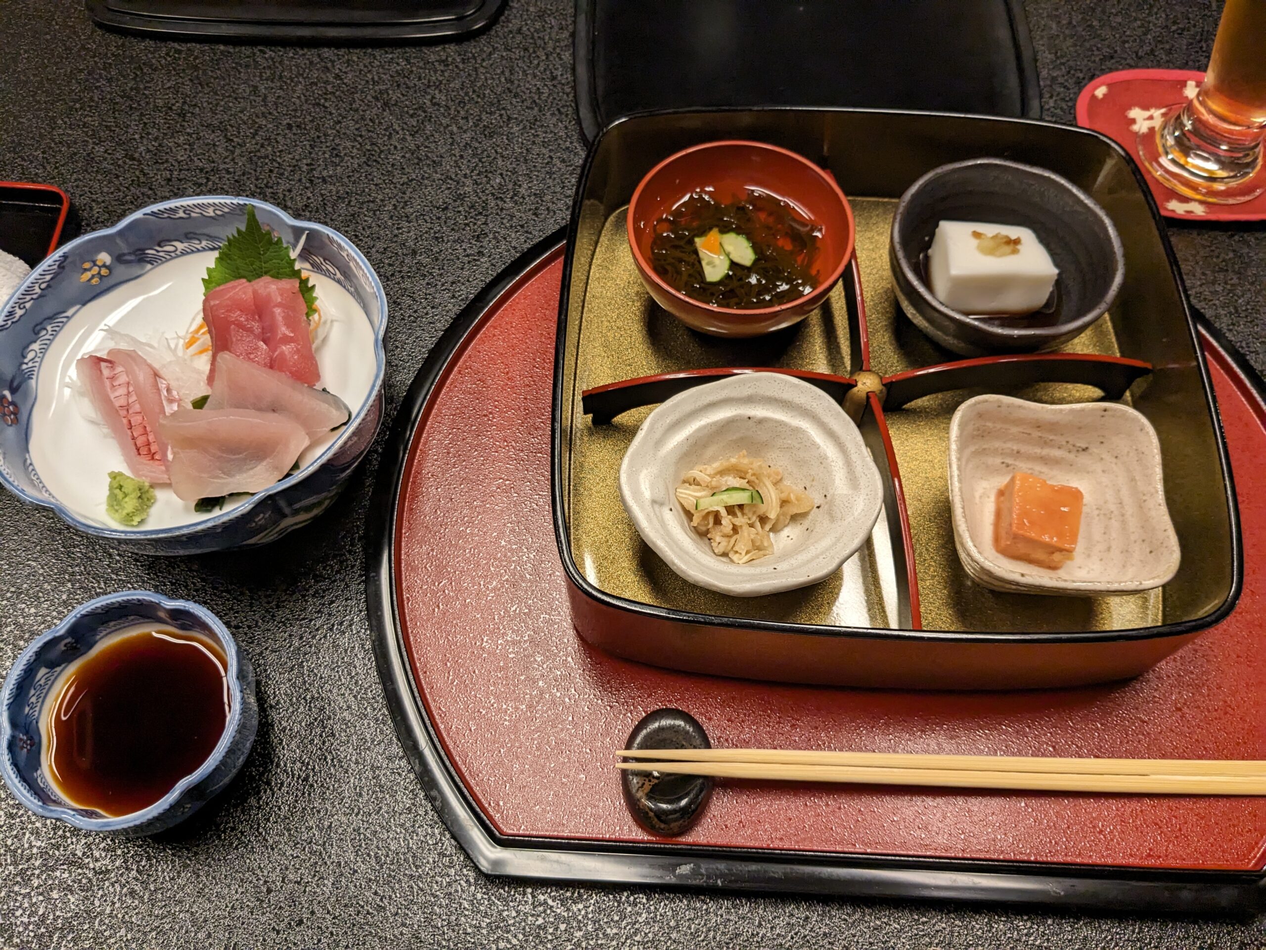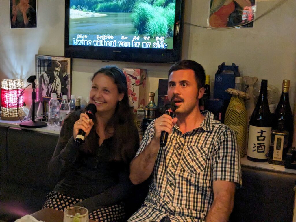 Zurück in Naha suchten Romana und ich noch eine nette Bar, und gerieten in eine winzige Karaoke-Bar, wie wir erst später bemerkten. Ein Einheimischer lud uns sogleich ein, einen Song aus Österreich zu singen… wir fanden leider keinen und trällerten daher zu Queen! Die Gastfreundschaft ist wirklich einzigartig, da man uns ohne Aufforderung auf Thunfisch-Sashimi (roh, eine Delikatesse!) und eine Suppe einlud! Englisch spricht so gut wie keiner, und man ist viel auf den Google-Übersetzer angewiesen.
