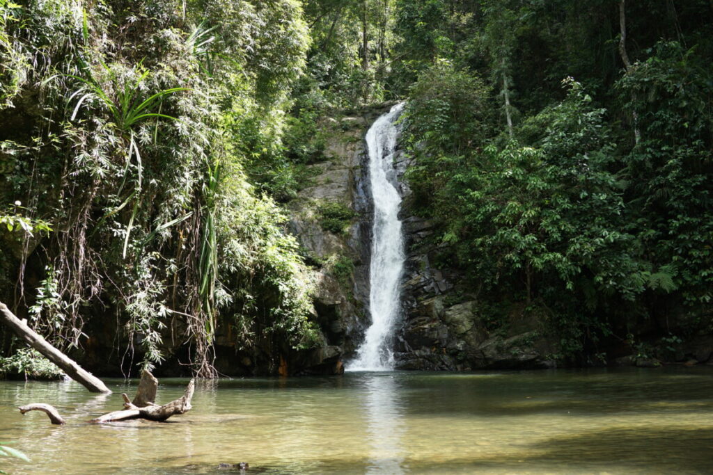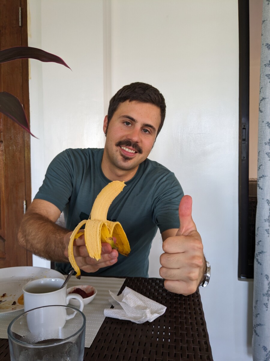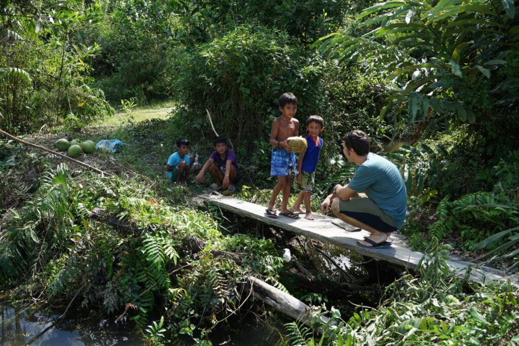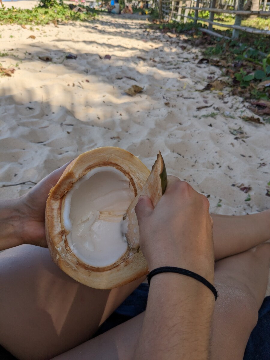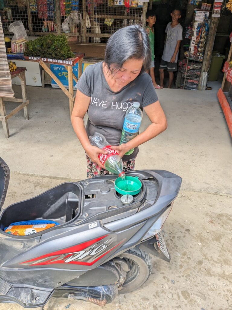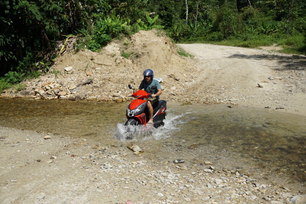 Am nächsten Tag liehen wir uns einen Roller, mit dem wir zu umliegenden Stränden und Wasserfällen fuhren. Dazu mussten wir fast alles auf Schotterstraße bzw. kurzzeitig überhaupt auf schmalen Fuß-Pfaden durch kleine Dörfer und Dschungel fahren. Getankt wurde beim nächsten „Straßenshop“, welche immer Benzin in Colaflaschen vorrätig haben. Eine nette Begegnung war mit 4 kleinen Dorfjungen, die uns mitten im Nirgendwo aufhielten und eine Kokosnuss verkaufen wollten. Das Handeln haben sie bereits perfekt beherrscht, aber wir konnten uns zumindest auf 40 Pesos einigen. Der älteste davon bearbeitete die Nuss mit einer riesen Machete, als hätte er in seinem Leben nichts anderes getan.