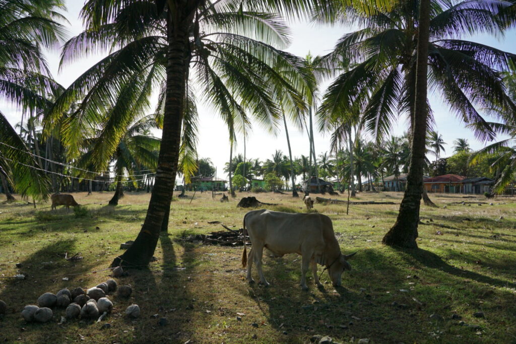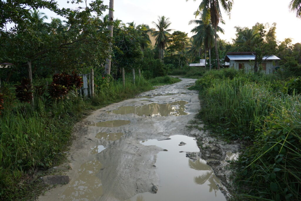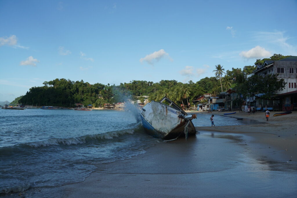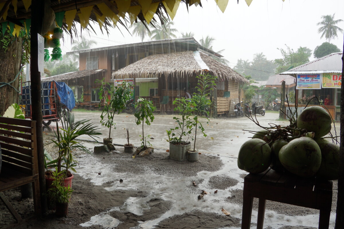 Der kleine Bus flog mit ca. 300km/h über die holprige Straße, die den Regenwald Palawans von Süd nach Nord durchquert. Interessanterweise sind hier die Straßen betoniert, und nicht asphaltiert, vielleicht ebenso wegen der Hitze? In Port Barton sind aber längst noch nicht alle Straßen befestigt, und auf dem Weg zu unserer Unterkunft gilt es einige „Drecklacken“ und stinkende Kloaken-Rinnsale zu überwinden. Die „Häuser“ sind meist einfach und klein, oft nur mit Wellblech oder Stroh abgedeckt. Abgemagerte Straßenhunde sind überall und zahlreich. In der Unterkunft (4€/Nacht/Person) werden wir nett empfangen, es ist aber gerade ziemlich Baustelle, denn unsere Gastgeber erweitern ihr Angebot um ein weiteres kleines Gebäude, um den neuen „Touristenanstürmen“ gerecht zu werden. Das Zimmer ist klein, hat aber sogar Klimaanlage und fließend Wasser im eigenen Badezimmer. Zuerst mal Abkühlen im Meer, der relativ leere palmengesäumte Sandstrand lädt dazu ein! Abends probierten wir eine typisch philippinische Straßenkantine aus, in welcher wir um insgesamt ca. 10€ (inkl. 7% starkem Red-Horse-Bier) einfach, aber schmackhaft gespeist haben. Während dem Essen streunen immer wieder Hunde und Katzen zwischen den Tischen umher, und versuchen einen Bissen mit mitleidigen Blicken zu ergattern.