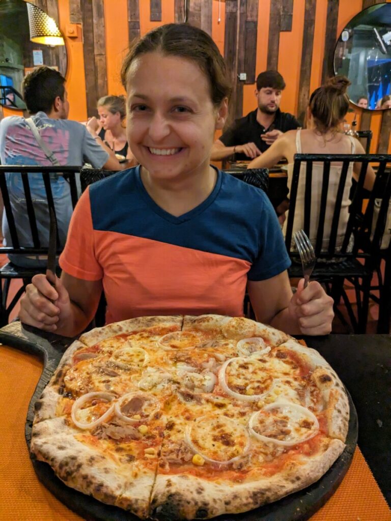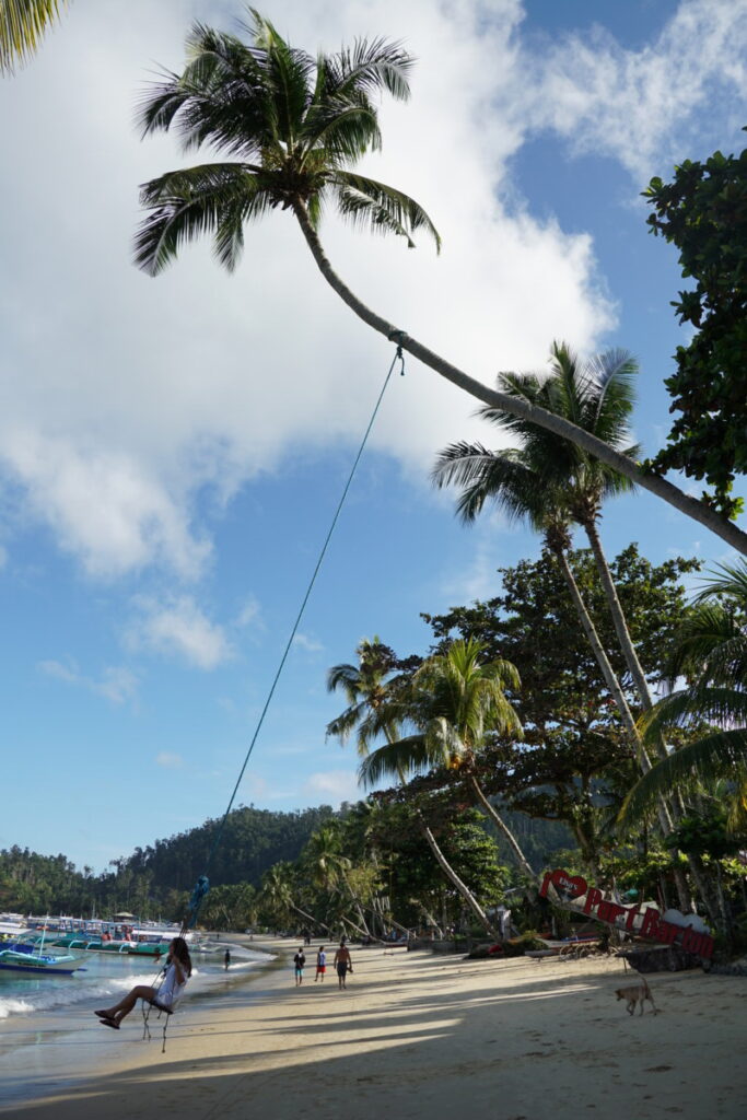Am Dienstag ging es schon wieder weiter nach El Nido, dem touristischsten Ort auf Palawan. Hier hatten wir ein Bungalow gebucht, das mitten im steilen Wald war, aber eine Sicht auf die Bucht El Nidos hatte. Leider keine Klimaanlage, was die Nacht schon zur Herausforderung macht! Aber der Vermieter Armstrong war unglaublich nett, organisierte uns alles, und wir hatten super Gespräche. Die Preise in El Nido sind für philippinische Verhältnisse exorbitant, dafür kann man in der „Touristenstraße“ halt westlich Essen gehen, man bekommt Pizza, Pasta und Burger. Wir stillten unseren Pizzahunger mit einer erstaunlich guten Pizza (eine um 10€!), gingen die restlichen 2 Abende dann aber wieder in eine Normalpreis-Kantine, wo wir auch sehr gut aßen! In El Nido hatten wir selbes Programm wie in Port Barton, ein Tag Roller und Strand, ein Tag Bootstour. Man kann sich kaum vorstellen wie es am Strand um 09:00 zugeht, hunderte philippinische Boote („Bangkas“), und tausende wartende Touristen, und es ist nicht mal Hauptsaison!