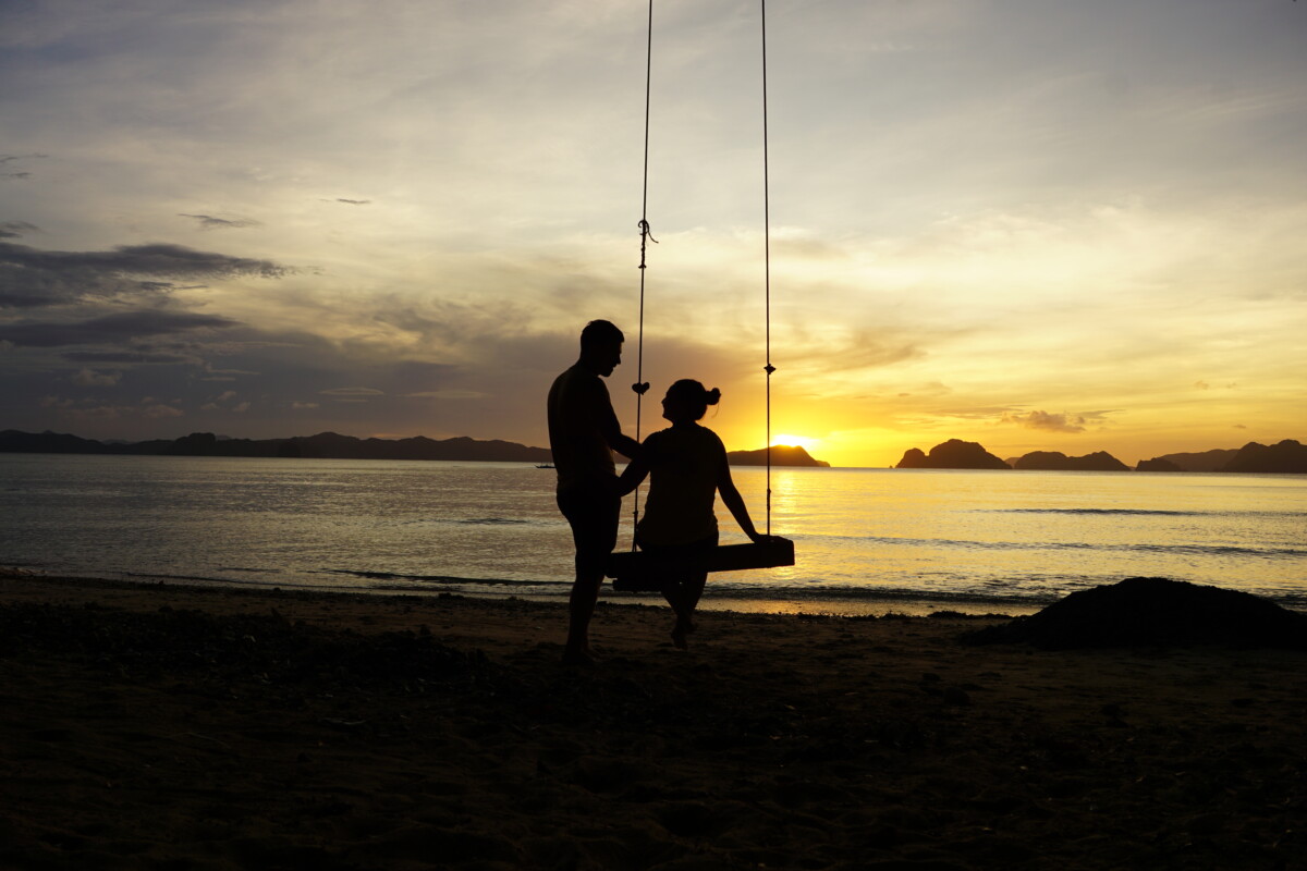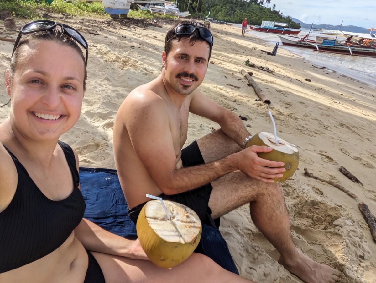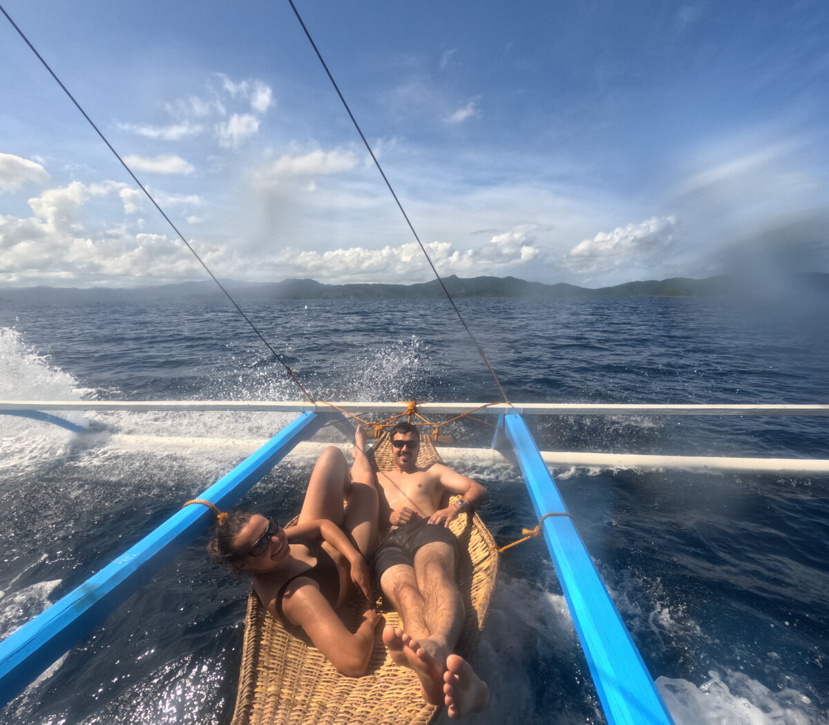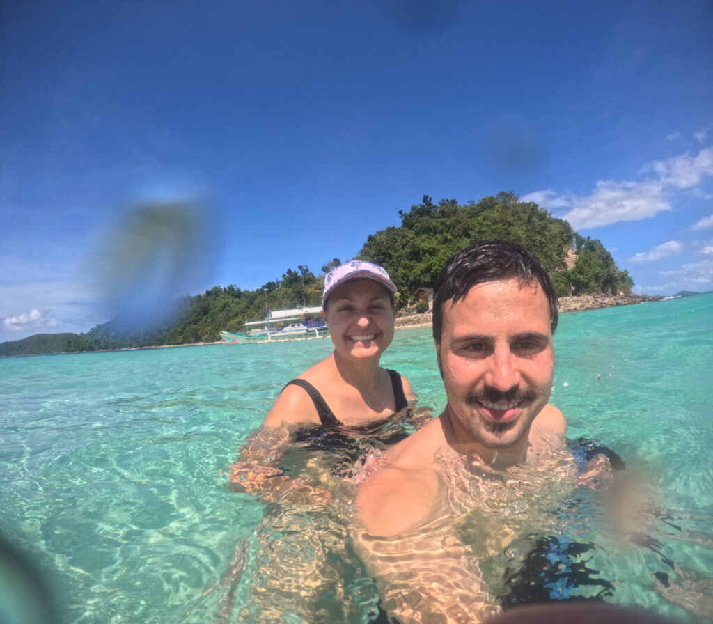 Wir mussten ja nochmal fliegen an diesem Tag, um auf die Insel Palawan zu kommen, deshalb noch ein kurzer Transfer zum anderen Terminal mit dem Bus. Dort angekommen trödelten wir herum und gingen noch gemütlich Eiskaffee trinken, da wir ja vermeintlich noch leicht Zeit hatten. Romana sagte auf einmal, die Durchsage hat wie „Romana“ geklungen, schauen wir vorsichtshalber mal zum Gate. Und tatsächlich, wir wurden gerade zum „Final Call“ aufgerufen, und schafften es gerade noch in den Flieger… Irgendwie hatte sich die Startzeit vom Flug und das Boarding nach vorne verschoben, ohne dass wir es mitbekommen haben. Aber ist ja nochmal gut gegangen.