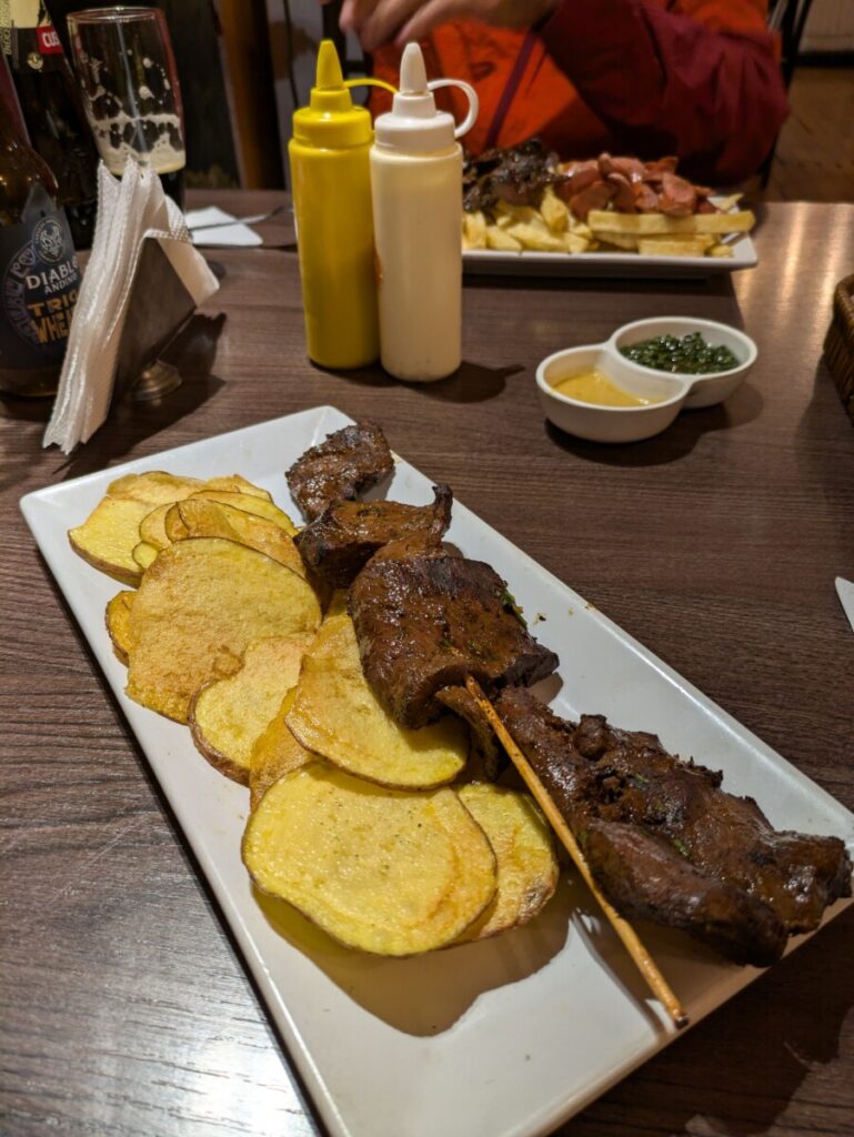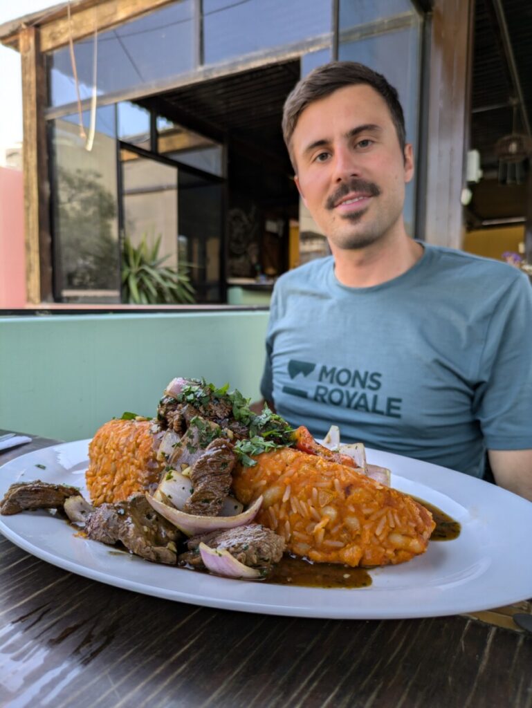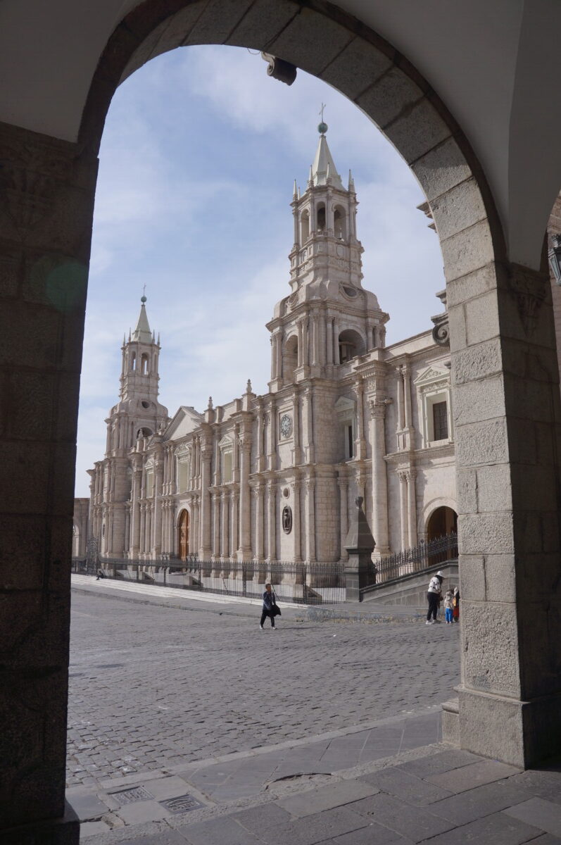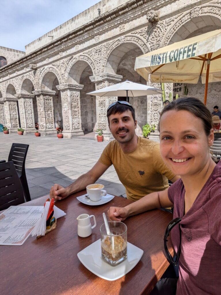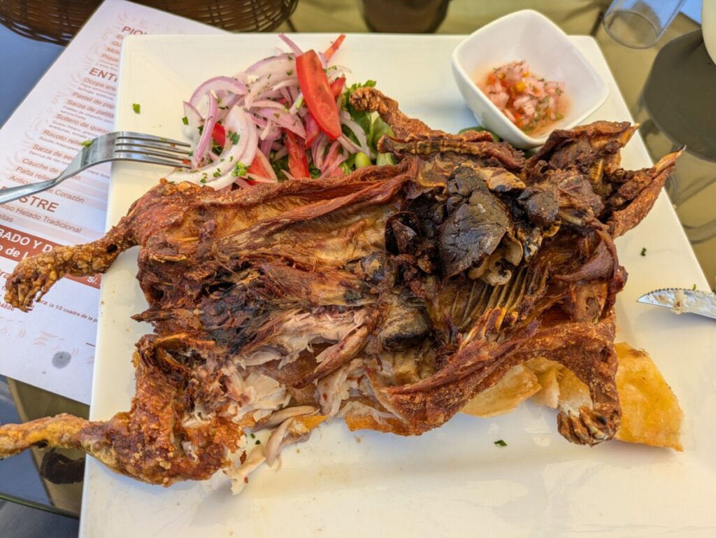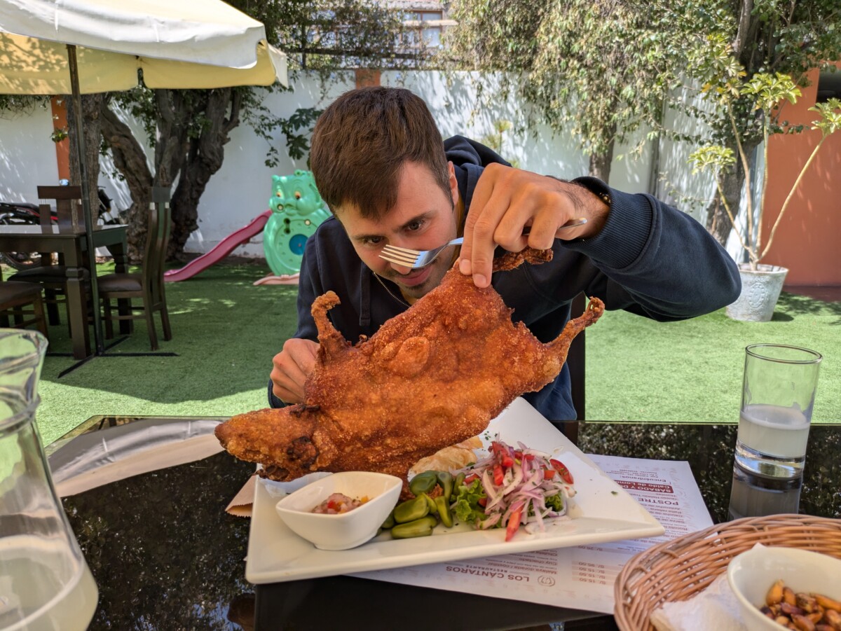 Von Ica ging es mit dem Nachtbus weiter nach Arequipa. Mit 14 Stunden Fahrt wahrscheinlich die längste bis jetzt… Wenigstens durften wir in Arequipa im AirBnb schon vormittags einchecken! Arequipa ist mit 1,2 Millionen Einwohnern die zweitgrößte Stadt Perus und im Gegensatz zu Lima ein wahres Juwel. Unzählige Kirchen, schöne Gebäude, umwerfende Innenhöfe und generell sauber. Natürlich steckte ich Romana mit meinem Schnupfen an und wir rotzen beide bis heute um die Wette 😉 Deswegen ließen wir es in Arequipa ruhiger angehen und konzentrierten uns auf die kulinarische Vielfalt Perus. Habt ihr gewusst, dass die peruanische Küche als eine der besten der Welt gilt und bei internationalen Wettbewerben eine Auszeichnung nach der anderen gewinnt? Gleich am ersten Abend suchten wir uns ein Anticucho-Lokal, denn Anticuchos waren uns stark empfohlen worden – gegrillte Rinderherzen. Wir beide waren überrascht, wie zart die Anticuchos sind! Auch wenn Romana nicht aus dem Häuschen war, mir schmeckten die Spieße “herzhaft” gut. Tags darauf machten wir eine “Food-Tour” mit einem Guide, der uns so viele lokale Spezialitäten besorgte, dass wir am Ende fast platzten. Und dann kam der Tag, an dem wir in einem besseren Restaurant das berühmte südamerikanische Cuy chactado probierten – Meerschweinchen im Ganzen. Mit 60 Soles (15 €) eine teure Delikatesse in Peru. Als das riesige Cuy dann auf einem Teller vor mir lag, inklusive Kopf und manchen Innereien, hatte ich keine Ahnung, wie ich es essen sollte. Ähnlich wie bei einem Hendl ließ sich das Fleisch von den Haxen gut lösen. Es schmeckte auch ähnlich wie Hühnchen, vielleicht etwas fettiger. Ich muss zugeben, irgendwie hatte ich dann doch bald genug davon. Der Anblick der komischen Innereien und der Nagezähne im Maul waren ein herber Dämpfer des kulinarischen Erlebnisses, und auch die ranzige Erdäpfelbeilage trug nicht gerade positiv dazu bei 🤢 Dafür konnte uns der National-Cocktail “Pisco Sour” absolut überzeugen, er liefert sich sogar ein knappes Rennen mit meinem Lieblings-Cocktail Mai Tai.