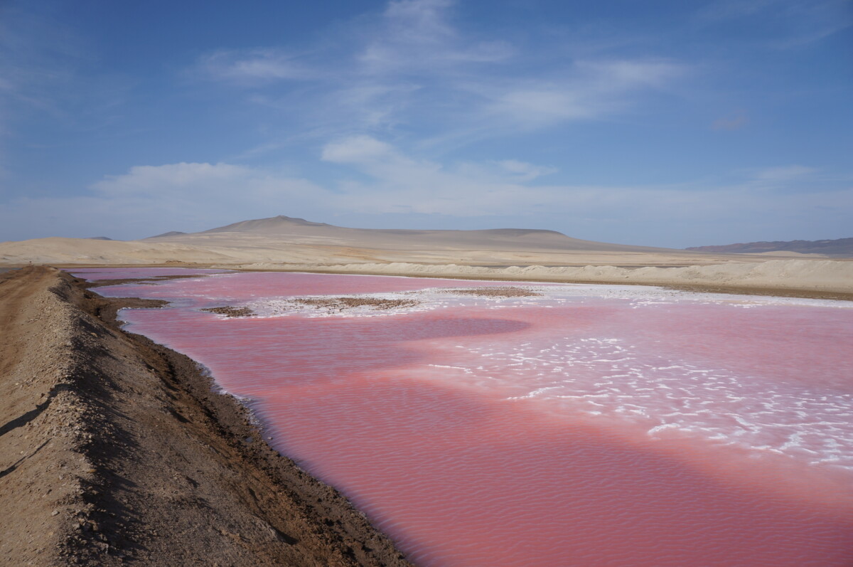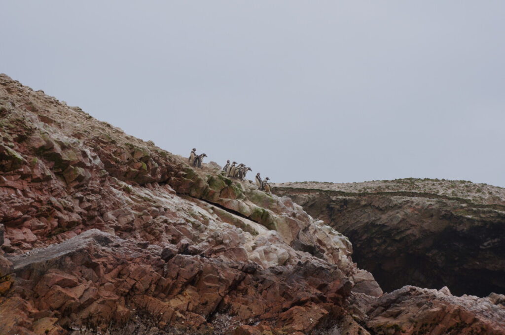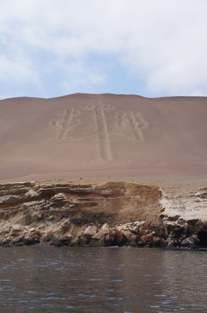 Wie unterschiedlich doch diese Wüstenlandschaft direkt am Meer im Gegensatz zu den Bergen in Huaraz ist! Unser zweiter Stopp war an einem wunderbarem Sandstrand, die Wassertemperatur des Pazifiks betrug aber nur geschätzte 20°C. Weitere tolle Aussichtspunkte folgten, und auch ein pinker Salzsee war dabei, wie wir schon einen in Australien bewundern konnten. Trotz der wüstenartigen, sandigen Umgebung ohne jeglichen Bewuchs war es durch den Wind ziemlich kalt und am späten Nachmittag froren wir trotz Jacke und langer Hose. Am Abend konnte ich der Verlockung nicht widerstehen, nach “Alfredo Paracas” zu googlen, denn ich war nach wie vor misstrauisch gegenüber Alfredo. Gleich der erste Eintrag in Google führte zu einem Beitrag in Facebook, wo sich jemand über Alfredo beschwerte, dass er ein Betrüger sei und Geld abgezockt und nichts geliefert habe. Auch andere sehr zwiespältige Bewertungen fand ich, einige sehr schlechte und andere sehr gute. Ich beschloss für mich, Romana nichts zu sagen, um sie nicht zu verunsichern und den nächsten Tag einfach drauf ankommen zu lassen. Und siehe da, am nächsten Morgen fuhren wir mit 1000 anderen Leuten auch zu den nahegelegen Islas Ballestas, wo wir viele Vögel, Humboldt-Pinguine und Robben beobachten konnten. Eine echte Massenabfertigung diese kurze Tour, aber was soll’s. Auf dem Weg zu den Inseln kommt man an einer beeindruckenden Geoglyphe vorbei, dem Kandelaber von Paracas. Das ist eine 180m große Figur, die an einen Kerzenleuchter erinnert, in den Sandstein gegraben wurde und anscheinend über 2000 Jahre alt ist! Wie ist es möglich, dass nach so langer Zeit diese Linien immer noch sichtbar sind, fragte ich mich. Der Guide am Boot sagte, dass wir uns in einer der trockensten Gegenden des Planeten befinden und die Geoglyphe im Windschatten ist. Sehr beeindruckend!