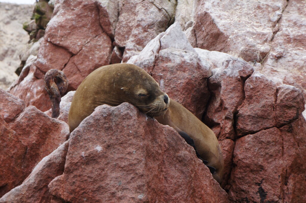Der Rollerverleih morgens klappte dann problemlos und das Gefährt war ein wirklich gutes, neues Modell. Also machten wir uns auf in den Nationalpark, welcher schon kurz außerhalb von Paracas anfing. Nachdem wir die Eintrittsgebühren am Checkpoint bezahlt hatten, kamen wir gleich an beeindruckenden farbigen Dünen vorbei, wo wir natürlich stehenbleiben und raufgehen mussten. Beim Abstieg zurück zum Roller sahen wir aus der Ferne, wie ein Wachmann zu unserem abgestellten Moped ging und etwas in sein Funkgerät sprach. Da dachte ich mir schon, dass wir etwas angestellt hatten, aber wir haben kein Verbotsschild und keine Absperrung gesehen. Hinter dem Hügel befand sich irgendein Museum und die Angestellten müssen uns gesehen haben, wie wir auf die Dünen spaziert sind. Als wir dann bei dem Mann ankamen, textete er uns gleich auf Spanisch zu. Wir verstanden soviel, dass es verboten sei, auf die “cerros de los colores” zu gehen und das Museum nur den eben genannten Dünen gewidmet sei. Sein Chef würde gleich da sein und unsere Personalien aufnehmen… Oje, hoffentlich folgt keine Strafe oder Anzeige, war mein Gedanke. Ich entschuldigte mich mehrmals und stellte mich etwas dumm und dann ließen sie uns auch schon weiterfahren… zum Glück! Ein paar hundert Meter weiter war dann auch ein Verbotsschild zu sehen 😂