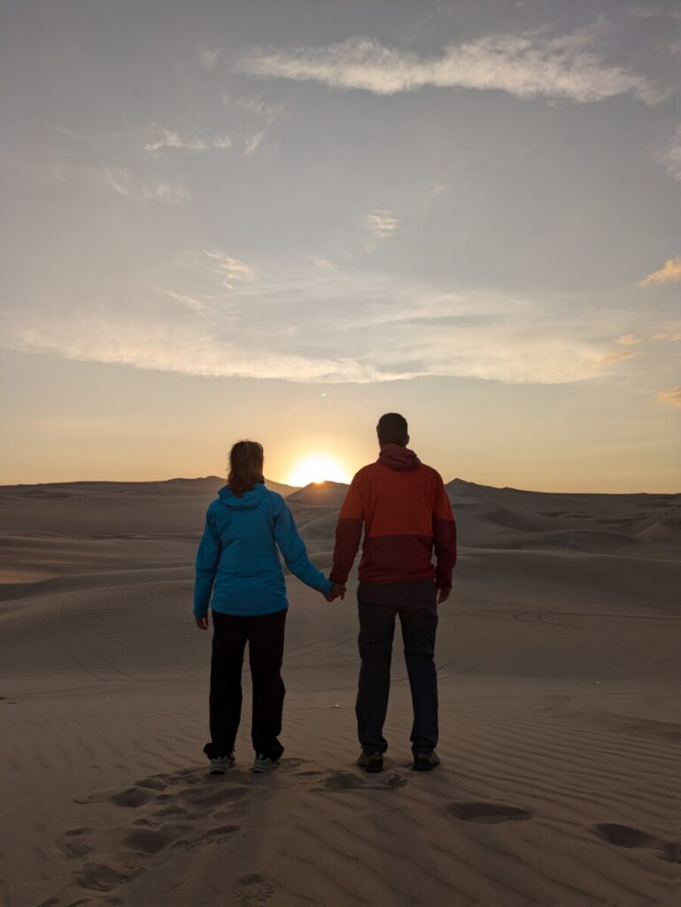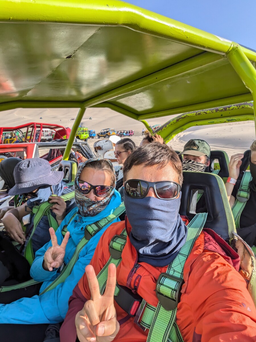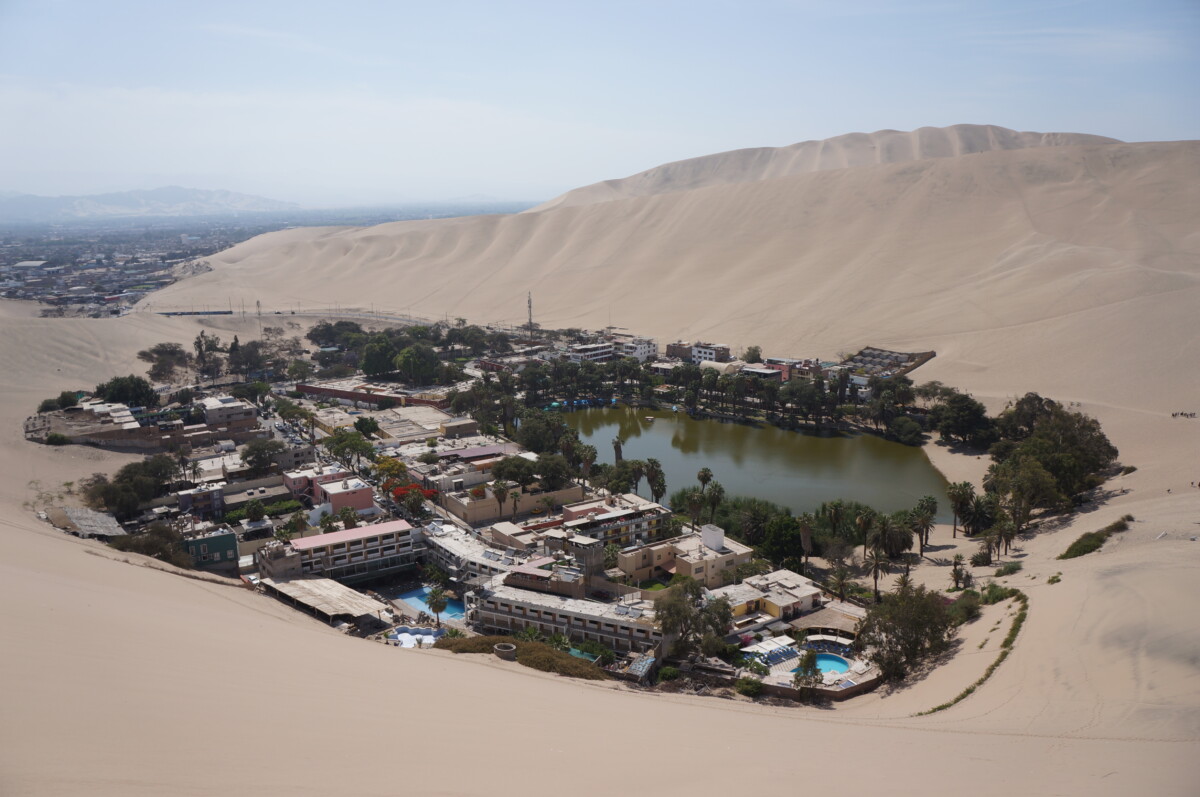 Huacachina ist nur wenige Kilometer von der Stadt Ica entfernt, ist aber umgeben von riesigen Sanddünen und hat in der Mitte einen kleinen See. Der kleine Ort besteht quasi nur aus Hotels, Restaurants und Anbietern von Buggytouren, Sandboarding oder Sandskifahren. Am späteren Nachmittag versammeln sich dann etwas oberhalb der Oase unzählige Touristen, die sich dann von laut dröhnenden Fahrzeugen (“Buggies”) einen wilden Ritt durch die sandige Unendlichkeit erhoffen. Während der spaßigen Fahrt fragte ich mich mehrmals, was wohl die wissenschaftliche Erklärung dazu ist, warum immer nur die Frauen so laut kreischen müssen, wenn es plötzlich rasant wird 😂