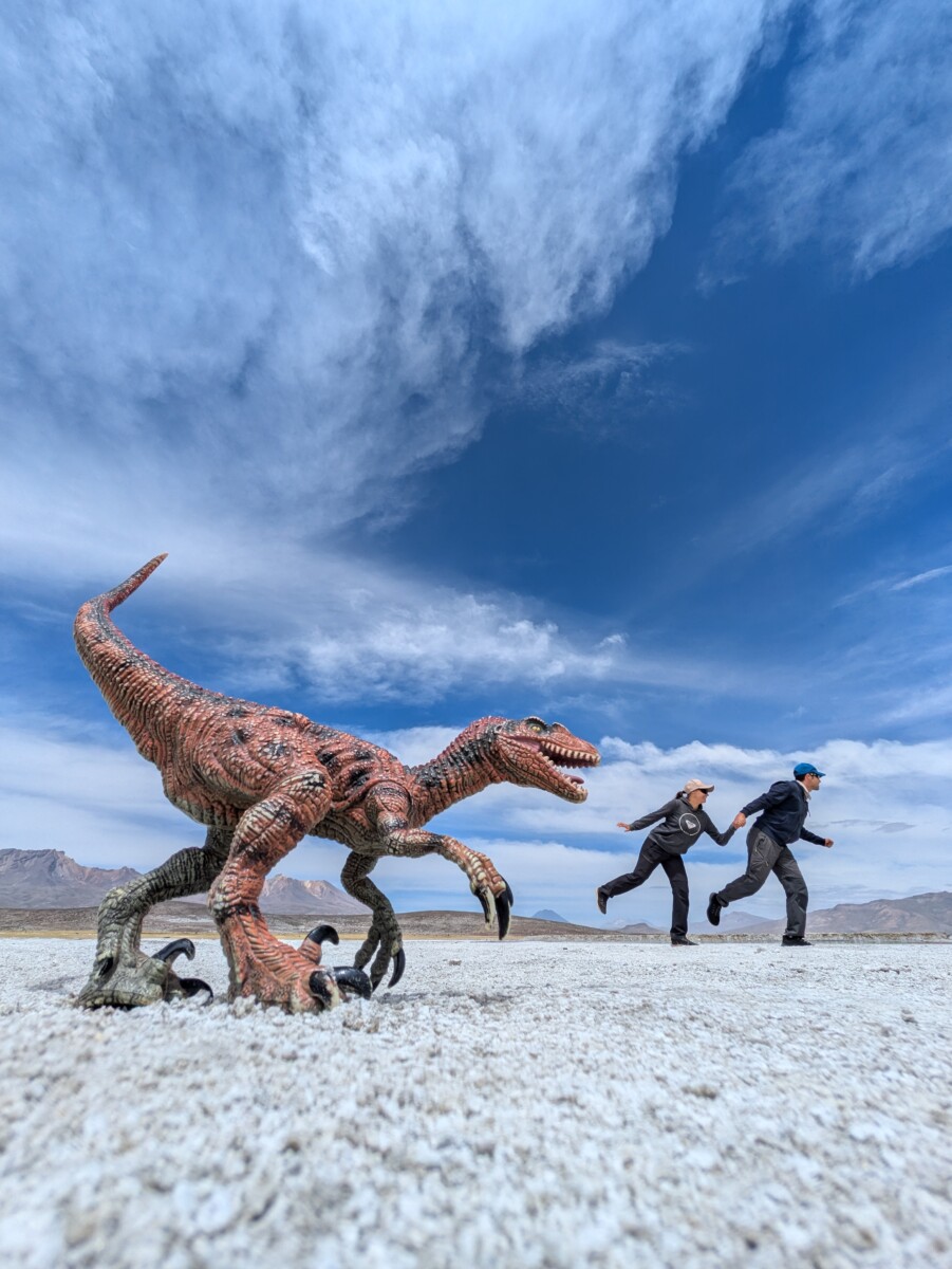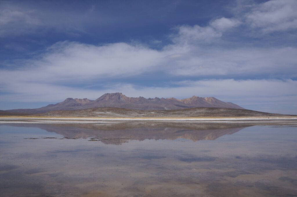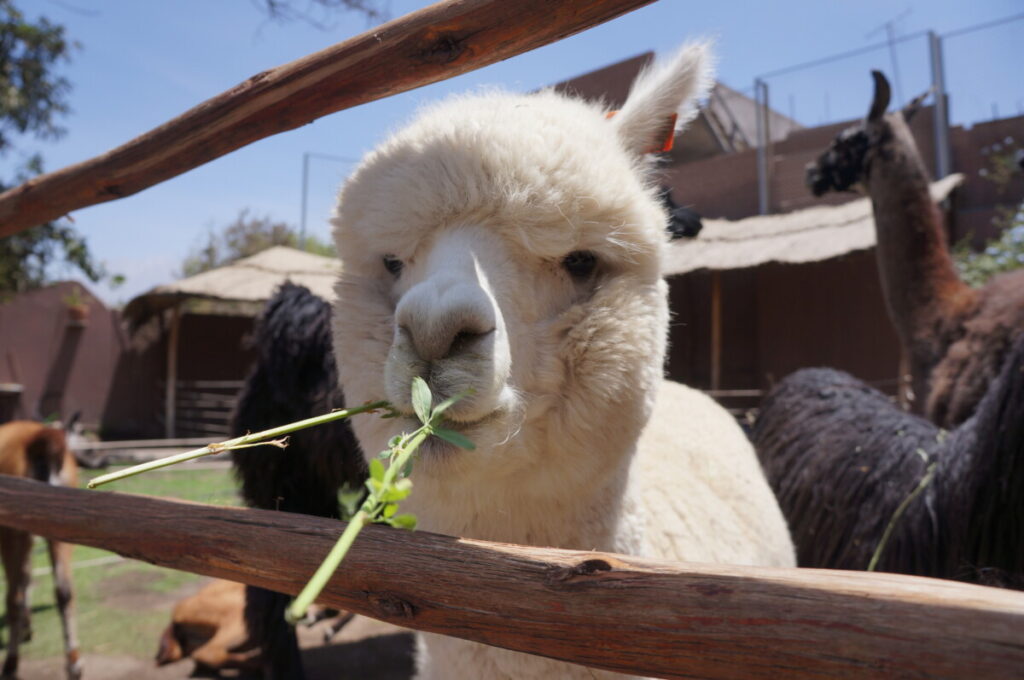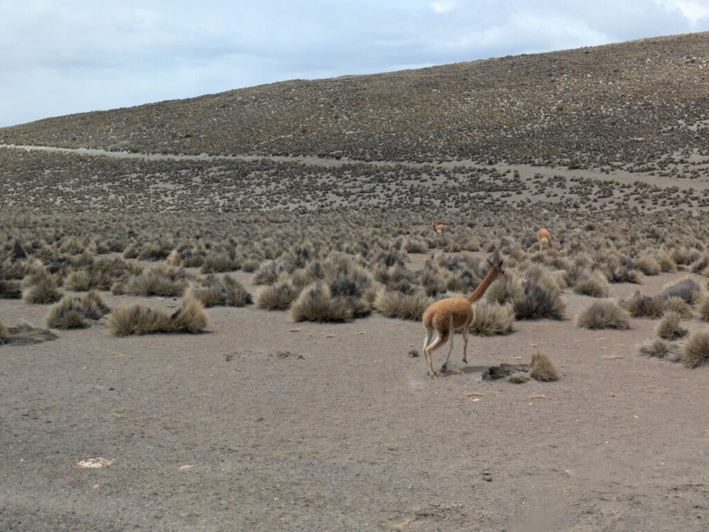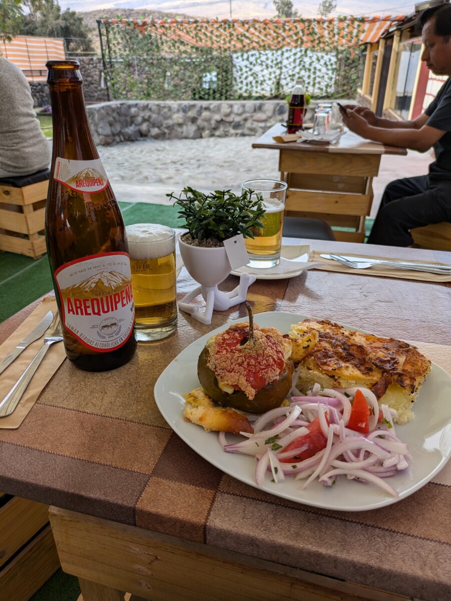 Einen Ausflug von Arequipa aus buchten wir dann doch, nämlich zu den Salinas. Das ist ein Salzsee auf einem Hochplateau, auf dem auch viele Alpakas, Lamas, Vikunjas und Guanakos leben. Erstere zwei sind die domestizierten Varianten der Anden-Kamele und letztere zwei die Wildlebenden. Vor allem die Vikunjas sind sehr klein und zierlich und haben natürlich Romana sofort verzückt. Das Plateau liegt schon wieder auf fast 4500 Meter Seehöhe und die Höhenluft lässt uns wieder schnaufen wie nach einem Marathon. Zum späten Mittagessen bestellte ich ein weiteres landestypisches Gericht, nämlich Rocoto relleno con pastel – Gefüllter scharfer Paprika mit Kartoffelgratin. Ein Gedicht!