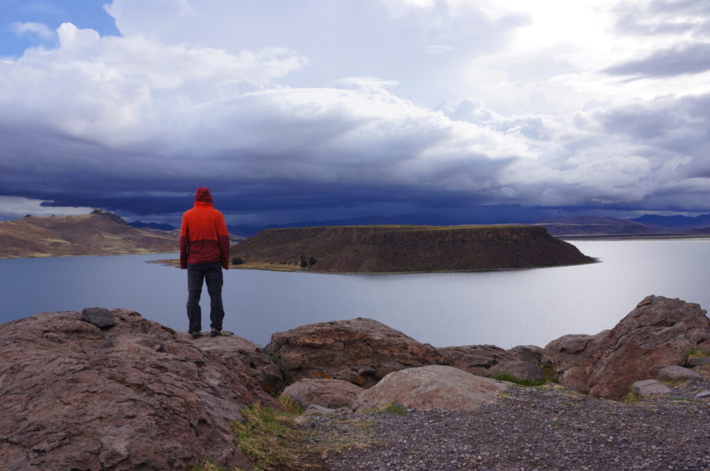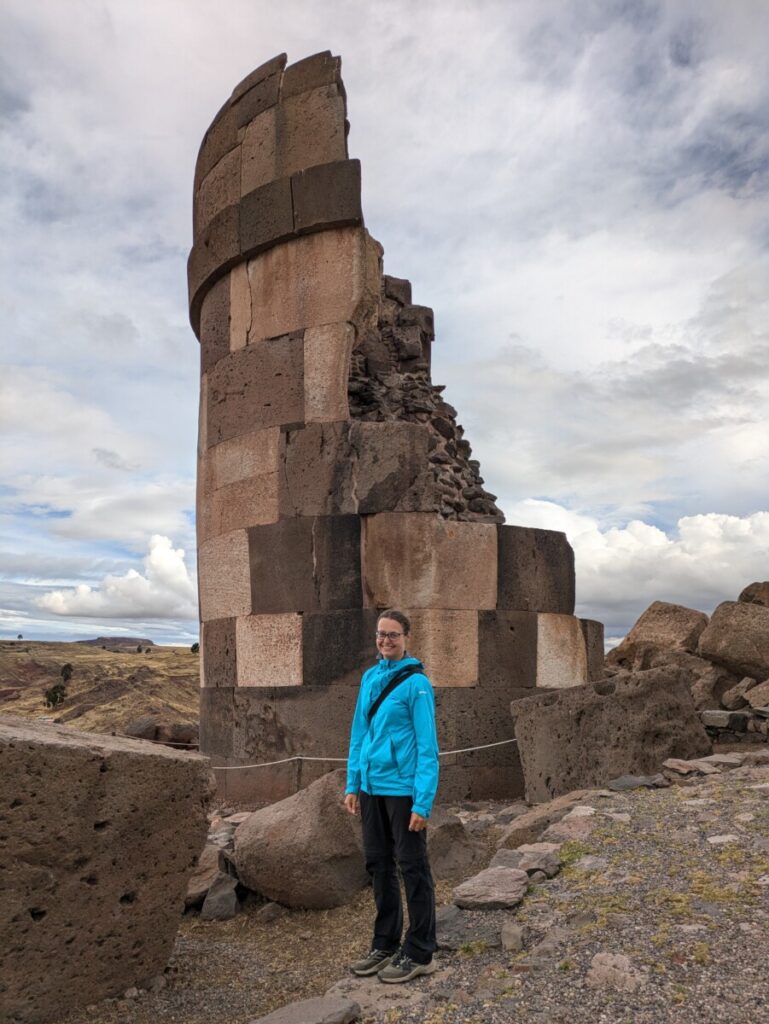 Unser nächster und vorletzter Stopp in Peru war Puno am Titicaca See, welcher als Geburtsstätte der Inka-Kultur gilt. Er liegt auf 3812m und gilt somit als höchstgelegener schiffbarer See der Welt. Außerdem ist er 15-mal so groß wie der Bodensee und damit fast so groß wie Korsika 😯 Ganz spontan buchten wir für den Nachmittag noch eine Tour zu den Chullpas von Sillustani. Das sind interessant gebaute Mausoleen von diversen Kulturen und Epochen. Die Leichname von Königen und anderen illustren Persönlichkeiten wurden in den zylindrischen Gebäuden aus perfekt gehauenen und polierten Steinblöcken bestattet.