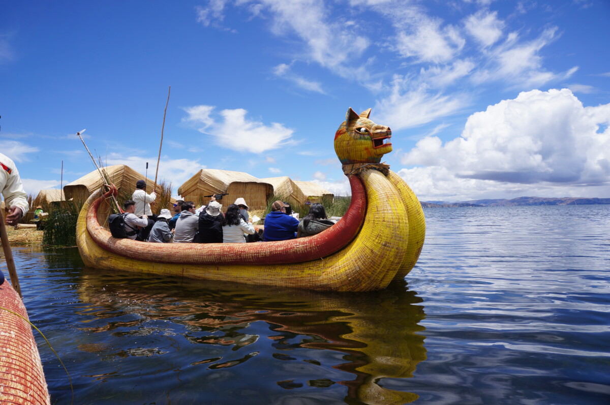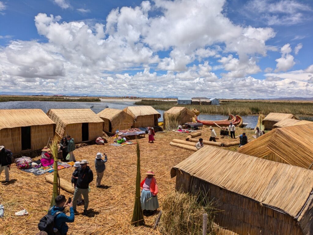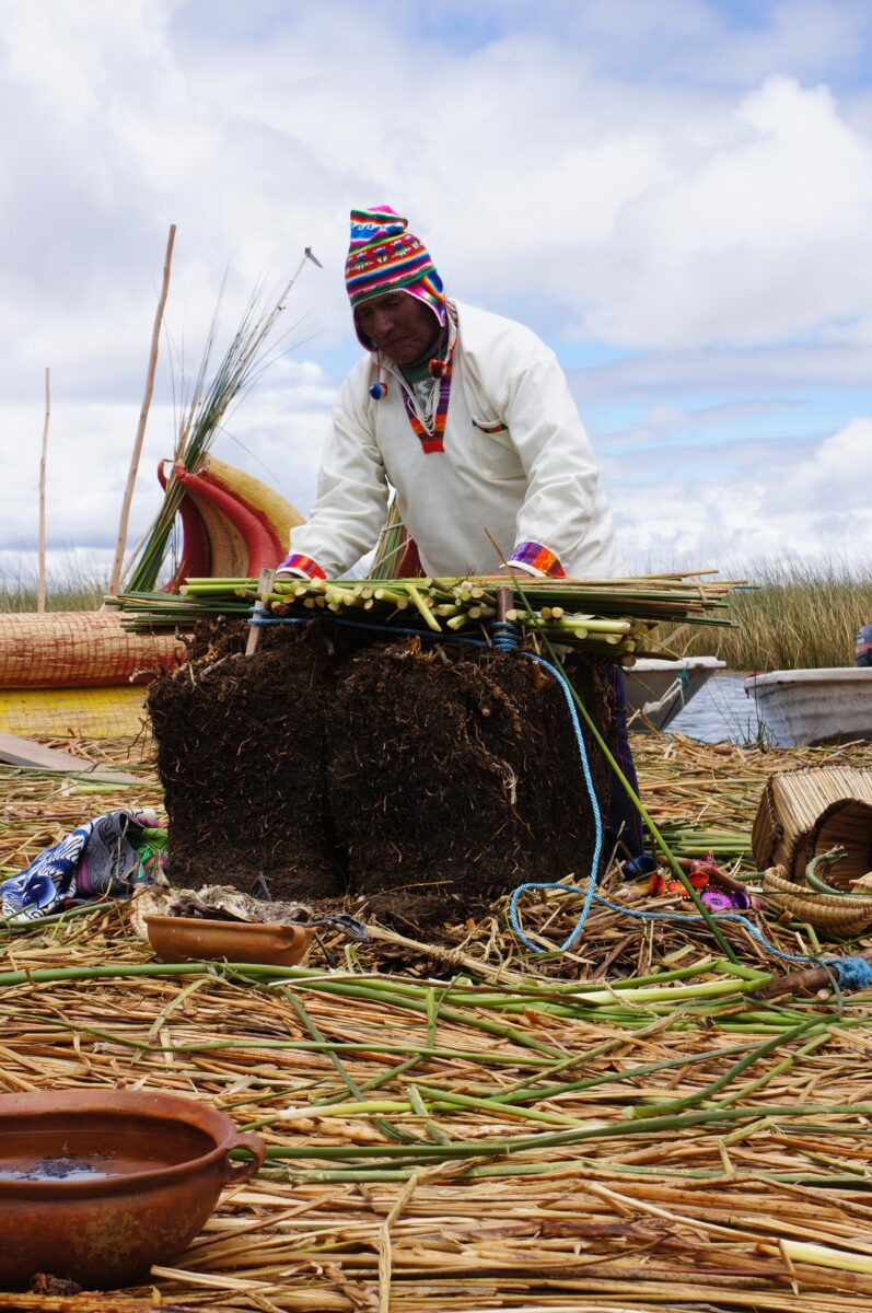 Am Sonntagmorgen wurden wir vor dem Hotel abgeholt und zum Hafen gebracht, denn wir hatten eine zweitägige Tour auf dem Titicaca-See mit Übernachtung bei einer Familie auf der Insel Amantani gebucht. Mit dem langsamsten Boot auf der Welt schipperten wir zuerst zu den schwimmenden Inseln der Uros. Für dieses Volk bildet das Schilf des Sees die Lebensgrundlage, aus dem sie die Inseln und Unterkünfte bauen, ja sogar essen kann man es. Strom gibt es logischerweise keinen auf den winzigen Inseln, die am Grund verankert werden, um nicht vom Wind abgetrieben zu werden. Früher war der Fischfang für die Uros die wichtigste Einnahmequelle, aber heutzutage leben sie quasi nur noch vom Tourismus. Als wir dann an eine nur etwa 30×30 Meter große Insel mit 6 aus Schilfrohr gebauten Hütten andockten, fühlten wir uns zwei Jahrhunderte zurückversetzt. Der Inselälteste demonstrierte uns eindrucksvoll an einem Modell, wie die Inseln aufgebaut werden. Es muss ein sehr beengendes Leben sein auf diesen Mini-Inseln… aber viele Uro-Familien leben heute auf dem Festland und pendeln mit Booten hin und her.