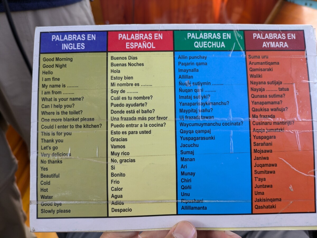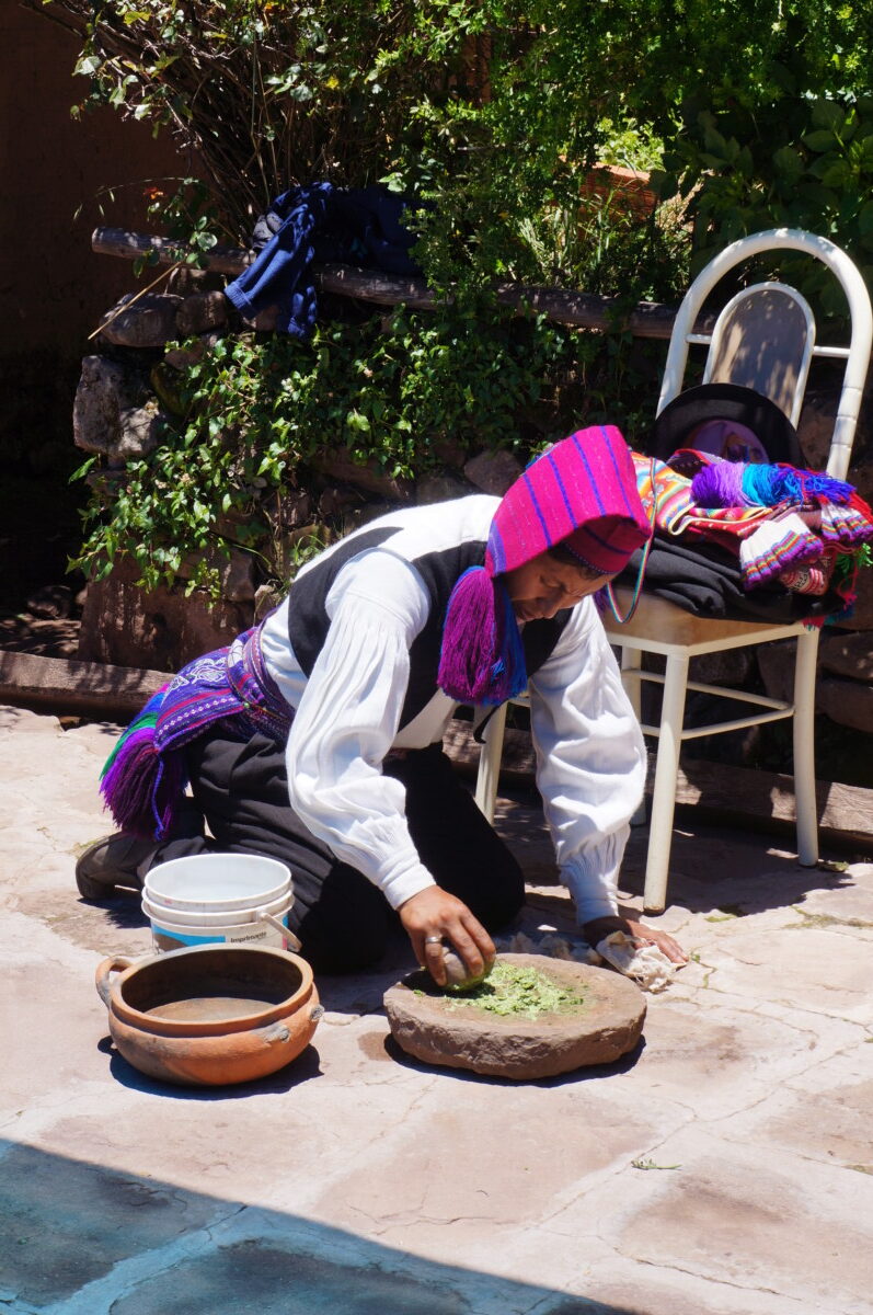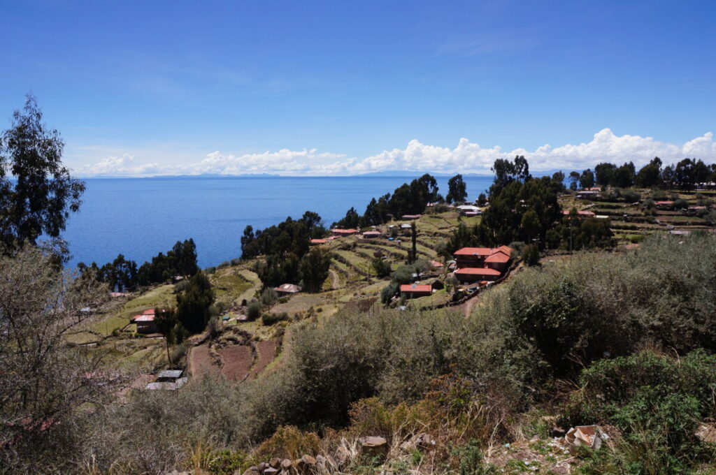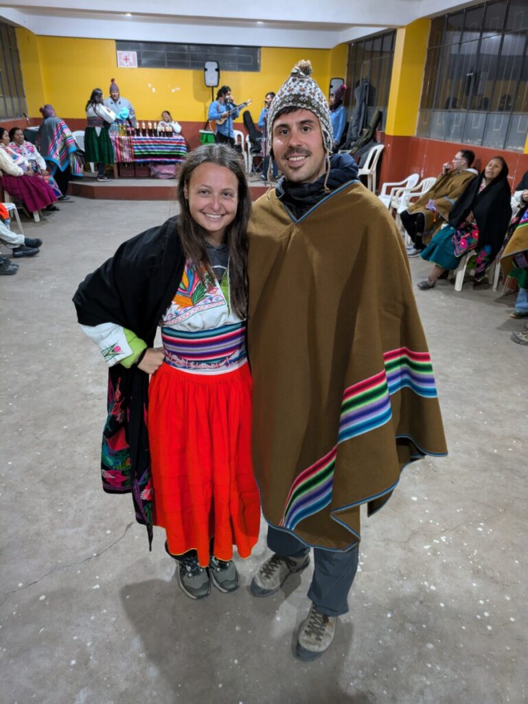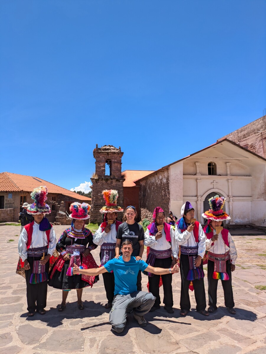 Nach einer kurzen Bootsfahrt mit einem traditionellen Schilfboot ging es weiter zur Insel Amanti, auf der wir dann übernachteten. Hier wird wieder Quechua gesprochen, aber in der Schule lernen sie Spanisch. Auch hier scheint das Leben stehengeblieben zu sein, alle Bewohner tragen noch ihre Tracht und die meisten Häuser bestehen aus einfachen, selbstgebrannten Ziegeln. Wir hatten eine der modernsten Unterkünfte, ein einfaches Privatzimmer und das Klo hatte sogar fließend Wasser. Die Verpflegung war rein vegetarisch, was uns aber nicht störte, da wir sowieso sehr fleischlastig reisen. Es gab immer eine Suppe, entweder aus Maisgries oder Quinoa und dann Kartoffeln und Gemüse mit Reis. Abends wurden dann alle Touristen auf der Insel in ein traditionelles Gewand gesteckt und zum Tanzen aufgefordert 😂