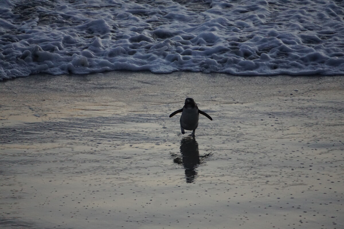 Nach einer kurzen, lustig gemachten Einführung ging es runter zur Pinguin-Beobachtungsplattform am Strand. Nach Sonnenuntergang kommen die kleinen Schwimmvögel vom offenen Meer zurück und ziehen sich in ihre Nester zurück. Nach ein paar Minuten hüpfte auch schon der erste Kamerad aus dem Wasser und watschelte ganz in Pinguin-Manier an unserer Plattform vorbei, ohne sich von den Leuten stören zu lassen. Es dauerte noch eine ganze Weile, bis dann die nächsten Gruppen ankamen und Entzücken bei den Zuschauern auslösten. Es war wirklich lustig – ein Kleiner hatte immer mit einer kleinen Welle zu kämpfen, die ihn mehrere Male umschmiss und wieder ins Wasser zurückzog. Nach diesem Spektakel konnte Romana besonders gut schlafen, jetzt da wir endlich Pinguine in freier Natur gesehen hatten!