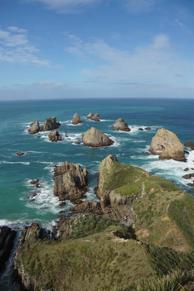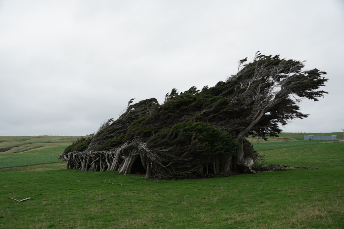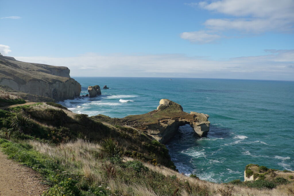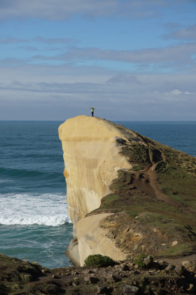 Wir sind dem Südpol sogar noch 7 km näher gekommen als in Bluff, nämlich am südlichsten Punkt der Südinsel, dem Slope Point (nur noch 4803 km 😉). Von dort ging es zur Curio Bay, die einerseits für den „Versteinerten Wald“ und andererseits für eine Kolonie der seltensten Pinguinart, den Gelbaugenpinguinen, bekannt ist. Nachdem wir leider keine Exemplare davon am Strand entdecken konnten, begeisterten uns dafür die versteinerten Baumstämme. Durch eine Ascheschicht eines Vulkanausbruchs und einen Prozess namens Verkieselung wurden hier ganze Bäume zu Stein, man kann sogar die Jahresringe auf den Überbleibseln am Strand sehen! Sehr interessant das Ganze, wieder was dazugelernt!