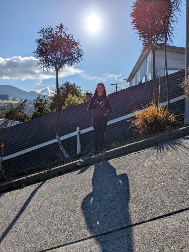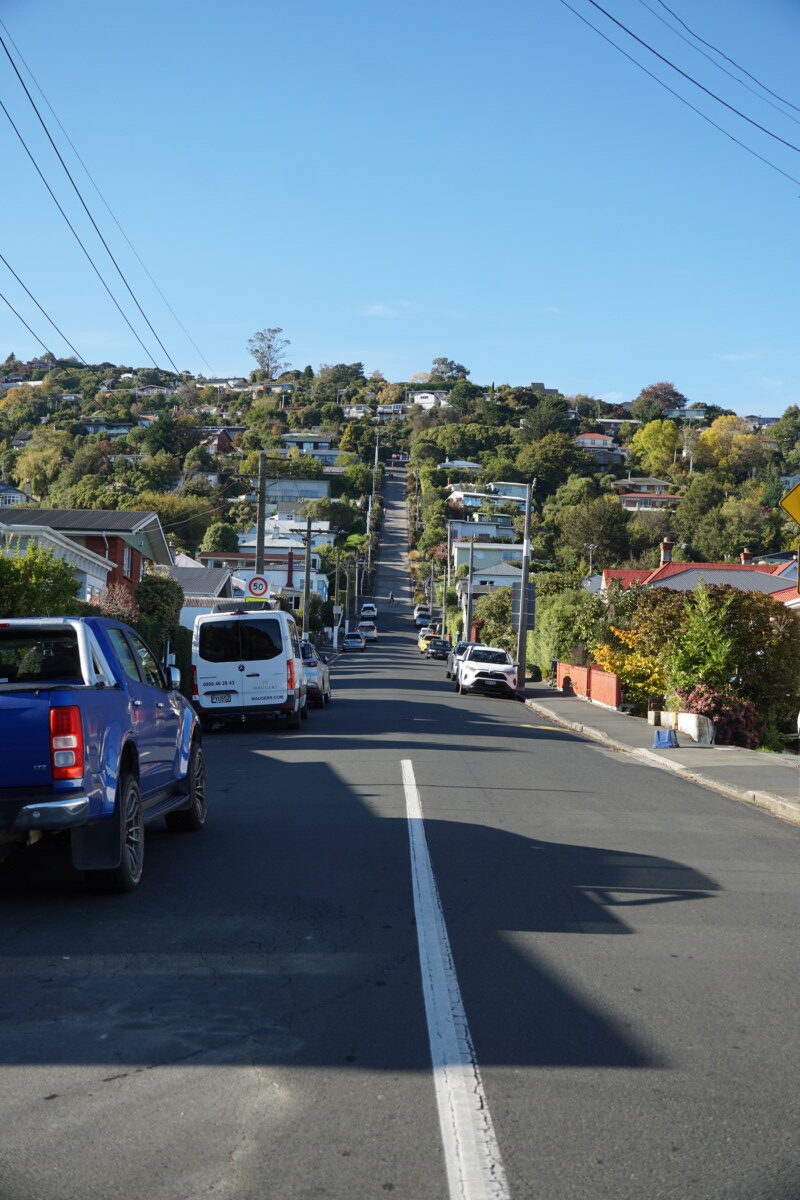 Dafür buchten wir für den nächsten Tag die Pinguin-Tour auf der Otago-Halbinsel, bei der man die kleinste Pinguinart der Welt in freier Wildbahn sehen kann. Aber zuvor noch fuhren wir zur steilsten Wohnstraße der Welt, der berüchtigten Baldwin Street. Zuerst gingen wir die 19° oder 35% steile Straße zu Fuß hoch, dann ließen wir nochmal Sigrid schnaufen. Speziell im oberen Teil ist die Straße wirklich unglaublich steil (auf 2.86 Meter in der Horizontalen 1 m Steigung), beim Hochfahren sieht man nur noch den Himmel und die Elektronik unseres Automatik-Autos war definitiv überfordert, da wir zuerst trotz Vollgases den Hügel emporkrochen 😂 Bergab war es dann leichter!