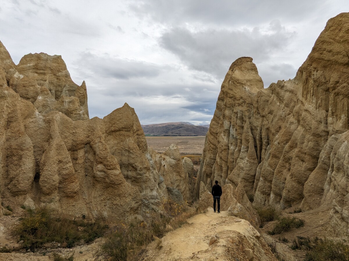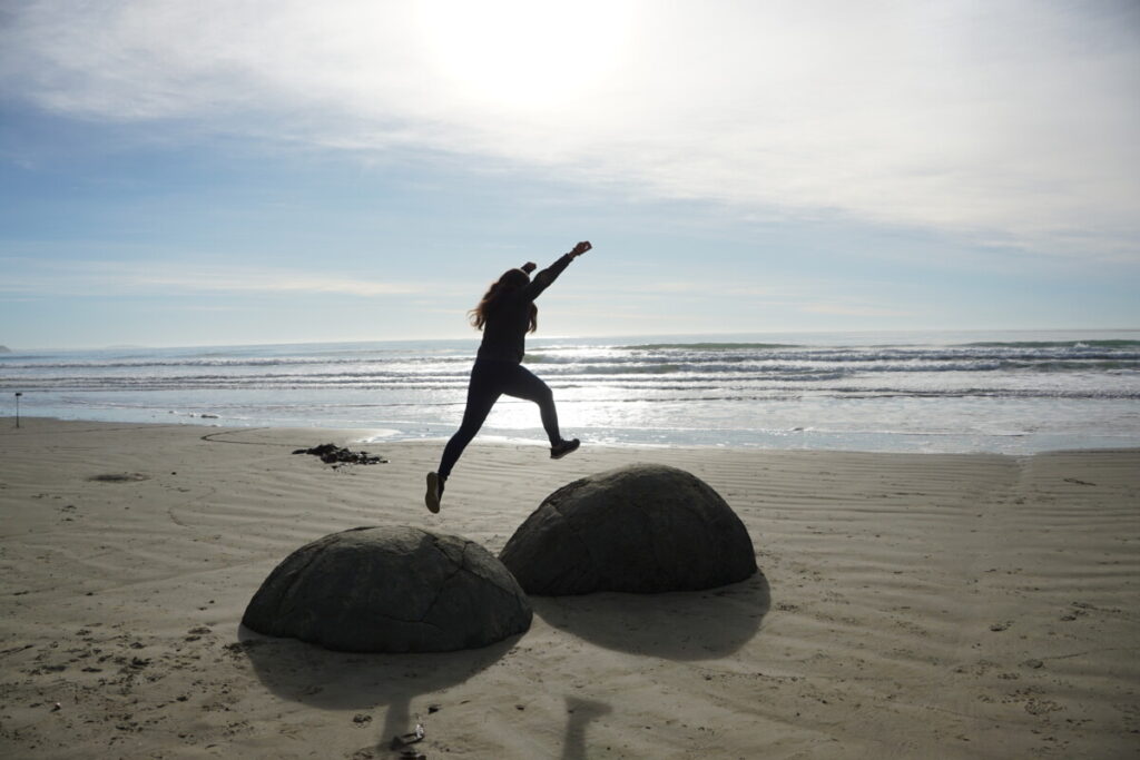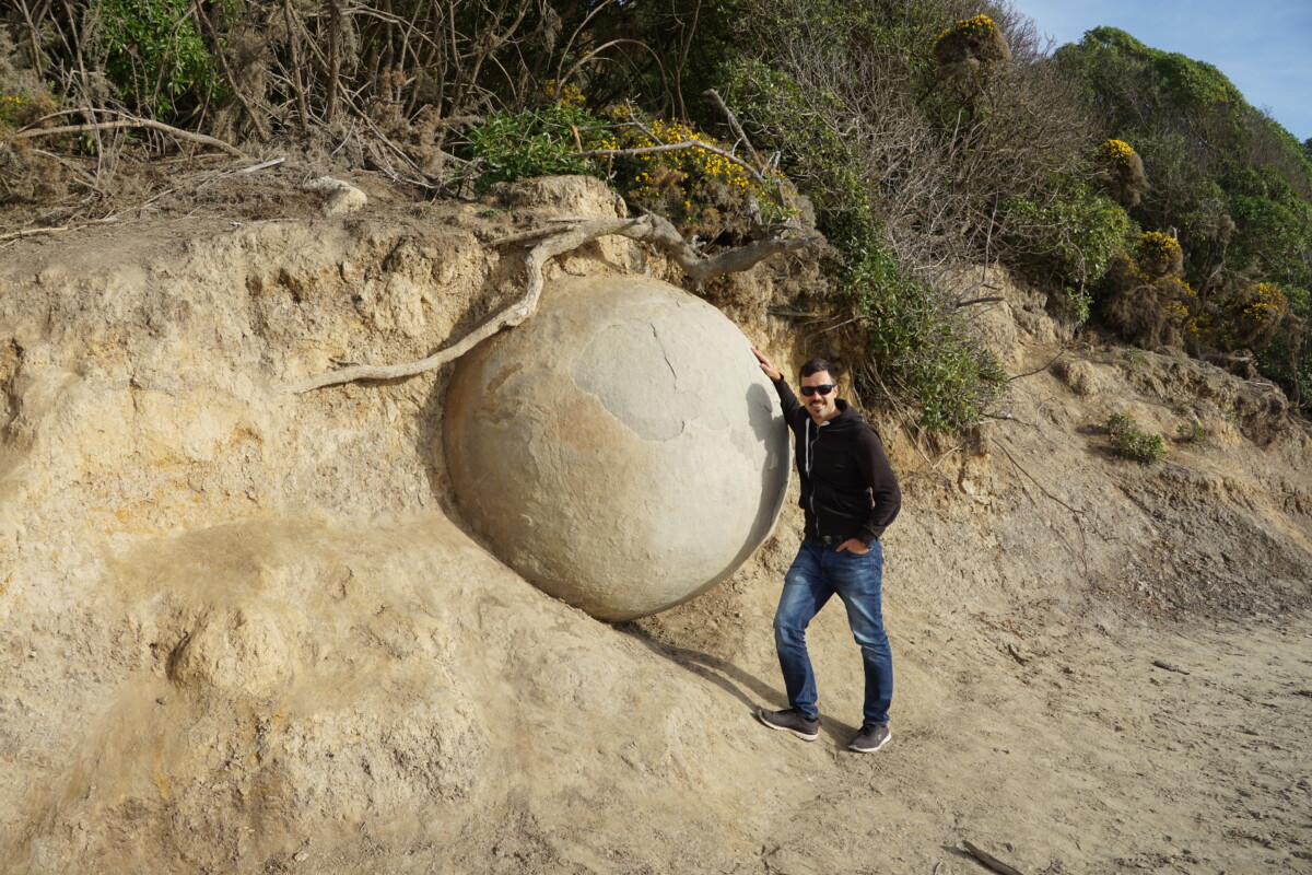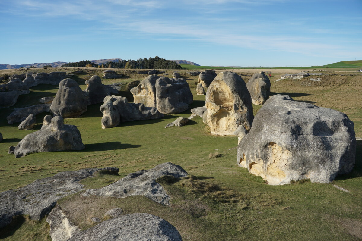 Beschwingt und glücklich, dass wir Sigrid „losgeworden“ sind, fuhren wir noch am selben Abend weiter nach Moeraki, wo wir am darauffolgenden Morgen die kugelrunden Moeraki Boulders am Strand besichtigten. Fast noch interessanter zum Anschauen dort waren die asiatischen Busgruppen, wie sie vor ihren Kameras posierten und herumturnten, um das perfekte Foto mit dieser geologischen Absonderheit zu bekommen. Und schon ging es weiter zu den nächsten Steinen, nämlich den Elephant Rocks. Erosion hat hier dem ehemaligen Meeresboden zugesetzt und riesige, graue „Elefanten“ hinterlassen. Wie gesagt, es war eine „steinige“ Woche, denn am nächsten Tag fuhren wir noch die lange Schotterstraße bis zu den Clay Cliffs, den Tonklippen. Nach diesen sehenswerten Sandstein-Türmen hatten wir dann aber auch mal genug von Steinen, Felsen, Rocks, Boulders, Klippen, … Wir übernachteten bei einem wunderschönen Platz direkt am Lake Ohau, einzig die Sandfliegen waren hier wieder lästig.