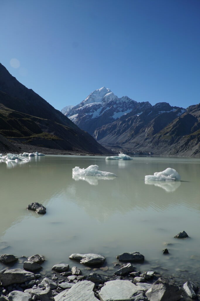 Gestern war das Wetter dann wolkenlos, perfekt um sich den höchsten Berg Neuseelands, den Mt. Cook, noch von der anderen Seite her anzuschauen. Durch das ewig lange und unbesiedelte Tal ging es vorbei am Lake Pukaki bis knapp unter die Gletscher. Einen weitaus besseren Blick auf die Berg- und Gletscherwelt als von der Westküste her hat man hier, denken wir uns. Das schöne Wetter lockt noch viele andere Touristen hierher, sodass die riesigen Parkplätze schon um die Mittagszeit voll sind. Die 10 km lange, flache Wanderung durch das Hooker Valley ist auch wirklich atemberaubend, auch wenn uns fast zu viel los ist hier, eine moderne Völkerwanderung sozusagen. Das Wetter und die Blicke auf die weißen Gipfel und die schwimmenden Eisbrocken in den milchigen Gletscherseen entschädigen für die rücksichtslosen asiatischen „Wanderer“ (wir vermuten Chinesen), die immer die ganze Wegbreite für sich beanspruchen…